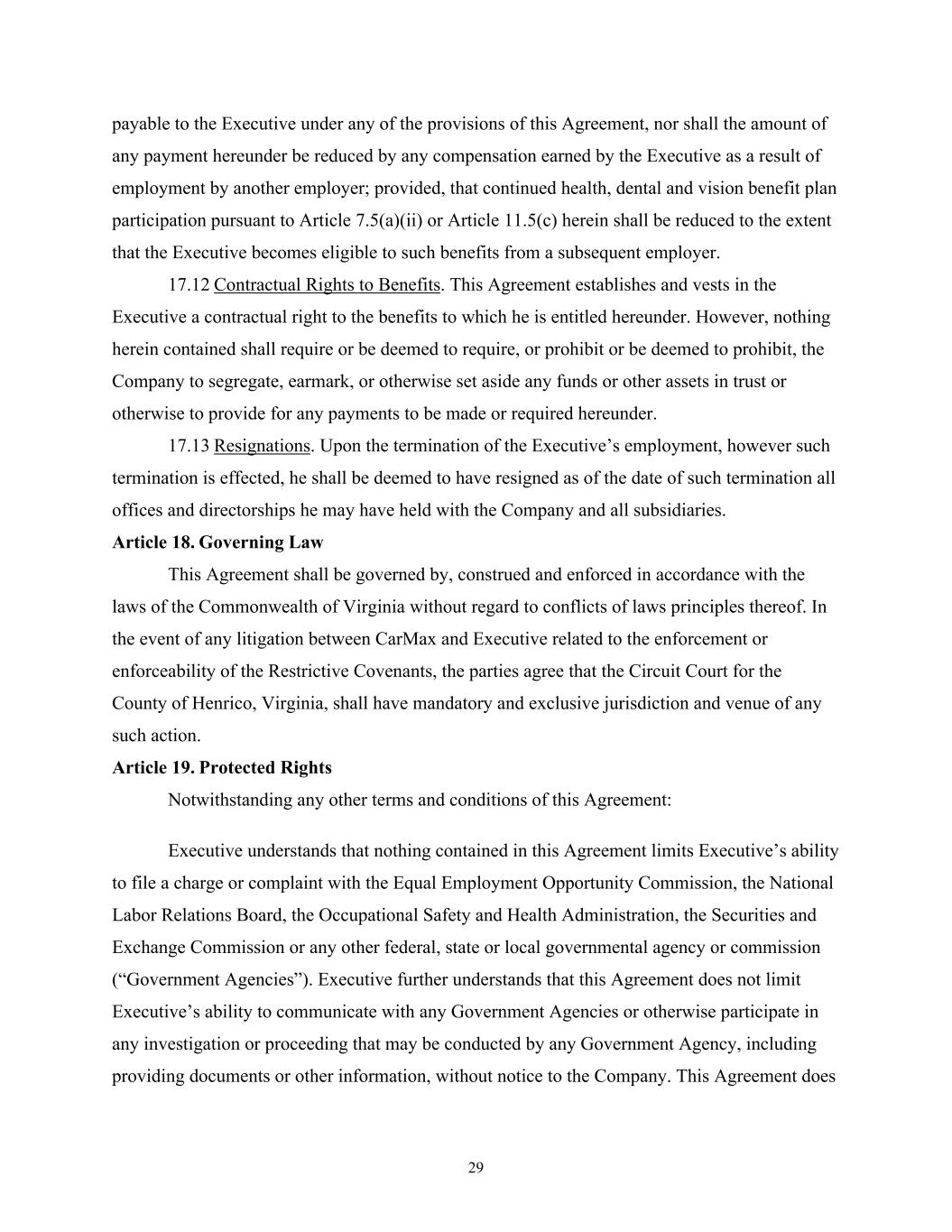 29 payable to the Executive under any of the provisions of this Agreement, nor shall the amount of any payment hereunder be reduced by any compensation earned by the Executive as a result of employment by another employer; provided, that continued health, dental and vision benefit plan participation pursuant to Article 7.5(a)(ii) or Article 11.5(c) herein shall be reduced to the extent that the Executive becomes eligible to such benefits from a subsequent employer. 17.12 Contractual Rights to Benefits. This Agreement establishes and vests in the Executive a contractual right to the benefits to which he is entitled hereunder. However, nothing herein contained shall require or be deemed to require, or prohibit or be deemed to prohibit, the Company to segregate, earmark, or otherwise set aside any funds or other assets in trust or otherwise to provide for any payments to be made or required hereunder. 17.13 Resignations. Upon the termination of the Executive’s employment, however such termination is effected, he shall be deemed to have resigned as of the date of such termination all offices and directorships he may have held with the Company and all subsidiaries. Article 18. Governing Law This Agreement shall be governed by, construed and enforced in accordance with the laws of the Commonwealth of Virginia without regard to conflicts of laws principles thereof. In the event of any litigation between CarMax and Executive related to the enforcement or enforceability of the Restrictive Covenants, the parties agree that the Circuit Court for the County of Henrico, Virginia, shall have mandatory and exclusive jurisdiction and venue of any such action. Article 19. Protected Rights Notwithstanding any other terms and conditions of this Agreement: Executive understands that nothing contained in this Agreement limits Executive’s ability to file a charge or complaint with the Equal Employment Opportunity Commission, the National Labor Relations Board, the Occupational Safety and Health Administration, the Securities and Exchange Commission or any other federal, state or local governmental agency or commission (“Government Agencies”). Executive further understands that this Agreement does not limit Executive’s ability to communicate with any Government Agencies or otherwise participate in any investigation or proceeding that may be conducted by any Government Agency, including providing documents or other information, without notice to the Company. This Agreement does