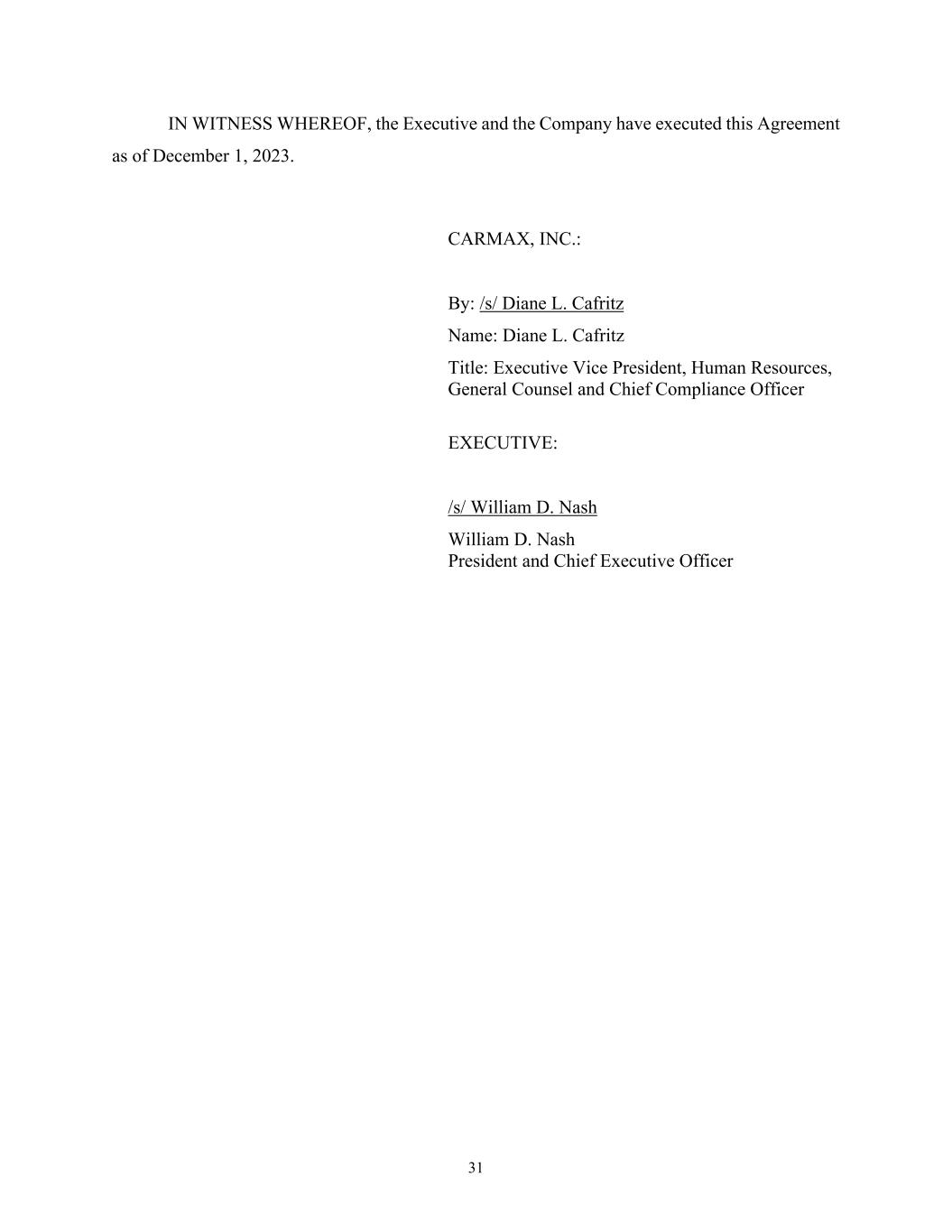 31 IN WITNESS WHEREOF, the Executive and the Company have executed this Agreement as of December 1, 2023. CARMAX, INC.: By: /s/ Diane L. Cafritz Name: Diane L. Cafritz Title: Executive Vice President, Human Resources, General Counsel and Chief Compliance Officer EXECUTIVE: /s/ William D. Nash William D. Nash President and Chief Executive Officer