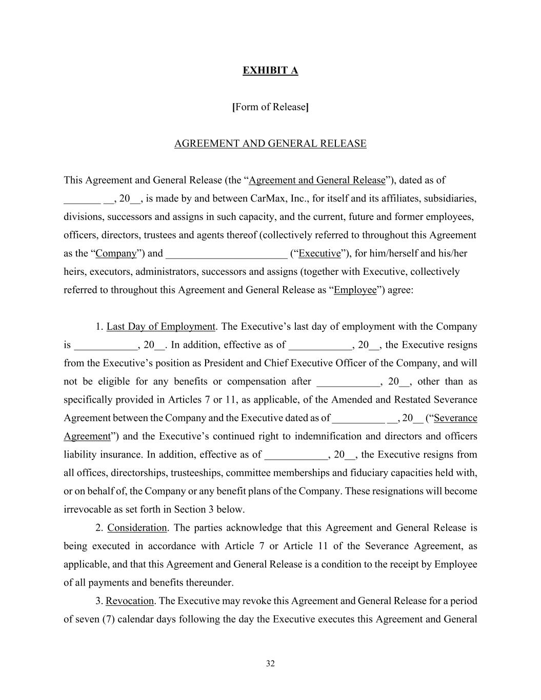 32 EXHIBIT A [Form of Release] AGREEMENT AND GENERAL RELEASE This Agreement and General Release (the “Agreement and General Release”), dated as of _______ __, 20__, is made by and between CarMax, Inc., for itself and its affiliates, subsidiaries, divisions, successors and assigns in such capacity, and the current, future and former employees, officers, directors, trustees and agents thereof (collectively referred to throughout this Agreement as the “Company”) and _______________________ (“Executive”), for him/herself and his/her heirs, executors, administrators, successors and assigns (together with Executive, collectively referred to throughout this Agreement and General Release as “Employee”) agree: 1. Last Day of Employment. The Executive’s last day of employment with the Company is ____________, 20__. In addition, effective as of ____________, 20__, the Executive resigns from the Executive’s position as President and Chief Executive Officer of the Company, and will not be eligible for any benefits or compensation after ____________, 20__, other than as specifically provided in Articles 7 or 11, as applicable, of the Amended and Restated Severance Agreement between the Company and the Executive dated as of __________ __, 20__ (“Severance Agreement”) and the Executive’s continued right to indemnification and directors and officers liability insurance. In addition, effective as of ____________, 20__, the Executive resigns from all offices, directorships, trusteeships, committee memberships and fiduciary capacities held with, or on behalf of, the Company or any benefit plans of the Company. These resignations will become irrevocable as set forth in Section 3 below. 2. Consideration. The parties acknowledge that this Agreement and General Release is being executed in accordance with Article 7 or Article 11 of the Severance Agreement, as applicable, and that this Agreement and General Release is a condition to the receipt by Employee of all payments and benefits thereunder. 3. Revocation. The Executive may revoke this Agreement and General Release for a period of seven (7) calendar days following the day the Executive executes this Agreement and General