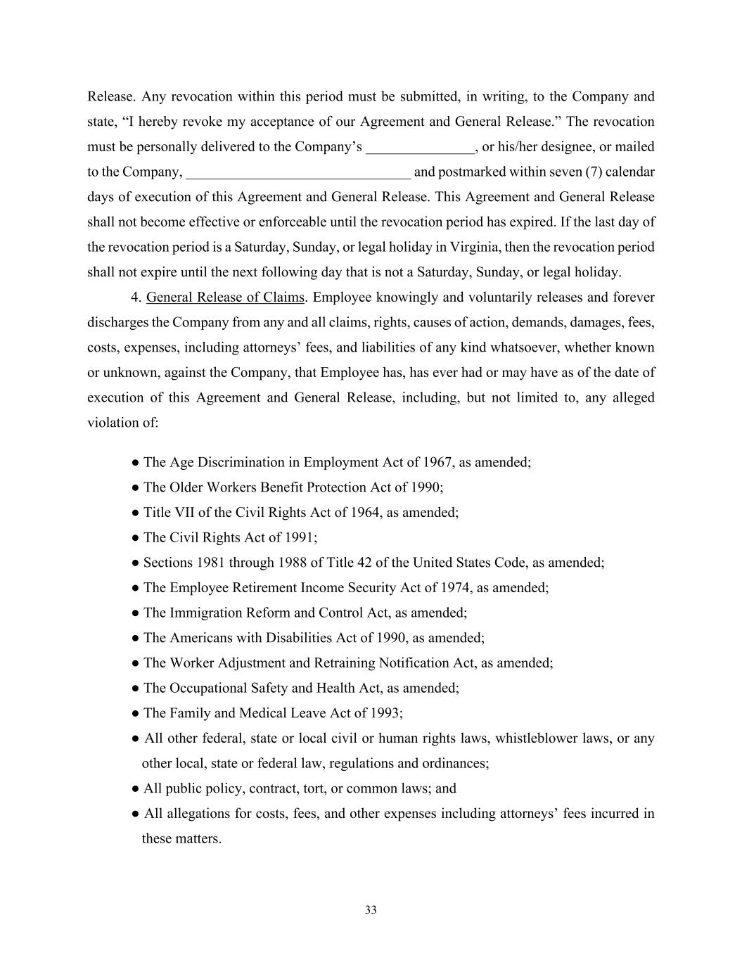 33 Release. Any revocation within this period must be submitted, in writing, to the Company and state, “I hereby revoke my acceptance of our Agreement and General Release.” The revocation must be personally delivered to the Company’s _______________, or his/her designee, or mailed to the Company, _______________________________ and postmarked within seven (7) calendar days of execution of this Agreement and General Release. This Agreement and General Release shall not become effective or enforceable until the revocation period has expired. If the last day of the revocation period is a Saturday, Sunday, or legal holiday in Virginia, then the revocation period shall not expire until the next following day that is not a Saturday, Sunday, or legal holiday. 4. General Release of Claims. Employee knowingly and voluntarily releases and forever discharges the Company from any and all claims, rights, causes of action, demands, damages, fees, costs, expenses, including attorneys’ fees, and liabilities of any kind whatsoever, whether known or unknown, against the Company, that Employee has, has ever had or may have as of the date of execution of this Agreement and General Release, including, but not limited to, any alleged violation of: ● The Age Discrimination in Employment Act of 1967, as amended; ● The Older Workers Benefit Protection Act of 1990; ● Title VII of the Civil Rights Act of 1964, as amended; ● The Civil Rights Act of 1991; ● Sections 1981 through 1988 of Title 42 of the United States Code, as amended; ● The Employee Retirement Income Security Act of 1974, as amended; ● The Immigration Reform and Control Act, as amended; ● The Americans with Disabilities Act of 1990, as amended; ● The Worker Adjustment and Retraining Notification Act, as amended; ● The Occupational Safety and Health Act, as amended; ● The Family and Medical Leave Act of 1993; ● All other federal, state or local civil or human rights laws, whistleblower laws, or any other local, state or federal law, regulations and ordinances; ● All public policy, contract, tort, or common laws; and ● All allegations for costs, fees, and other expenses including attorneys’ fees incurred in these matters.
