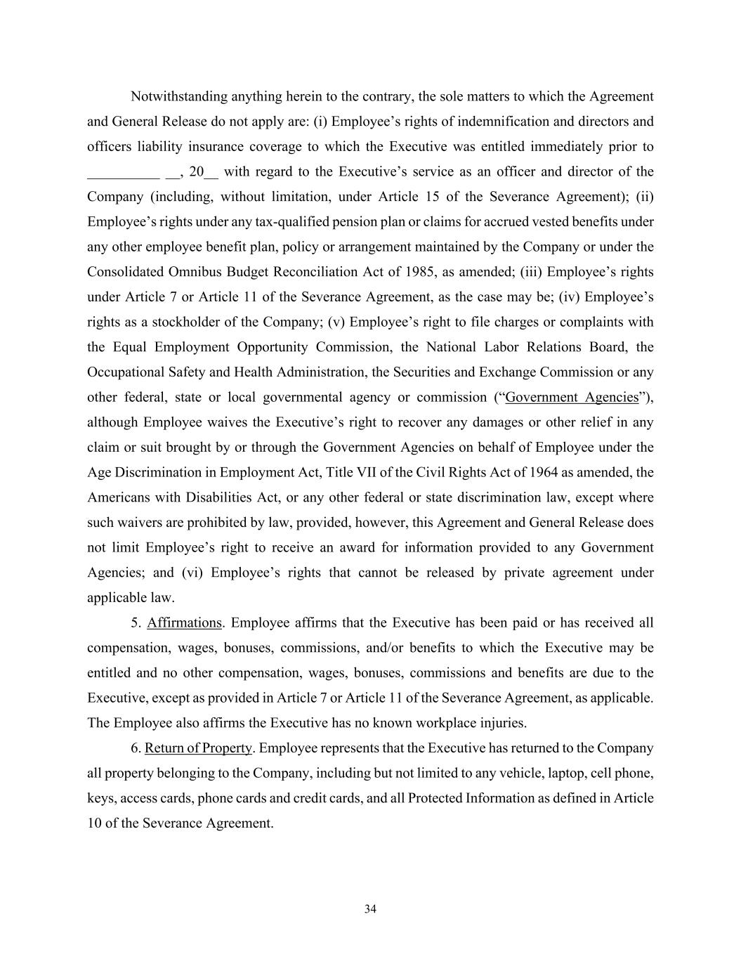 34 Notwithstanding anything herein to the contrary, the sole matters to which the Agreement and General Release do not apply are: (i) Employee’s rights of indemnification and directors and officers liability insurance coverage to which the Executive was entitled immediately prior to __________ __, 20__ with regard to the Executive’s service as an officer and director of the Company (including, without limitation, under Article 15 of the Severance Agreement); (ii) Employee’s rights under any tax-qualified pension plan or claims for accrued vested benefits under any other employee benefit plan, policy or arrangement maintained by the Company or under the Consolidated Omnibus Budget Reconciliation Act of 1985, as amended; (iii) Employee’s rights under Article 7 or Article 11 of the Severance Agreement, as the case may be; (iv) Employee’s rights as a stockholder of the Company; (v) Employee’s right to file charges or complaints with the Equal Employment Opportunity Commission, the National Labor Relations Board, the Occupational Safety and Health Administration, the Securities and Exchange Commission or any other federal, state or local governmental agency or commission (“Government Agencies”), although Employee waives the Executive’s right to recover any damages or other relief in any claim or suit brought by or through the Government Agencies on behalf of Employee under the Age Discrimination in Employment Act, Title VII of the Civil Rights Act of 1964 as amended, the Americans with Disabilities Act, or any other federal or state discrimination law, except where such waivers are prohibited by law, provided, however, this Agreement and General Release does not limit Employee’s right to receive an award for information provided to any Government Agencies; and (vi) Employee’s rights that cannot be released by private agreement under applicable law. 5. Affirmations. Employee affirms that the Executive has been paid or has received all compensation, wages, bonuses, commissions, and/or benefits to which the Executive may be entitled and no other compensation, wages, bonuses, commissions and benefits are due to the Executive, except as provided in Article 7 or Article 11 of the Severance Agreement, as applicable. The Employee also affirms the Executive has no known workplace injuries. 6. Return of Property. Employee represents that the Executive has returned to the Company all property belonging to the Company, including but not limited to any vehicle, laptop, cell phone, keys, access cards, phone cards and credit cards, and all Protected Information as defined in Article 10 of the Severance Agreement.