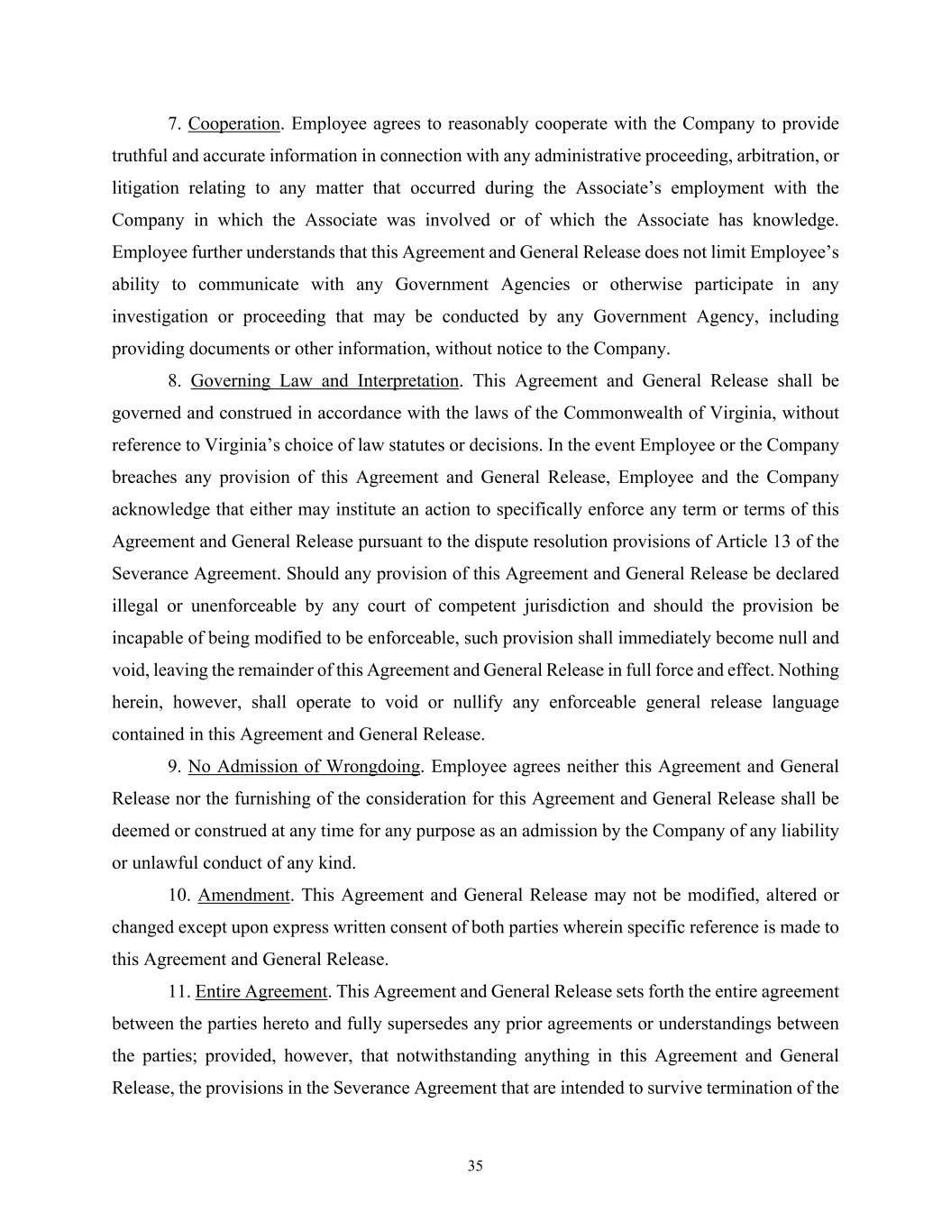 35 7. Cooperation. Employee agrees to reasonably cooperate with the Company to provide truthful and accurate information in connection with any administrative proceeding, arbitration, or litigation relating to any matter that occurred during the Associate’s employment with the Company in which the Associate was involved or of which the Associate has knowledge. Employee further understands that this Agreement and General Release does not limit Employee’s ability to communicate with any Government Agencies or otherwise participate in any investigation or proceeding that may be conducted by any Government Agency, including providing documents or other information, without notice to the Company. 8. Governing Law and Interpretation. This Agreement and General Release shall be governed and construed in accordance with the laws of the Commonwealth of Virginia, without reference to Virginia’s choice of law statutes or decisions. In the event Employee or the Company breaches any provision of this Agreement and General Release, Employee and the Company acknowledge that either may institute an action to specifically enforce any term or terms of this Agreement and General Release pursuant to the dispute resolution provisions of Article 13 of the Severance Agreement. Should any provision of this Agreement and General Release be declared illegal or unenforceable by any court of competent jurisdiction and should the provision be incapable of being modified to be enforceable, such provision shall immediately become null and void, leaving the remainder of this Agreement and General Release in full force and effect. Nothing herein, however, shall operate to void or nullify any enforceable general release language contained in this Agreement and General Release. 9. No Admission of Wrongdoing. Employee agrees neither this Agreement and General Release nor the furnishing of the consideration for this Agreement and General Release shall be deemed or construed at any time for any purpose as an admission by the Company of any liability or unlawful conduct of any kind. 10. Amendment. This Agreement and General Release may not be modified, altered or changed except upon express written consent of both parties wherein specific reference is made to this Agreement and General Release. 11. Entire Agreement. This Agreement and General Release sets forth the entire agreement between the parties hereto and fully supersedes any prior agreements or understandings between the parties; provided, however, that notwithstanding anything in this Agreement and General Release, the provisions in the Severance Agreement that are intended to survive termination of the