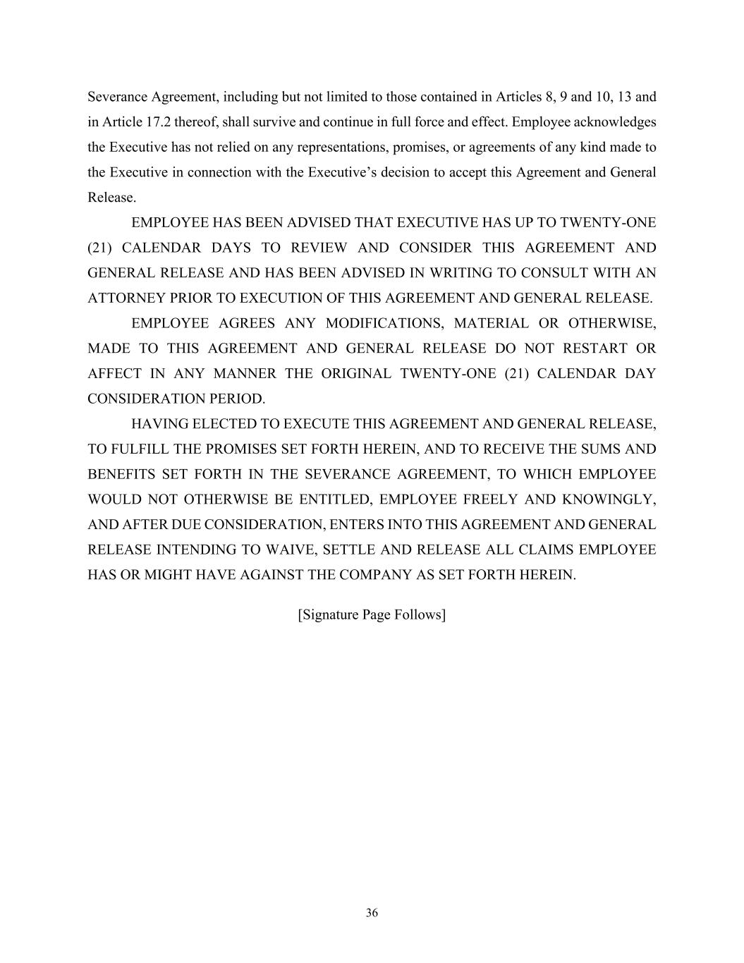 36 Severance Agreement, including but not limited to those contained in Articles 8, 9 and 10, 13 and in Article 17.2 thereof, shall survive and continue in full force and effect. Employee acknowledges the Executive has not relied on any representations, promises, or agreements of any kind made to the Executive in connection with the Executive’s decision to accept this Agreement and General Release. EMPLOYEE HAS BEEN ADVISED THAT EXECUTIVE HAS UP TO TWENTY-ONE (21) CALENDAR DAYS TO REVIEW AND CONSIDER THIS AGREEMENT AND GENERAL RELEASE AND HAS BEEN ADVISED IN WRITING TO CONSULT WITH AN ATTORNEY PRIOR TO EXECUTION OF THIS AGREEMENT AND GENERAL RELEASE. EMPLOYEE AGREES ANY MODIFICATIONS, MATERIAL OR OTHERWISE, MADE TO THIS AGREEMENT AND GENERAL RELEASE DO NOT RESTART OR AFFECT IN ANY MANNER THE ORIGINAL TWENTY-ONE (21) CALENDAR DAY CONSIDERATION PERIOD. HAVING ELECTED TO EXECUTE THIS AGREEMENT AND GENERAL RELEASE, TO FULFILL THE PROMISES SET FORTH HEREIN, AND TO RECEIVE THE SUMS AND BENEFITS SET FORTH IN THE SEVERANCE AGREEMENT, TO WHICH EMPLOYEE WOULD NOT OTHERWISE BE ENTITLED, EMPLOYEE FREELY AND KNOWINGLY, AND AFTER DUE CONSIDERATION, ENTERS INTO THIS AGREEMENT AND GENERAL RELEASE INTENDING TO WAIVE, SETTLE AND RELEASE ALL CLAIMS EMPLOYEE HAS OR MIGHT HAVE AGAINST THE COMPANY AS SET FORTH HEREIN. [Signature Page Follows]