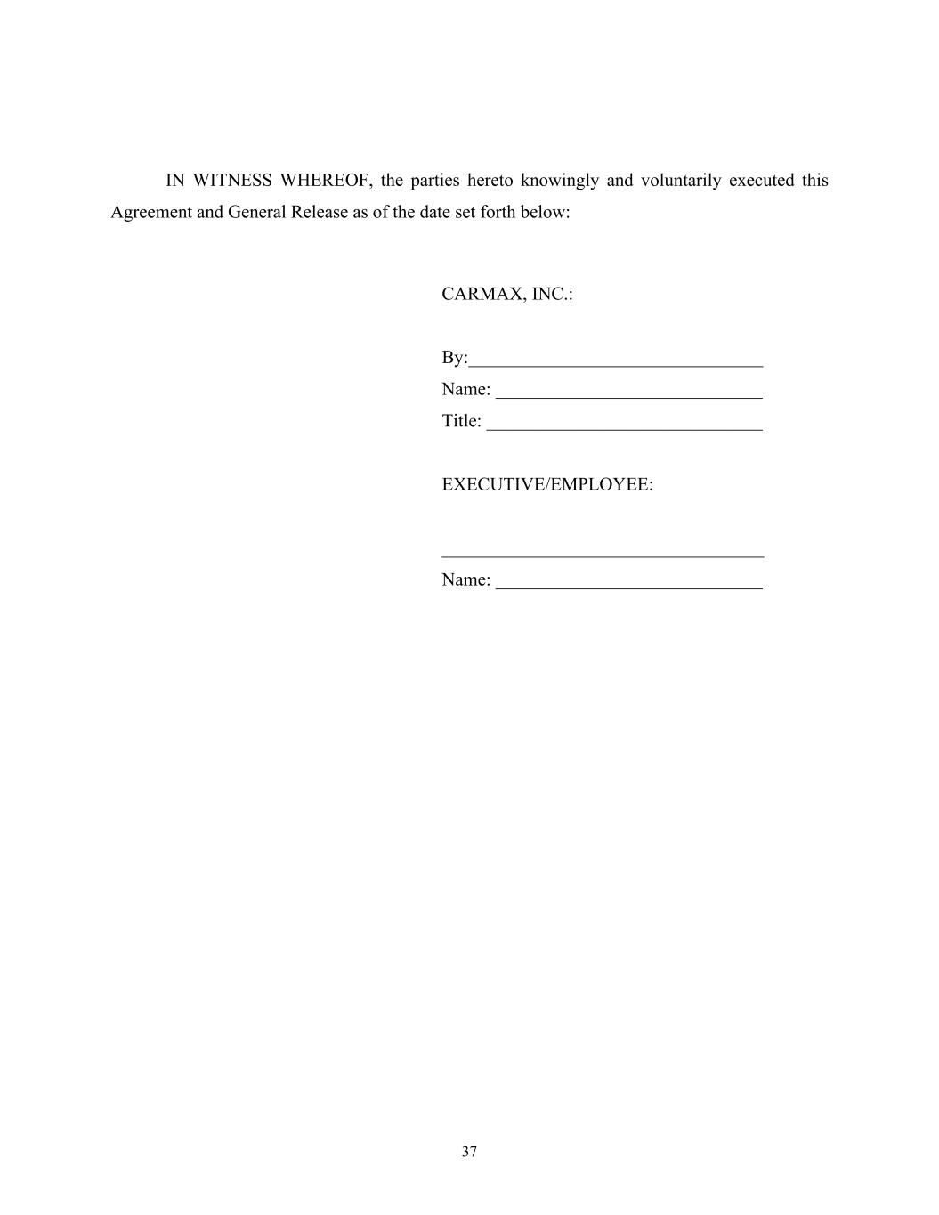 37 IN WITNESS WHEREOF, the parties hereto knowingly and voluntarily executed this Agreement and General Release as of the date set forth below: CARMAX, INC.: By:________________________________ Name: _____________________________ Title: ______________________________ EXECUTIVE/EMPLOYEE: ___________________________________ Name: _____________________________