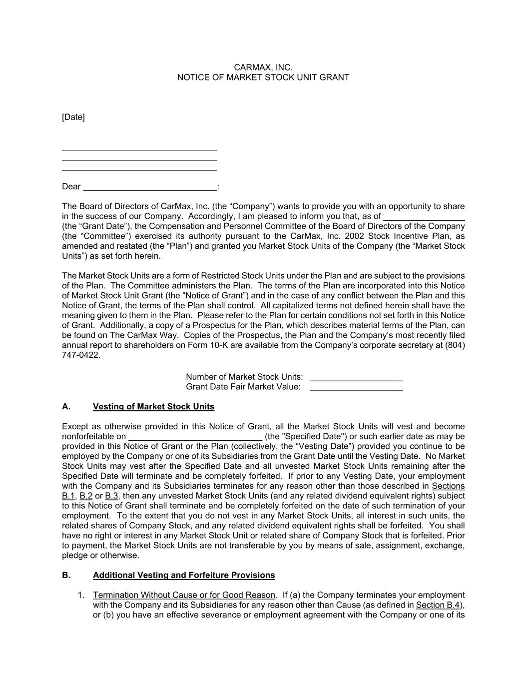 CARMAX, INC. NOTICE OF MARKET STOCK UNIT GRANT [Date] Dear : The Board of Directors of CarMax, Inc. (the “Company”) wants to provide you with an opportunity to share in the success of our Company. Accordingly, I am pleased to inform you that, as of _________________ (the “Grant Date”), the Compensation and Personnel Committee of the Board of Directors of the Company (the “Committee”) exercised its authority pursuant to the CarMax, Inc. 2002 Stock Incentive Plan, as amended and restated (the “Plan”) and granted you Market Stock Units of the Company (the “Market Stock Units”) as set forth herein. The Market Stock Units are a form of Restricted Stock Units under the Plan and are subject to the provisions of the Plan. The Committee administers the Plan. The terms of the Plan are incorporated into this Notice of Market Stock Unit Grant (the “Notice of Grant”) and in the case of any conflict between the Plan and this Notice of Grant, the terms of the Plan shall control. All capitalized terms not defined herein shall have the meaning given to them in the Plan. Please refer to the Plan for certain conditions not set forth in this Notice of Grant. Additionally, a copy of a Prospectus for the Plan, which describes material terms of the Plan, can be found on The CarMax Way. Copies of the Prospectus, the Plan and the Company’s most recently filed annual report to shareholders on Form 10-K are available from the Company’s corporate secretary at (804) 747-0422. Number of Market Stock Units: Grant Date Fair Market Value: A. Vesting of Market Stock Units Except as otherwise provided in this Notice of Grant, all the Market Stock Units will vest and become nonforfeitable on ____________________________ (the "Specified Date") or such earlier date as may be provided in this Notice of Grant or the Plan (collectively, the “Vesting Date”) provided you continue to be employed by the Company or one of its Subsidiaries from the Grant Date until the Vesting Date. No Market Stock Units may vest after the Specified Date and all unvested Market Stock Units remaining after the Specified Date will terminate and be completely forfeited. If prior to any Vesting Date, your employment with the Company and its Subsidiaries terminates for any reason other than those described in Sections B.1, B.2 or B.3, then any unvested Market Stock Units (and any related dividend equivalent rights) subject to this Notice of Grant shall terminate and be completely forfeited on the date of such termination of your employment. To the extent that you do not vest in any Market Stock Units, all interest in such units, the related shares of Company Stock, and any related dividend equivalent rights shall be forfeited. You shall have no right or interest in any Market Stock Unit or related share of Company Stock that is forfeited. Prior to payment, the Market Stock Units are not transferable by you by means of sale, assignment, exchange, pledge or otherwise. B. Additional Vesting and Forfeiture Provisions 1. Termination Without Cause or for Good Reason. If (a) the Company terminates your employment with the Company and its Subsidiaries for any reason other than Cause (as defined in Section B.4), or (b) you have an effective severance or employment agreement with the Company or one of its