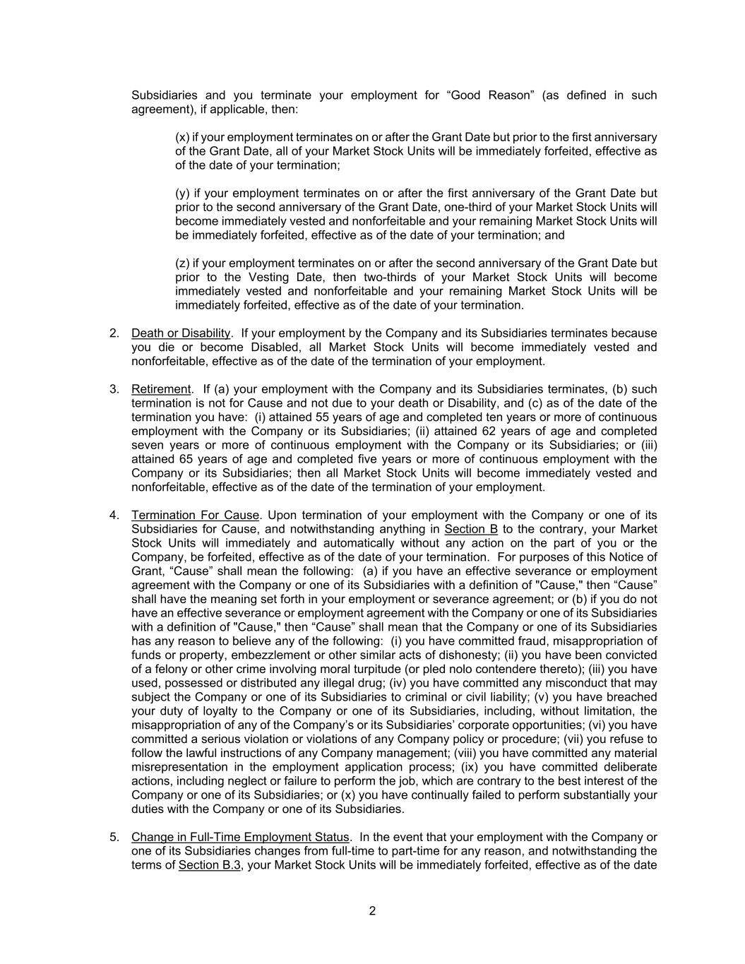 2 Subsidiaries and you terminate your employment for “Good Reason” (as defined in such agreement), if applicable, then: (x) if your employment terminates on or after the Grant Date but prior to the first anniversary of the Grant Date, all of your Market Stock Units will be immediately forfeited, effective as of the date of your termination; (y) if your employment terminates on or after the first anniversary of the Grant Date but prior to the second anniversary of the Grant Date, one-third of your Market Stock Units will become immediately vested and nonforfeitable and your remaining Market Stock Units will be immediately forfeited, effective as of the date of your termination; and (z) if your employment terminates on or after the second anniversary of the Grant Date but prior to the Vesting Date, then two-thirds of your Market Stock Units will become immediately vested and nonforfeitable and your remaining Market Stock Units will be immediately forfeited, effective as of the date of your termination. 2. Death or Disability. If your employment by the Company and its Subsidiaries terminates because you die or become Disabled, all Market Stock Units will become immediately vested and nonforfeitable, effective as of the date of the termination of your employment. 3. Retirement. If (a) your employment with the Company and its Subsidiaries terminates, (b) such termination is not for Cause and not due to your death or Disability, and (c) as of the date of the termination you have: (i) attained 55 years of age and completed ten years or more of continuous employment with the Company or its Subsidiaries; (ii) attained 62 years of age and completed seven years or more of continuous employment with the Company or its Subsidiaries; or (iii) attained 65 years of age and completed five years or more of continuous employment with the Company or its Subsidiaries; then all Market Stock Units will become immediately vested and nonforfeitable, effective as of the date of the termination of your employment. 4. Termination For Cause. Upon termination of your employment with the Company or one of its Subsidiaries for Cause, and notwithstanding anything in Section B to the contrary, your Market Stock Units will immediately and automatically without any action on the part of you or the Company, be forfeited, effective as of the date of your termination. For purposes of this Notice of Grant, “Cause” shall mean the following: (a) if you have an effective severance or employment agreement with the Company or one of its Subsidiaries with a definition of "Cause," then “Cause” shall have the meaning set forth in your employment or severance agreement; or (b) if you do not have an effective severance or employment agreement with the Company or one of its Subsidiaries with a definition of "Cause," then “Cause” shall mean that the Company or one of its Subsidiaries has any reason to believe any of the following: (i) you have committed fraud, misappropriation of funds or property, embezzlement or other similar acts of dishonesty; (ii) you have been convicted of a felony or other crime involving moral turpitude (or pled nolo contendere thereto); (iii) you have used, possessed or distributed any illegal drug; (iv) you have committed any misconduct that may subject the Company or one of its Subsidiaries to criminal or civil liability; (v) you have breached your duty of loyalty to the Company or one of its Subsidiaries, including, without limitation, the misappropriation of any of the Company’s or its Subsidiaries’ corporate opportunities; (vi) you have committed a serious violation or violations of any Company policy or procedure; (vii) you refuse to follow the lawful instructions of any Company management; (viii) you have committed any material misrepresentation in the employment application process; (ix) you have committed deliberate actions, including neglect or failure to perform the job, which are contrary to the best interest of the Company or one of its Subsidiaries; or (x) you have continually failed to perform substantially your duties with the Company or one of its Subsidiaries. 5. Change in Full-Time Employment Status. In the event that your employment with the Company or one of its Subsidiaries changes from full-time to part-time for any reason, and notwithstanding the terms of Section B.3, your Market Stock Units will be immediately forfeited, effective as of the date