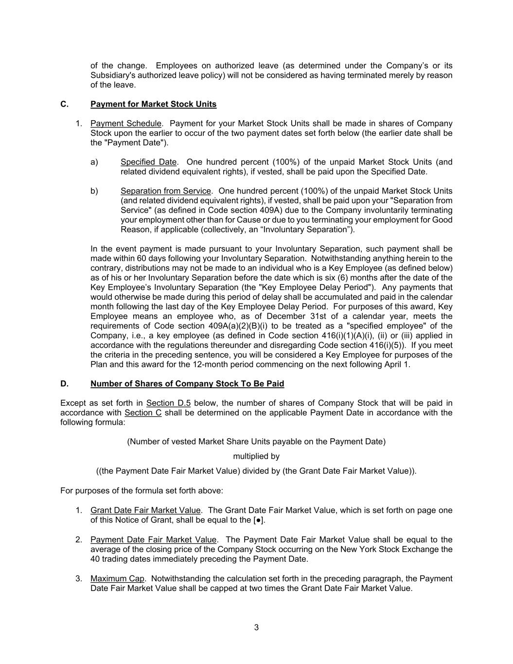 3 of the change. Employees on authorized leave (as determined under the Company’s or its Subsidiary's authorized leave policy) will not be considered as having terminated merely by reason of the leave. C. Payment for Market Stock Units 1. Payment Schedule. Payment for your Market Stock Units shall be made in shares of Company Stock upon the earlier to occur of the two payment dates set forth below (the earlier date shall be the "Payment Date"). a) Specified Date. One hundred percent (100%) of the unpaid Market Stock Units (and related dividend equivalent rights), if vested, shall be paid upon the Specified Date. b) Separation from Service. One hundred percent (100%) of the unpaid Market Stock Units (and related dividend equivalent rights), if vested, shall be paid upon your "Separation from Service" (as defined in Code section 409A) due to the Company involuntarily terminating your employment other than for Cause or due to you terminating your employment for Good Reason, if applicable (collectively, an “Involuntary Separation”). In the event payment is made pursuant to your Involuntary Separation, such payment shall be made within 60 days following your Involuntary Separation. Notwithstanding anything herein to the contrary, distributions may not be made to an individual who is a Key Employee (as defined below) as of his or her Involuntary Separation before the date which is six (6) months after the date of the Key Employee’s Involuntary Separation (the "Key Employee Delay Period"). Any payments that would otherwise be made during this period of delay shall be accumulated and paid in the calendar month following the last day of the Key Employee Delay Period. For purposes of this award, Key Employee means an employee who, as of December 31st of a calendar year, meets the requirements of Code section 409A(a)(2)(B)(i) to be treated as a "specified employee" of the Company, i.e., a key employee (as defined in Code section 416(i)(1)(A)(i), (ii) or (iii) applied in accordance with the regulations thereunder and disregarding Code section 416(i)(5)). If you meet the criteria in the preceding sentence, you will be considered a Key Employee for purposes of the Plan and this award for the 12-month period commencing on the next following April 1. D. Number of Shares of Company Stock To Be Paid Except as set forth in Section D.5 below, the number of shares of Company Stock that will be paid in accordance with Section C shall be determined on the applicable Payment Date in accordance with the following formula: (Number of vested Market Share Units payable on the Payment Date) multiplied by ((the Payment Date Fair Market Value) divided by (the Grant Date Fair Market Value)). For purposes of the formula set forth above: 1. Grant Date Fair Market Value. The Grant Date Fair Market Value, which is set forth on page one of this Notice of Grant, shall be equal to the [●]. 2. Payment Date Fair Market Value. The Payment Date Fair Market Value shall be equal to the average of the closing price of the Company Stock occurring on the New York Stock Exchange the 40 trading dates immediately preceding the Payment Date. 3. Maximum Cap. Notwithstanding the calculation set forth in the preceding paragraph, the Payment Date Fair Market Value shall be capped at two times the Grant Date Fair Market Value.