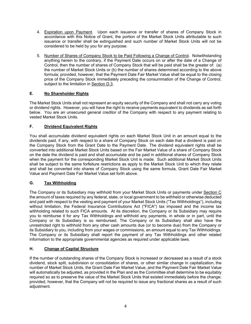 4 4. Expiration upon Payment. Upon each issuance or transfer of shares of Company Stock in accordance with this Notice of Grant, the portion of the Market Stock Units attributable to such issuance or transfer shall be extinguished and such number of Market Stock Units will not be considered to be held by you for any purpose. 5. Number of Shares of Company Stock to be Paid Following a Change of Control. Notwithstanding anything herein to the contrary, if the Payment Date occurs on or after the date of a Change of Control, then the number of shares of Company Stock that will be paid shall be the greater of: (a) the number of Market Stock Units or (b) the number of shares determined according to the above formula; provided, however, that the Payment Date Fair Market Value shall be equal to the closing price of the Company Stock immediately preceding the consummation of the Change of Control, subject to the limitation in Section D.3. E. No Shareholder Rights The Market Stock Units shall not represent an equity security of the Company and shall not carry any voting or dividend rights. However, you will have the right to receive payments equivalent to dividends as set forth below. You are an unsecured general creditor of the Company with respect to any payment relating to vested Market Stock Units. F. Dividend Equivalent Rights You shall accumulate dividend equivalent rights on each Market Stock Unit in an amount equal to the dividends paid, if any, with respect to a share of Company Stock on each date that a dividend is paid on the Company Stock from the Grant Date to the Payment Date. The dividend equivalent rights shall be converted into additional Market Stock Units based on the Fair Market Value of a share of Company Stock on the date the dividend is paid and shall accumulate and be paid in additional shares of Company Stock when the payment for the corresponding Market Stock Unit is made. Such additional Market Stock Units shall be subject to the same forfeiture restrictions as apply to the Market Stock Unit to which they relate and shall be converted into shares of Company Stock using the same formula, Grant Date Fair Market Value and Payment Date Fair Market Value set forth above. G. Tax Withholding The Company or its Subsidiary may withhold from your Market Stock Units or payments under Section C the amount of taxes required by any federal, state, or local government to be withheld or otherwise deducted and paid with respect to the vesting and payment of your Market Stock Units (“Tax Withholdings”), including without limitation, the Federal Insurance Contributions Act ("FICA") tax imposed and the income tax withholding related to such FICA amounts. At its discretion, the Company or its Subsidiary may require you to reimburse it for any Tax Withholdings and withhold any payments, in whole or in part, until the Company or its Subsidiary is so reimbursed. The Company or its Subsidiary shall also have the unrestricted right to withhold from any other cash amounts due (or to become due) from the Company or its Subsidiary to you, including from your wages or commissions, an amount equal to any Tax Withholdings. The Company or its Subsidiary shall report the payment of any Tax Withholdings and other related information to the appropriate governmental agencies as required under applicable laws. H. Change of Capital Structure If the number of outstanding shares of the Company Stock is increased or decreased as a result of a stock dividend, stock split, subdivision or consolidation of shares, or other similar change in capitalization, the number of Market Stock Units, the Grant Date Fair Market Value, and the Payment Date Fair Market Value will automatically be adjusted, as provided in the Plan and as the Committee shall determine to be equitably required so as to preserve the value of the Market Stock Units that existed immediately before the change; provided, however, that the Company will not be required to issue any fractional shares as a result of such adjustment.