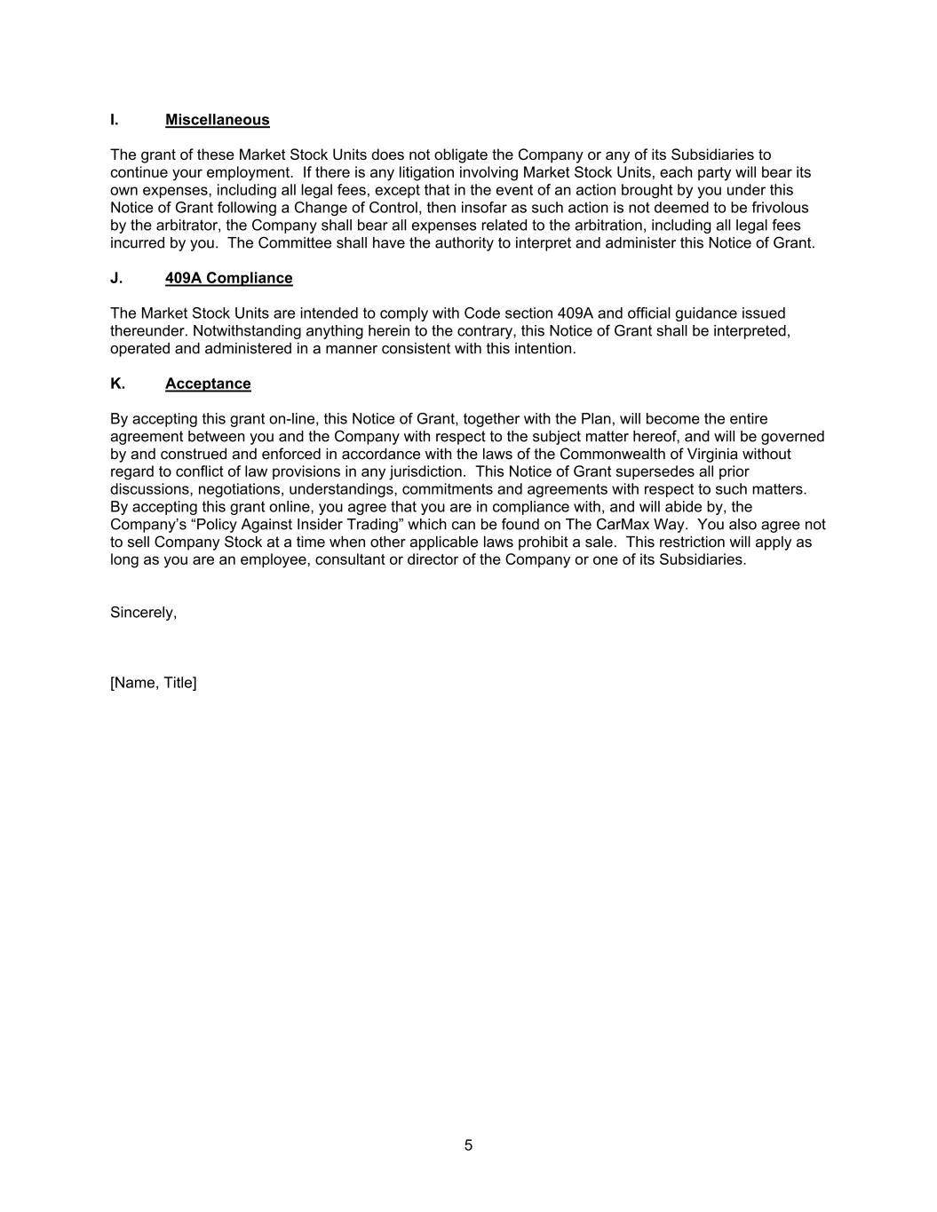 5 I. Miscellaneous The grant of these Market Stock Units does not obligate the Company or any of its Subsidiaries to continue your employment. If there is any litigation involving Market Stock Units, each party will bear its own expenses, including all legal fees, except that in the event of an action brought by you under this Notice of Grant following a Change of Control, then insofar as such action is not deemed to be frivolous by the arbitrator, the Company shall bear all expenses related to the arbitration, including all legal fees incurred by you. The Committee shall have the authority to interpret and administer this Notice of Grant. J. 409A Compliance The Market Stock Units are intended to comply with Code section 409A and official guidance issued thereunder. Notwithstanding anything herein to the contrary, this Notice of Grant shall be interpreted, operated and administered in a manner consistent with this intention. K. Acceptance By accepting this grant on-line, this Notice of Grant, together with the Plan, will become the entire agreement between you and the Company with respect to the subject matter hereof, and will be governed by and construed and enforced in accordance with the laws of the Commonwealth of Virginia without regard to conflict of law provisions in any jurisdiction. This Notice of Grant supersedes all prior discussions, negotiations, understandings, commitments and agreements with respect to such matters. By accepting this grant online, you agree that you are in compliance with, and will abide by, the Company’s “Policy Against Insider Trading” which can be found on The CarMax Way. You also agree not to sell Company Stock at a time when other applicable laws prohibit a sale. This restriction will apply as long as you are an employee, consultant or director of the Company or one of its Subsidiaries. Sincerely, [Name, Title]