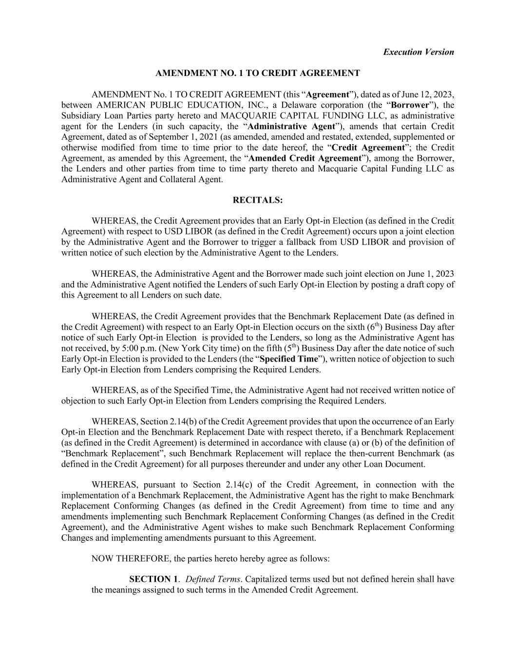 Execution Version AMENDMENT NO. 1 TO CREDIT AGREEMENT AMENDMENT No. 1 TO CREDIT AGREEMENT (this “Agreement”), dated as of June 12, 2023, between AMERICAN PUBLIC EDUCATION, INC., a Delaware corporation (the “Borrower”), the Subsidiary Loan Parties party hereto and MACQUARIE CAPITAL FUNDING LLC, as administrative agent for the Lenders (in such capacity, the “Administrative Agent”), amends that certain Credit Agreement, dated as of September 1, 2021 (as amended, amended and restated, extended, supplemented or otherwise modified from time to time prior to the date hereof, the “Credit Agreement”; the Credit Agreement, as amended by this Agreement, the “Amended Credit Agreement”), among the Borrower, the Lenders and other parties from time to time party thereto and Macquarie Capital Funding LLC as Administrative Agent and Collateral Agent. RECITALS: WHEREAS, the Credit Agreement provides that an Early Opt-in Election (as defined in the Credit Agreement) with respect to USD LIBOR (as defined in the Credit Agreement) occurs upon a joint election by the Administrative Agent and the Borrower to trigger a fallback from USD LIBOR and provision of written notice of such election by the Administrative Agent to the Lenders. WHEREAS, the Administrative Agent and the Borrower made such joint election on June 1, 2023 and the Administrative Agent notified the Lenders of such Early Opt-in Election by posting a draft copy of this Agreement to all Lenders on such date. WHEREAS, the Credit Agreement provides that the Benchmark Replacement Date (as defined in the Credit Agreement) with respect to an Early Opt-in Election occurs on the sixth (6th) Business Day after notice of such Early Opt-in Election is provided to the Lenders, so long as the Administrative Agent has not received, by 5:00 p.m. (New York City time) on the fifth (5th) Business Day after the date notice of such Early Opt-in Election is provided to the Lenders (the “Specified Time”), written notice of objection to such Early Opt-in Election from Lenders comprising the Required Lenders. WHEREAS, as of the Specified Time, the Administrative Agent had not received written notice of objection to such Early Opt-in Election from Lenders comprising the Required Lenders. WHEREAS, Section 2.14(b) of the Credit Agreement provides that upon the occurrence of an Early Opt-in Election and the Benchmark Replacement Date with respect thereto, if a Benchmark Replacement (as defined in the Credit Agreement) is determined in accordance with clause (a) or (b) of the definition of “Benchmark Replacement”, such Benchmark Replacement will replace the then-current Benchmark (as defined in the Credit Agreement) for all purposes thereunder and under any other Loan Document. WHEREAS, pursuant to Section 2.14(c) of the Credit Agreement, in connection with the implementation of a Benchmark Replacement, the Administrative Agent has the right to make Benchmark Replacement Conforming Changes (as defined in the Credit Agreement) from time to time and any amendments implementing such Benchmark Replacement Conforming Changes (as defined in the Credit Agreement), and the Administrative Agent wishes to make such Benchmark Replacement Conforming Changes and implementing amendments pursuant to this Agreement. NOW THEREFORE, the parties hereto hereby agree as follows: SECTION 1. Defined Terms. Capitalized terms used but not defined herein shall have the meanings assigned to such terms in the Amended Credit Agreement.
