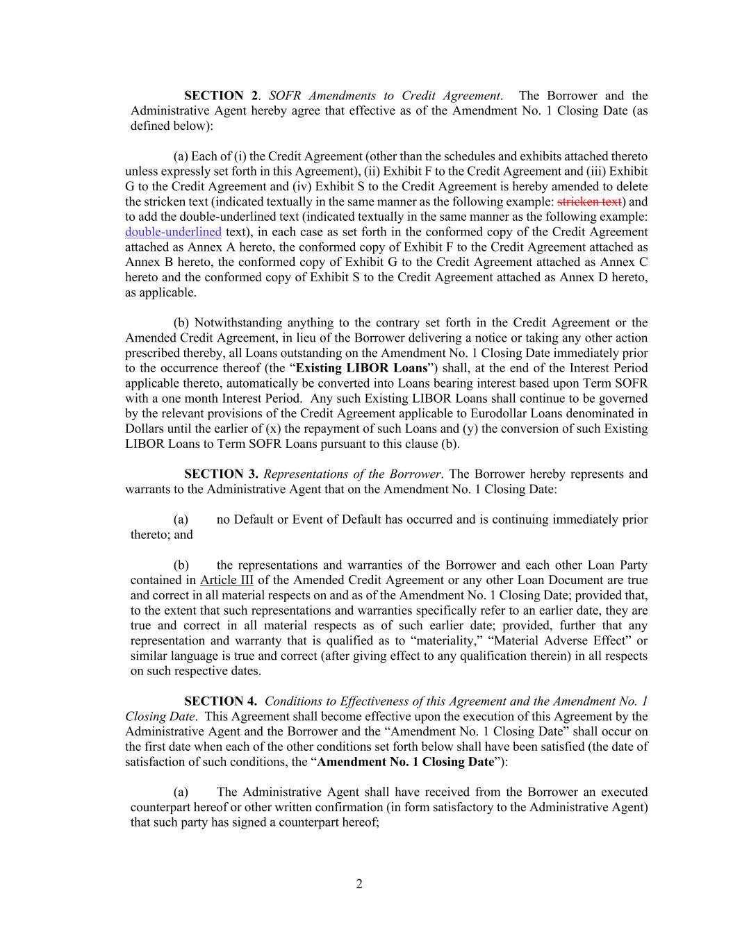 2 SECTION 2. SOFR Amendments to Credit Agreement. The Borrower and the Administrative Agent hereby agree that effective as of the Amendment No. 1 Closing Date (as defined below): (a) Each of (i) the Credit Agreement (other than the schedules and exhibits attached thereto unless expressly set forth in this Agreement), (ii) Exhibit F to the Credit Agreement and (iii) Exhibit G to the Credit Agreement and (iv) Exhibit S to the Credit Agreement is hereby amended to delete the stricken text (indicated textually in the same manner as the following example: stricken text) and to add the double-underlined text (indicated textually in the same manner as the following example: double-underlined text), in each case as set forth in the conformed copy of the Credit Agreement attached as Annex A hereto, the conformed copy of Exhibit F to the Credit Agreement attached as Annex B hereto, the conformed copy of Exhibit G to the Credit Agreement attached as Annex C hereto and the conformed copy of Exhibit S to the Credit Agreement attached as Annex D hereto, as applicable. (b) Notwithstanding anything to the contrary set forth in the Credit Agreement or the Amended Credit Agreement, in lieu of the Borrower delivering a notice or taking any other action prescribed thereby, all Loans outstanding on the Amendment No. 1 Closing Date immediately prior to the occurrence thereof (the “Existing LIBOR Loans”) shall, at the end of the Interest Period applicable thereto, automatically be converted into Loans bearing interest based upon Term SOFR with a one month Interest Period. Any such Existing LIBOR Loans shall continue to be governed by the relevant provisions of the Credit Agreement applicable to Eurodollar Loans denominated in Dollars until the earlier of (x) the repayment of such Loans and (y) the conversion of such Existing LIBOR Loans to Term SOFR Loans pursuant to this clause (b). SECTION 3. Representations of the Borrower. The Borrower hereby represents and warrants to the Administrative Agent that on the Amendment No. 1 Closing Date: (a) no Default or Event of Default has occurred and is continuing immediately prior thereto; and (b) the representations and warranties of the Borrower and each other Loan Party contained in Article III of the Amended Credit Agreement or any other Loan Document are true and correct in all material respects on and as of the Amendment No. 1 Closing Date; provided that, to the extent that such representations and warranties specifically refer to an earlier date, they are true and correct in all material respects as of such earlier date; provided, further that any representation and warranty that is qualified as to “materiality,” “Material Adverse Effect” or similar language is true and correct (after giving effect to any qualification therein) in all respects on such respective dates. SECTION 4. Conditions to Effectiveness of this Agreement and the Amendment No. 1 Closing Date. This Agreement shall become effective upon the execution of this Agreement by the Administrative Agent and the Borrower and the “Amendment No. 1 Closing Date” shall occur on the first date when each of the other conditions set forth below shall have been satisfied (the date of satisfaction of such conditions, the “Amendment No. 1 Closing Date”): (a) The Administrative Agent shall have received from the Borrower an executed counterpart hereof or other written confirmation (in form satisfactory to the Administrative Agent) that such party has signed a counterpart hereof;