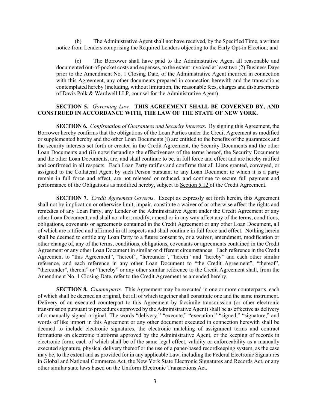 3 (b) The Administrative Agent shall not have received, by the Specified Time, a written notice from Lenders comprising the Required Lenders objecting to the Early Opt-in Election; and (c) The Borrower shall have paid to the Administrative Agent all reasonable and documented out-of-pocket costs and expenses, to the extent invoiced at least two (2) Business Days prior to the Amendment No. 1 Closing Date, of the Administrative Agent incurred in connection with this Agreement, any other documents prepared in connection herewith and the transactions contemplated hereby (including, without limitation, the reasonable fees, charges and disbursements of Davis Polk & Wardwell LLP, counsel for the Administrative Agent). SECTION 5. Governing Law. THIS AGREEMENT SHALL BE GOVERNED BY, AND CONSTRUED IN ACCORDANCE WITH, THE LAW OF THE STATE OF NEW YORK. SECTION 6. Confirmation of Guarantees and Security Interests. By signing this Agreement, the Borrower hereby confirms that the obligations of the Loan Parties under the Credit Agreement as modified or supplemented hereby and the other Loan Documents (i) are entitled to the benefits of the guarantees and the security interests set forth or created in the Credit Agreement, the Security Documents and the other Loan Documents and (ii) notwithstanding the effectiveness of the terms hereof, the Security Documents and the other Loan Documents, are, and shall continue to be, in full force and effect and are hereby ratified and confirmed in all respects. Each Loan Party ratifies and confirms that all Liens granted, conveyed, or assigned to the Collateral Agent by such Person pursuant to any Loan Document to which it is a party remain in full force and effect, are not released or reduced, and continue to secure full payment and performance of the Obligations as modified hereby, subject to Section 5.12 of the Credit Agreement. SECTION 7. Credit Agreement Governs. Except as expressly set forth herein, this Agreement shall not by implication or otherwise limit, impair, constitute a waiver of or otherwise affect the rights and remedies of any Loan Party, any Lender or the Administrative Agent under the Credit Agreement or any other Loan Document, and shall not alter, modify, amend or in any way affect any of the terms, conditions, obligations, covenants or agreements contained in the Credit Agreement or any other Loan Document, all of which are ratified and affirmed in all respects and shall continue in full force and effect. Nothing herein shall be deemed to entitle any Loan Party to a future consent to, or a waiver, amendment, modification or other change of, any of the terms, conditions, obligations, covenants or agreements contained in the Credit Agreement or any other Loan Document in similar or different circumstances. Each reference in the Credit Agreement to “this Agreement”, “hereof”, “hereunder”, “herein” and “hereby” and each other similar reference, and each reference in any other Loan Document to “the Credit Agreement”, “thereof”, “thereunder”, therein” or “thereby” or any other similar reference to the Credit Agreement shall, from the Amendment No. 1 Closing Date, refer to the Credit Agreement as amended hereby. SECTION 8. Counterparts. This Agreement may be executed in one or more counterparts, each of which shall be deemed an original, but all of which together shall constitute one and the same instrument. Delivery of an executed counterpart to this Agreement by facsimile transmission (or other electronic transmission pursuant to procedures approved by the Administrative Agent) shall be as effective as delivery of a manually signed original. The words “delivery,” “execute,” “execution,” “signed,” “signature,” and words of like import in this Agreement or any other document executed in connection herewith shall be deemed to include electronic signatures, the electronic matching of assignment terms and contract formations on electronic platforms approved by the Administrative Agent, or the keeping of records in electronic form, each of which shall be of the same legal effect, validity or enforceability as a manually executed signature, physical delivery thereof or the use of a paper-based recordkeeping system, as the case may be, to the extent and as provided for in any applicable Law, including the Federal Electronic Signatures in Global and National Commerce Act, the New York State Electronic Signatures and Records Act, or any other similar state laws based on the Uniform Electronic Transactions Act.