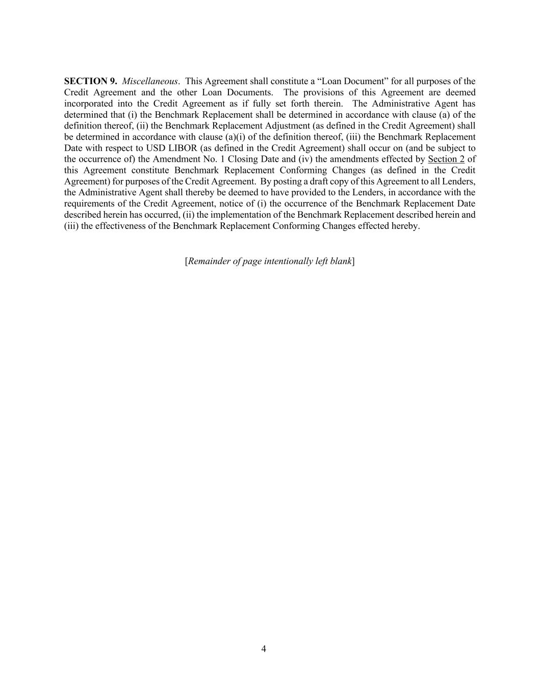 4 SECTION 9. Miscellaneous. This Agreement shall constitute a “Loan Document” for all purposes of the Credit Agreement and the other Loan Documents. The provisions of this Agreement are deemed incorporated into the Credit Agreement as if fully set forth therein. The Administrative Agent has determined that (i) the Benchmark Replacement shall be determined in accordance with clause (a) of the definition thereof, (ii) the Benchmark Replacement Adjustment (as defined in the Credit Agreement) shall be determined in accordance with clause (a)(i) of the definition thereof, (iii) the Benchmark Replacement Date with respect to USD LIBOR (as defined in the Credit Agreement) shall occur on (and be subject to the occurrence of) the Amendment No. 1 Closing Date and (iv) the amendments effected by Section 2 of this Agreement constitute Benchmark Replacement Conforming Changes (as defined in the Credit Agreement) for purposes of the Credit Agreement. By posting a draft copy of this Agreement to all Lenders, the Administrative Agent shall thereby be deemed to have provided to the Lenders, in accordance with the requirements of the Credit Agreement, notice of (i) the occurrence of the Benchmark Replacement Date described herein has occurred, (ii) the implementation of the Benchmark Replacement described herein and (iii) the effectiveness of the Benchmark Replacement Conforming Changes effected hereby. [Remainder of page intentionally left blank]
