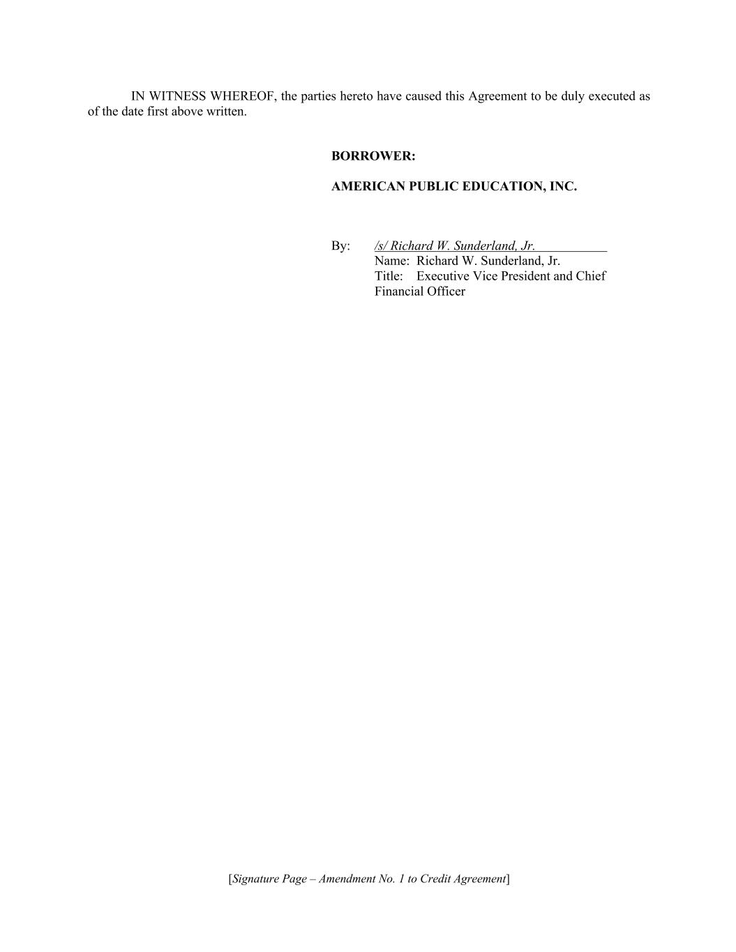 [Signature Page – Amendment No. 1 to Credit Agreement] IN WITNESS WHEREOF, the parties hereto have caused this Agreement to be duly executed as of the date first above written. BORROWER: AMERICAN PUBLIC EDUCATION, INC. By: /s/ Richard W. Sunderland, Jr. Name: Richard W. Sunderland, Jr. Title: Executive Vice President and Chief Financial Officer