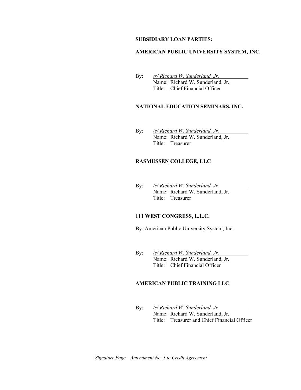[Signature Page – Amendment No. 1 to Credit Agreement] SUBSIDIARY LOAN PARTIES: AMERICAN PUBLIC UNIVERSITY SYSTEM, INC. By: /s/ Richard W. Sunderland, Jr. Name: Richard W. Sunderland, Jr. Title: Chief Financial Officer NATIONAL EDUCATION SEMINARS, INC. By: /s/ Richard W. Sunderland, Jr. Name: Richard W. Sunderland, Jr. Title: Treasurer RASMUSSEN COLLEGE, LLC By: /s/ Richard W. Sunderland, Jr. Name: Richard W. Sunderland, Jr. Title: Treasurer 111 WEST CONGRESS, L.L.C. By: American Public University System, Inc. By: /s/ Richard W. Sunderland, Jr. Name: Richard W. Sunderland, Jr. Title: Chief Financial Officer AMERICAN PUBLIC TRAINING LLC By: /s/ Richard W. Sunderland, Jr. Name: Richard W. Sunderland, Jr. Title: Treasurer and Chief Financial Officer