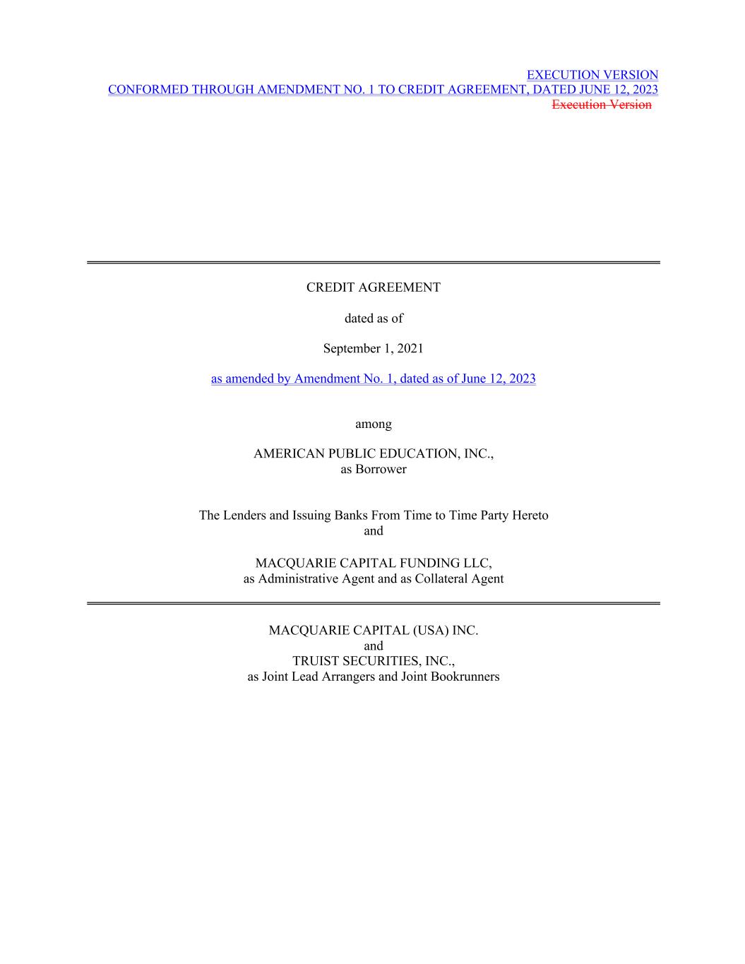 EXECUTION VERSION CONFORMED THROUGH AMENDMENT NO. 1 TO CREDIT AGREEMENT, DATED JUNE 12, 2023 Execution Version CREDIT AGREEMENT dated as of September 1, 2021 as amended by Amendment No. 1, dated as of June 12, 2023 among AMERICAN PUBLIC EDUCATION, INC., as Borrower The Lenders and Issuing Banks From Time to Time Party Hereto and MACQUARIE CAPITAL FUNDING LLC, as Administrative Agent and as Collateral Agent MACQUARIE CAPITAL (USA) INC. and TRUIST SECURITIES, INC., as Joint Lead Arrangers and Joint Bookrunners