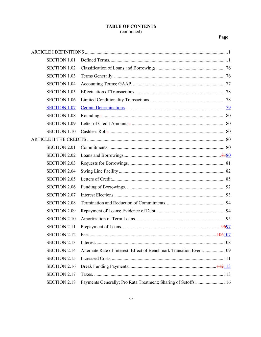 TABLE OF CONTENTS (continued) Page -i- ARTICLE I DEFINITIONS .......................................................................................................................... 1 SECTION 1.01 Defined Terms. .................................................................................................... 1 SECTION 1.02 Classification of Loans and Borrowings. .......................................................... 76 SECTION 1.03 Terms Generally. ............................................................................................... 76 SECTION 1.04 Accounting Terms; GAAP. ............................................................................... 77 SECTION 1.05 Effectuation of Transactions. ............................................................................ 78 SECTION 1.06 Limited Conditionality Transactions. ................................................................ 78 SECTION 1.07 Certain Determinations ...................................................................................... 79 SECTION 1.08 Rounding.. ......................................................................................................... 80 SECTION 1.09 Letter of Credit Amounts.. ................................................................................ 80 SECTION 1.10 Cashless Roll.. ................................................................................................... 80 ARTICLE II THE CREDITS ...................................................................................................................... 80 SECTION 2.01 Commitments. ................................................................................................... 80 SECTION 2.02 Loans and Borrowings. .................................................................................. 8180 SECTION 2.03 Requests for Borrowings. .................................................................................. 81 SECTION 2.04 Swing Line Facility ........................................................................................... 82 SECTION 2.05 Letters of Credit. ................................................................................................ 85 SECTION 2.06 Funding of Borrowings. .................................................................................... 92 SECTION 2.07 Interest Elections. .............................................................................................. 93 SECTION 2.08 Termination and Reduction of Commitments. .................................................. 94 SECTION 2.09 Repayment of Loans; Evidence of Debt. ........................................................... 94 SECTION 2.10 Amortization of Term Loans. ............................................................................ 95 SECTION 2.11 Prepayment of Loans. .................................................................................... 9697 SECTION 2.12 Fees. ........................................................................................................... 106107 SECTION 2.13 Interest. ............................................................................................................ 108 SECTION 2.14 Alternate Rate of Interest; Effect of Benchmark Transition Event. ................ 109 SECTION 2.15 Increased Costs. ............................................................................................... 111 SECTION 2.16 Break Funding Payments. .......................................................................... 112113 SECTION 2.17 Taxes. .............................................................................................................. 113 SECTION 2.18 Payments Generally; Pro Rata Treatment; Sharing of Setoffs. ....................... 116