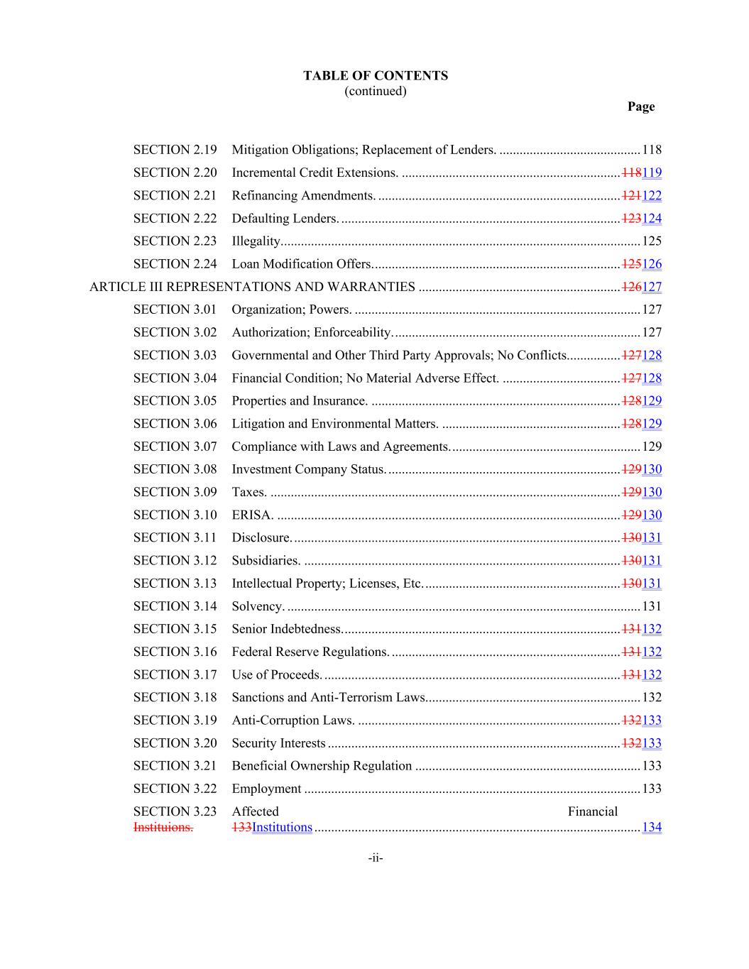 TABLE OF CONTENTS (continued) Page -ii- SECTION 2.19 Mitigation Obligations; Replacement of Lenders. .......................................... 118 SECTION 2.20 Incremental Credit Extensions. ................................................................. 118119 SECTION 2.21 Refinancing Amendments. ........................................................................ 121122 SECTION 2.22 Defaulting Lenders. ................................................................................... 123124 SECTION 2.23 Illegality. .......................................................................................................... 125 SECTION 2.24 Loan Modification Offers. ......................................................................... 125126 ARTICLE III REPRESENTATIONS AND WARRANTIES ............................................................ 126127 SECTION 3.01 Organization; Powers. ..................................................................................... 127 SECTION 3.02 Authorization; Enforceability. ......................................................................... 127 SECTION 3.03 Governmental and Other Third Party Approvals; No Conflicts. ............... 127128 SECTION 3.04 Financial Condition; No Material Adverse Effect. ................................... 127128 SECTION 3.05 Properties and Insurance. .......................................................................... 128129 SECTION 3.06 Litigation and Environmental Matters. ..................................................... 128129 SECTION 3.07 Compliance with Laws and Agreements. ........................................................ 129 SECTION 3.08 Investment Company Status. ..................................................................... 129130 SECTION 3.09 Taxes. ........................................................................................................ 129130 SECTION 3.10 ERISA. ...................................................................................................... 129130 SECTION 3.11 Disclosure. ................................................................................................. 130131 SECTION 3.12 Subsidiaries. .............................................................................................. 130131 SECTION 3.13 Intellectual Property; Licenses, Etc. .......................................................... 130131 SECTION 3.14 Solvency. ......................................................................................................... 131 SECTION 3.15 Senior Indebtedness. .................................................................................. 131132 SECTION 3.16 Federal Reserve Regulations. .................................................................... 131132 SECTION 3.17 Use of Proceeds. ........................................................................................ 131132 SECTION 3.18 Sanctions and Anti-Terrorism Laws. ............................................................... 132 SECTION 3.19 Anti-Corruption Laws. .............................................................................. 132133 SECTION 3.20 Security Interests ....................................................................................... 132133 SECTION 3.21 Beneficial Ownership Regulation ................................................................... 133 SECTION 3.22 Employment .................................................................................................... 133 SECTION 3.23 Affected Financial Instituions. 133Institutions ................................................................................................. 134