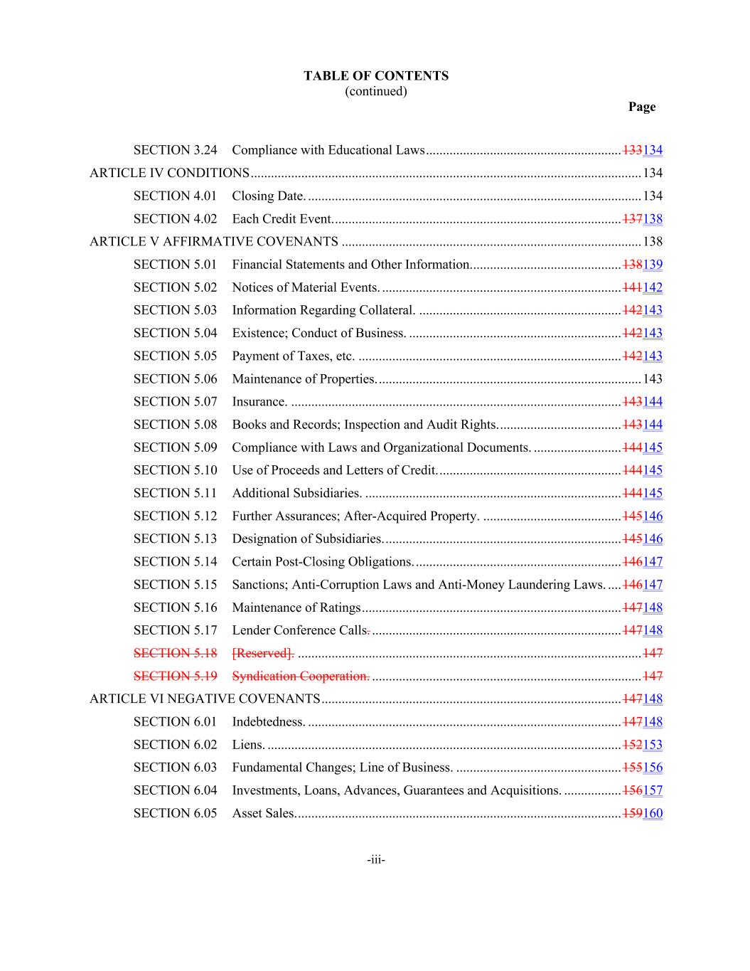 TABLE OF CONTENTS (continued) Page -iii- SECTION 3.24 Compliance with Educational Laws .......................................................... 133134 ARTICLE IV CONDITIONS .................................................................................................................... 134 SECTION 4.01 Closing Date. ................................................................................................... 134 SECTION 4.02 Each Credit Event. ..................................................................................... 137138 ARTICLE V AFFIRMATIVE COVENANTS ......................................................................................... 138 SECTION 5.01 Financial Statements and Other Information. ............................................ 138139 SECTION 5.02 Notices of Material Events. ....................................................................... 141142 SECTION 5.03 Information Regarding Collateral. ............................................................ 142143 SECTION 5.04 Existence; Conduct of Business. ............................................................... 142143 SECTION 5.05 Payment of Taxes, etc. .............................................................................. 142143 SECTION 5.06 Maintenance of Properties. .............................................................................. 143 SECTION 5.07 Insurance. .................................................................................................. 143144 SECTION 5.08 Books and Records; Inspection and Audit Rights. .................................... 143144 SECTION 5.09 Compliance with Laws and Organizational Documents. .......................... 144145 SECTION 5.10 Use of Proceeds and Letters of Credit. ...................................................... 144145 SECTION 5.11 Additional Subsidiaries. ............................................................................ 144145 SECTION 5.12 Further Assurances; After-Acquired Property. ......................................... 145146 SECTION 5.13 Designation of Subsidiaries. ...................................................................... 145146 SECTION 5.14 Certain Post-Closing Obligations. ............................................................. 146147 SECTION 5.15 Sanctions; Anti-Corruption Laws and Anti-Money Laundering Laws. .... 146147 SECTION 5.16 Maintenance of Ratings ............................................................................. 147148 SECTION 5.17 Lender Conference Calls. .......................................................................... 147148 SECTION 5.18 [Reserved]. ...................................................................................................... 147 SECTION 5.19 Syndication Cooperation. ................................................................................ 147 ARTICLE VI NEGATIVE COVENANTS ......................................................................................... 147148 SECTION 6.01 Indebtedness. ............................................................................................. 147148 SECTION 6.02 Liens. ......................................................................................................... 152153 SECTION 6.03 Fundamental Changes; Line of Business. ................................................. 155156 SECTION 6.04 Investments, Loans, Advances, Guarantees and Acquisitions. ................. 156157 SECTION 6.05 Asset Sales. ................................................................................................ 159160