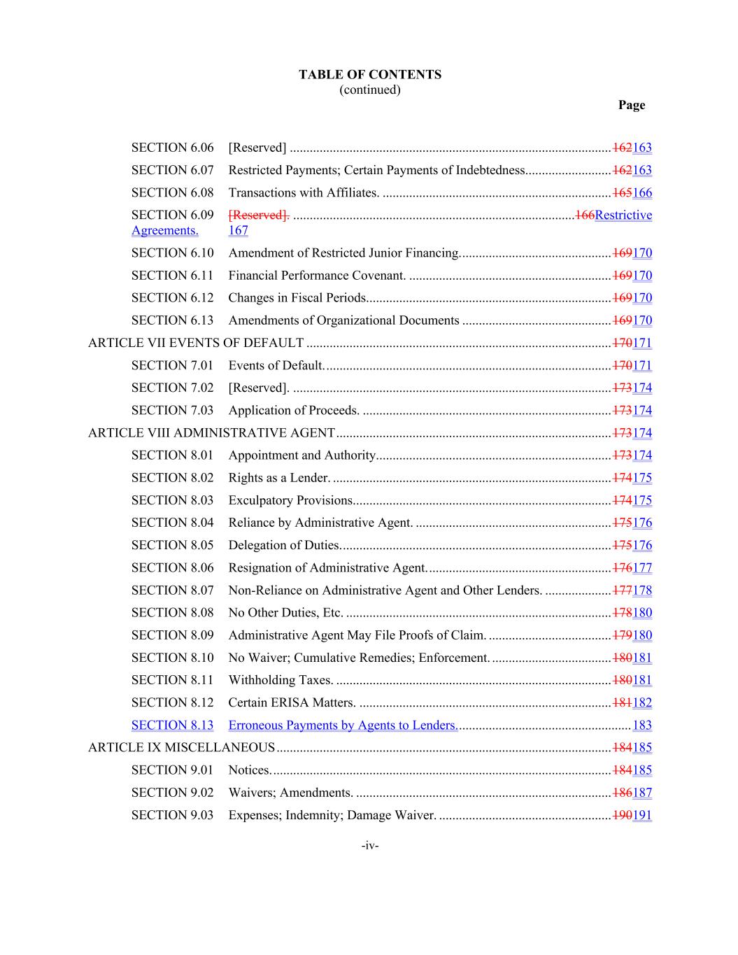 TABLE OF CONTENTS (continued) Page -iv- SECTION 6.06 [Reserved] ................................................................................................. 162163 SECTION 6.07 Restricted Payments; Certain Payments of Indebtedness. ......................... 162163 SECTION 6.08 Transactions with Affiliates. ..................................................................... 165166 SECTION 6.09 [Reserved]. ..................................................................................... 166Restrictive Agreements. 167 SECTION 6.10 Amendment of Restricted Junior Financing. ............................................. 169170 SECTION 6.11 Financial Performance Covenant. ............................................................. 169170 SECTION 6.12 Changes in Fiscal Periods. ......................................................................... 169170 SECTION 6.13 Amendments of Organizational Documents ............................................. 169170 ARTICLE VII EVENTS OF DEFAULT ............................................................................................ 170171 SECTION 7.01 Events of Default. ...................................................................................... 170171 SECTION 7.02 [Reserved]. ................................................................................................ 173174 SECTION 7.03 Application of Proceeds. ........................................................................... 173174 ARTICLE VIII ADMINISTRATIVE AGENT ................................................................................... 173174 SECTION 8.01 Appointment and Authority. ...................................................................... 173174 SECTION 8.02 Rights as a Lender. .................................................................................... 174175 SECTION 8.03 Exculpatory Provisions. ............................................................................. 174175 SECTION 8.04 Reliance by Administrative Agent. ........................................................... 175176 SECTION 8.05 Delegation of Duties. ................................................................................. 175176 SECTION 8.06 Resignation of Administrative Agent. ....................................................... 176177 SECTION 8.07 Non-Reliance on Administrative Agent and Other Lenders. .................... 177178 SECTION 8.08 No Other Duties, Etc. ................................................................................ 178180 SECTION 8.09 Administrative Agent May File Proofs of Claim. ..................................... 179180 SECTION 8.10 No Waiver; Cumulative Remedies; Enforcement. .................................... 180181 SECTION 8.11 Withholding Taxes. ................................................................................... 180181 SECTION 8.12 Certain ERISA Matters. ............................................................................ 181182 SECTION 8.13 Erroneous Payments by Agents to Lenders. .................................................... 183 ARTICLE IX MISCELLANEOUS ..................................................................................................... 184185 SECTION 9.01 Notices. ...................................................................................................... 184185 SECTION 9.02 Waivers; Amendments. ............................................................................. 186187 SECTION 9.03 Expenses; Indemnity; Damage Waiver. .................................................... 190191