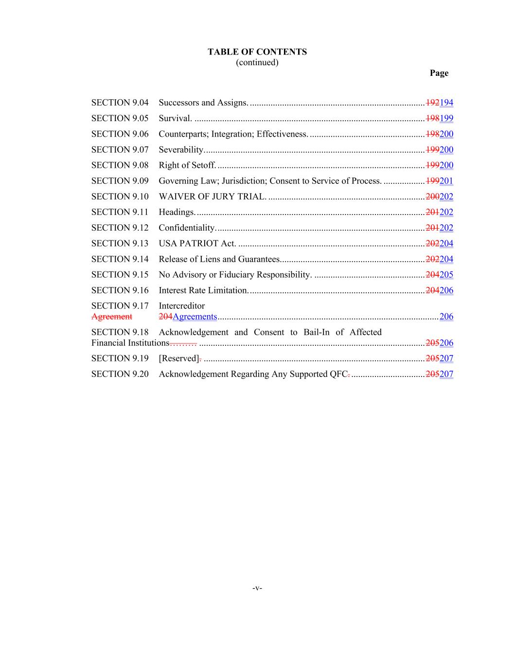 TABLE OF CONTENTS (continued) Page -v- SECTION 9.04 Successors and Assigns. ............................................................................ 192194 SECTION 9.05 Survival. .................................................................................................... 198199 SECTION 9.06 Counterparts; Integration; Effectiveness. .................................................. 198200 SECTION 9.07 Severability. ............................................................................................... 199200 SECTION 9.08 Right of Setoff. .......................................................................................... 199200 SECTION 9.09 Governing Law; Jurisdiction; Consent to Service of Process. .................. 199201 SECTION 9.10 WAIVER OF JURY TRIAL. .................................................................... 200202 SECTION 9.11 Headings. ................................................................................................... 201202 SECTION 9.12 Confidentiality. .......................................................................................... 201202 SECTION 9.13 USA PATRIOT Act. ................................................................................. 202204 SECTION 9.14 Release of Liens and Guarantees. .............................................................. 202204 SECTION 9.15 No Advisory or Fiduciary Responsibility. ................................................ 204205 SECTION 9.16 Interest Rate Limitation. ............................................................................ 204206 SECTION 9.17 Intercreditor Agreement 204Agreements ................................................................................................ 206 SECTION 9.18 Acknowledgement and Consent to Bail-In of Affected Financial Institutions……… .................................................................................................. 205206 SECTION 9.19 [Reserved]. ................................................................................................ 205207 SECTION 9.20 Acknowledgement Regarding Any Supported QFC. ................................ 205207