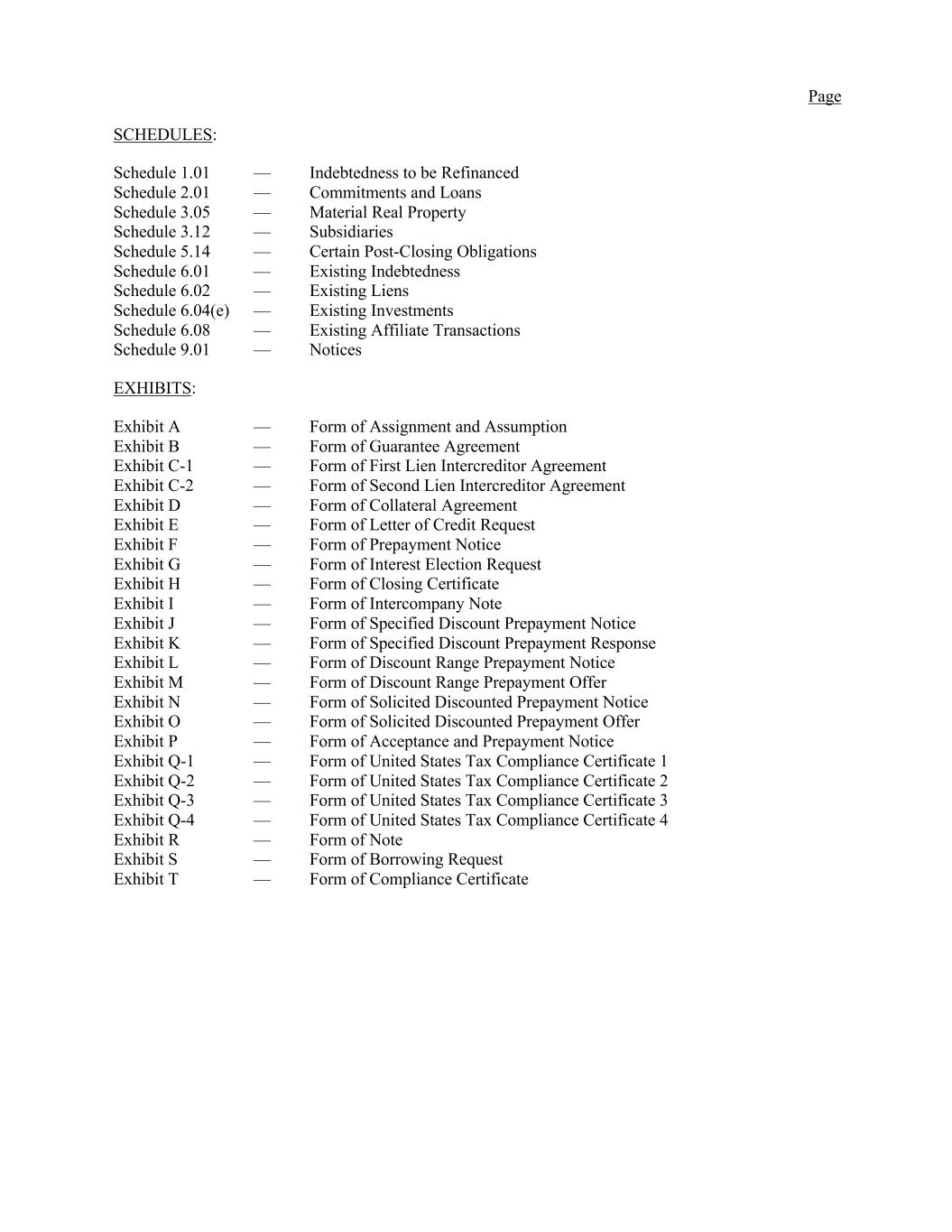 Page SCHEDULES: Schedule 1.01 — Indebtedness to be Refinanced Schedule 2.01 — Commitments and Loans Schedule 3.05 — Material Real Property Schedule 3.12 — Subsidiaries Schedule 5.14 — Certain Post-Closing Obligations Schedule 6.01 — Existing Indebtedness Schedule 6.02 — Existing Liens Schedule 6.04(e) — Existing Investments Schedule 6.08 — Existing Affiliate Transactions Schedule 9.01 — Notices EXHIBITS: Exhibit A — Form of Assignment and Assumption Exhibit B — Form of Guarantee Agreement Exhibit C-1 — Form of First Lien Intercreditor Agreement Exhibit C-2 — Form of Second Lien Intercreditor Agreement Exhibit D — Form of Collateral Agreement Exhibit E — Form of Letter of Credit Request Exhibit F — Form of Prepayment Notice Exhibit G — Form of Interest Election Request Exhibit H — Form of Closing Certificate Exhibit I — Form of Intercompany Note Exhibit J — Form of Specified Discount Prepayment Notice Exhibit K — Form of Specified Discount Prepayment Response Exhibit L — Form of Discount Range Prepayment Notice Exhibit M — Form of Discount Range Prepayment Offer Exhibit N — Form of Solicited Discounted Prepayment Notice Exhibit O — Form of Solicited Discounted Prepayment Offer Exhibit P — Form of Acceptance and Prepayment Notice Exhibit Q-1 — Form of United States Tax Compliance Certificate 1 Exhibit Q-2 — Form of United States Tax Compliance Certificate 2 Exhibit Q-3 — Form of United States Tax Compliance Certificate 3 Exhibit Q-4 — Form of United States Tax Compliance Certificate 4 Exhibit R — Form of Note Exhibit S — Form of Borrowing Request Exhibit T — Form of Compliance Certificate