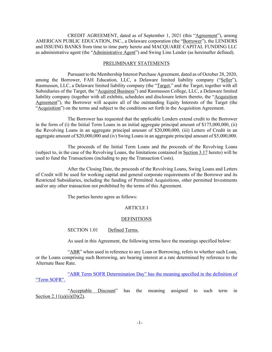 -1- CREDIT AGREEMENT, dated as of September 1, 2021 (this “Agreement”), among AMERICAN PUBLIC EDUCATION, INC., a Delaware corporation (the “Borrower”), the LENDERS and ISSUING BANKS from time to time party hereto and MACQUARIE CAPITAL FUNDING LLC as administrative agent (the “Administrative Agent”) and Swing Line Lender (as hereinafter defined). PRELIMINARY STATEMENTS Pursuant to the Membership Interest Purchase Agreement, dated as of October 28, 2020, among the Borrower, FAH Education, LLC, a Delaware limited liability company (“Seller”), Rasmussen, LLC, a Delaware limited liability company (the “Target,” and the Target, together with all Subsidiaries of the Target, the “Acquired Business”) and Rasmussen College, LLC, a Delaware limited liability company (together with all exhibits, schedules and disclosure letters thereto, the “Acquisition Agreement”), the Borrower will acquire all of the outstanding Equity Interests of the Target (the “Acquisition”) on the terms and subject to the conditions set forth in the Acquisition Agreement. The Borrower has requested that the applicable Lenders extend credit to the Borrower in the form of (i) the Initial Term Loans in an initial aggregate principal amount of $175,000,000, (ii) the Revolving Loans in an aggregate principal amount of $20,000,000, (iii) Letters of Credit in an aggregate amount of $20,000,000 and (iv) Swing Loans in an aggregate principal amount of $5,000,000. The proceeds of the Initial Term Loans and the proceeds of the Revolving Loans (subject to, in the case of the Revolving Loans, the limitations contained in Section 3.17 hereto) will be used to fund the Transactions (including to pay the Transaction Costs). After the Closing Date, the proceeds of the Revolving Loans, Swing Loans and Letters of Credit will be used for working capital and general corporate requirements of the Borrower and its Restricted Subsidiaries, including the funding of Permitted Acquisitions, other permitted Investments and/or any other transaction not prohibited by the terms of this Agreement. The parties hereto agree as follows: ARTICLE I DEFINITIONS SECTION 1.01 Defined Terms. As used in this Agreement, the following terms have the meanings specified below: “ABR” when used in reference to any Loan or Borrowing, refers to whether such Loan, or the Loans comprising such Borrowing, are bearing interest at a rate determined by reference to the Alternate Base Rate. “ABR Term SOFR Determination Day” has the meaning specified in the definition of “Term SOFR”. “Acceptable Discount” has the meaning assigned to such term in Section 2.11(a)(ii)(D)(2).