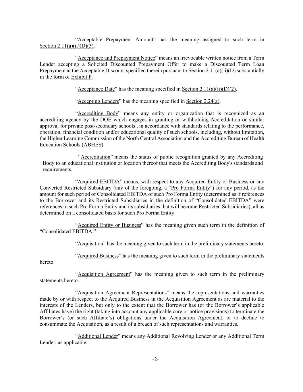 -2- “Acceptable Prepayment Amount” has the meaning assigned to such term in Section 2.11(a)(ii)(D)(3). “Acceptance and Prepayment Notice” means an irrevocable written notice from a Term Lender accepting a Solicited Discounted Prepayment Offer to make a Discounted Term Loan Prepayment at the Acceptable Discount specified therein pursuant to Section 2.11(a)(ii)(D) substantially in the form of Exhibit P. “Acceptance Date” has the meaning specified in Section 2.11(a)(ii)(D)(2). “Accepting Lenders” has the meaning specified in Section 2.24(a). “Accrediting Body” means any entity or organization that is recognized as an accrediting agency by the DOE which engages in granting or withholding Accreditation or similar approval for private post-secondary schools , in accordance with standards relating to the performance, operation, financial condition and/or educational quality of such schools, including, without limitation, the Higher Learning Commission of the North Central Association and the Accrediting Bureau of Health Education Schools (ABHES). “Accreditation” means the status of public recognition granted by any Accrediting Body to an educational institution or location thereof that meets the Accrediting Body's standards and requirements. “Acquired EBITDA” means, with respect to any Acquired Entity or Business or any Converted Restricted Subsidiary (any of the foregoing, a “Pro Forma Entity”) for any period, as the amount for such period of Consolidated EBITDA of such Pro Forma Entity (determined as if references to the Borrower and its Restricted Subsidiaries in the definition of “Consolidated EBITDA” were references to such Pro Forma Entity and its subsidiaries that will become Restricted Subsidiaries), all as determined on a consolidated basis for such Pro Forma Entity. “Acquired Entity or Business” has the meaning given such term in the definition of “Consolidated EBITDA.” “Acquisition” has the meaning given to such term in the preliminary statements hereto. “Acquired Business” has the meaning given to such term in the preliminary statements hereto. “Acquisition Agreement” has the meaning given to such term in the preliminary statements hereto. “Acquisition Agreement Representations” means the representations and warranties made by or with respect to the Acquired Business in the Acquisition Agreement as are material to the interests of the Lenders, but only to the extent that the Borrower has (or the Borrower’s applicable Affiliates have) the right (taking into account any applicable cure or notice provisions) to terminate the Borrower’s (or such Affiliate’s) obligations under the Acquisition Agreement, or to decline to consummate the Acquisition, as a result of a breach of such representations and warranties. “Additional Lender” means any Additional Revolving Lender or any Additional Term Lender, as applicable.