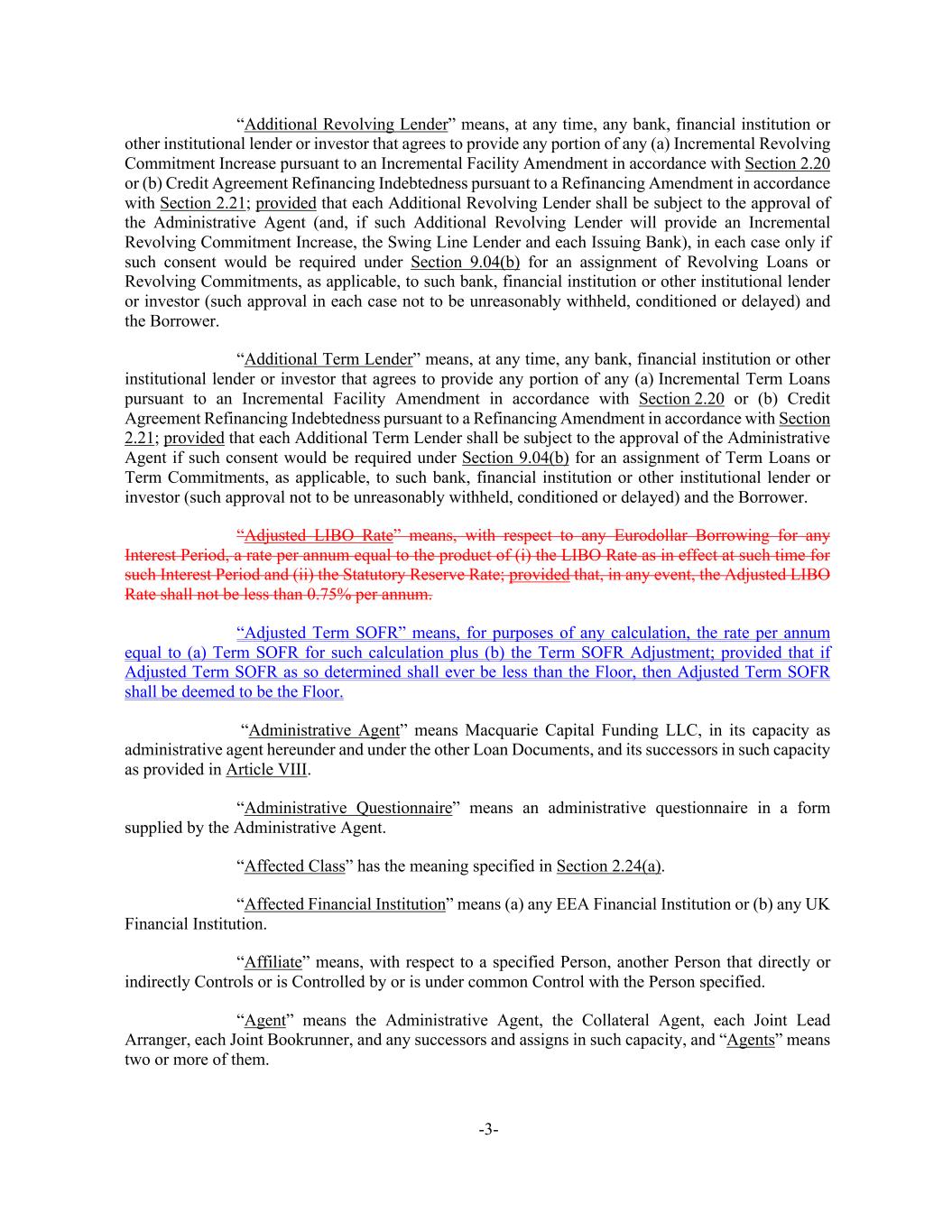 -3- “Additional Revolving Lender” means, at any time, any bank, financial institution or other institutional lender or investor that agrees to provide any portion of any (a) Incremental Revolving Commitment Increase pursuant to an Incremental Facility Amendment in accordance with Section 2.20 or (b) Credit Agreement Refinancing Indebtedness pursuant to a Refinancing Amendment in accordance with Section 2.21; provided that each Additional Revolving Lender shall be subject to the approval of the Administrative Agent (and, if such Additional Revolving Lender will provide an Incremental Revolving Commitment Increase, the Swing Line Lender and each Issuing Bank), in each case only if such consent would be required under Section 9.04(b) for an assignment of Revolving Loans or Revolving Commitments, as applicable, to such bank, financial institution or other institutional lender or investor (such approval in each case not to be unreasonably withheld, conditioned or delayed) and the Borrower. “Additional Term Lender” means, at any time, any bank, financial institution or other institutional lender or investor that agrees to provide any portion of any (a) Incremental Term Loans pursuant to an Incremental Facility Amendment in accordance with Section 2.20 or (b) Credit Agreement Refinancing Indebtedness pursuant to a Refinancing Amendment in accordance with Section 2.21; provided that each Additional Term Lender shall be subject to the approval of the Administrative Agent if such consent would be required under Section 9.04(b) for an assignment of Term Loans or Term Commitments, as applicable, to such bank, financial institution or other institutional lender or investor (such approval not to be unreasonably withheld, conditioned or delayed) and the Borrower. “Adjusted LIBO Rate” means, with respect to any Eurodollar Borrowing for any Interest Period, a rate per annum equal to the product of (i) the LIBO Rate as in effect at such time for such Interest Period and (ii) the Statutory Reserve Rate; provided that, in any event, the Adjusted LIBO Rate shall not be less than 0.75% per annum. “Adjusted Term SOFR” means, for purposes of any calculation, the rate per annum equal to (a) Term SOFR for such calculation plus (b) the Term SOFR Adjustment; provided that if Adjusted Term SOFR as so determined shall ever be less than the Floor, then Adjusted Term SOFR shall be deemed to be the Floor. “Administrative Agent” means Macquarie Capital Funding LLC, in its capacity as administrative agent hereunder and under the other Loan Documents, and its successors in such capacity as provided in Article VIII. “Administrative Questionnaire” means an administrative questionnaire in a form supplied by the Administrative Agent. “Affected Class” has the meaning specified in Section 2.24(a). “Affected Financial Institution” means (a) any EEA Financial Institution or (b) any UK Financial Institution. “Affiliate” means, with respect to a specified Person, another Person that directly or indirectly Controls or is Controlled by or is under common Control with the Person specified. “Agent” means the Administrative Agent, the Collateral Agent, each Joint Lead Arranger, each Joint Bookrunner, and any successors and assigns in such capacity, and “Agents” means two or more of them.