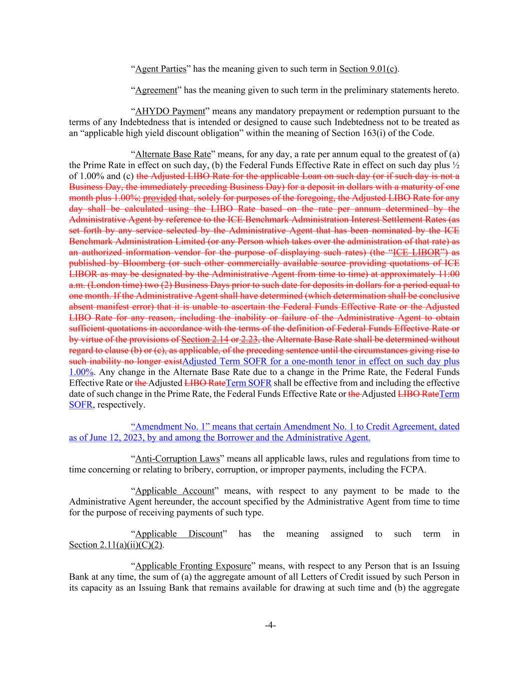 -4- “Agent Parties” has the meaning given to such term in Section 9.01(c). “Agreement” has the meaning given to such term in the preliminary statements hereto. “AHYDO Payment” means any mandatory prepayment or redemption pursuant to the terms of any Indebtedness that is intended or designed to cause such Indebtedness not to be treated as an “applicable high yield discount obligation” within the meaning of Section 163(i) of the Code. “Alternate Base Rate” means, for any day, a rate per annum equal to the greatest of (a) the Prime Rate in effect on such day, (b) the Federal Funds Effective Rate in effect on such day plus ½ of 1.00% and (c) the Adjusted LIBO Rate for the applicable Loan on such day (or if such day is not a Business Day, the immediately preceding Business Day) for a deposit in dollars with a maturity of one month plus 1.00%; provided that, solely for purposes of the foregoing, the Adjusted LIBO Rate for any day shall be calculated using the LIBO Rate based on the rate per annum determined by the Administrative Agent by reference to the ICE Benchmark Administration Interest Settlement Rates (as set forth by any service selected by the Administrative Agent that has been nominated by the ICE Benchmark Administration Limited (or any Person which takes over the administration of that rate) as an authorized information vendor for the purpose of displaying such rates) (the “ICE LIBOR”) as published by Bloomberg (or such other commercially available source providing quotations of ICE LIBOR as may be designated by the Administrative Agent from time to time) at approximately 11:00 a.m. (London time) two (2) Business Days prior to such date for deposits in dollars for a period equal to one month. If the Administrative Agent shall have determined (which determination shall be conclusive absent manifest error) that it is unable to ascertain the Federal Funds Effective Rate or the Adjusted LIBO Rate for any reason, including the inability or failure of the Administrative Agent to obtain sufficient quotations in accordance with the terms of the definition of Federal Funds Effective Rate or by virtue of the provisions of Section 2.14 or 2.23, the Alternate Base Rate shall be determined without regard to clause (b) or (c), as applicable, of the preceding sentence until the circumstances giving rise to such inability no longer existAdjusted Term SOFR for a one-month tenor in effect on such day plus 1.00%. Any change in the Alternate Base Rate due to a change in the Prime Rate, the Federal Funds Effective Rate or the Adjusted LIBO RateTerm SOFR shall be effective from and including the effective date of such change in the Prime Rate, the Federal Funds Effective Rate or the Adjusted LIBO RateTerm SOFR, respectively. “Amendment No. 1” means that certain Amendment No. 1 to Credit Agreement, dated as of June 12, 2023, by and among the Borrower and the Administrative Agent. “Anti-Corruption Laws” means all applicable laws, rules and regulations from time to time concerning or relating to bribery, corruption, or improper payments, including the FCPA. “Applicable Account” means, with respect to any payment to be made to the Administrative Agent hereunder, the account specified by the Administrative Agent from time to time for the purpose of receiving payments of such type. “Applicable Discount” has the meaning assigned to such term in Section 2.11(a)(ii)(C)(2). “Applicable Fronting Exposure” means, with respect to any Person that is an Issuing Bank at any time, the sum of (a) the aggregate amount of all Letters of Credit issued by such Person in its capacity as an Issuing Bank that remains available for drawing at such time and (b) the aggregate