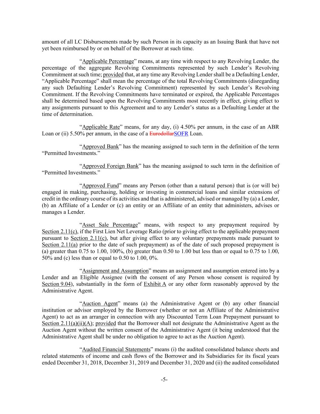 -5- amount of all LC Disbursements made by such Person in its capacity as an Issuing Bank that have not yet been reimbursed by or on behalf of the Borrower at such time. “Applicable Percentage” means, at any time with respect to any Revolving Lender, the percentage of the aggregate Revolving Commitments represented by such Lender’s Revolving Commitment at such time; provided that, at any time any Revolving Lender shall be a Defaulting Lender, “Applicable Percentage” shall mean the percentage of the total Revolving Commitments (disregarding any such Defaulting Lender’s Revolving Commitment) represented by such Lender’s Revolving Commitment. If the Revolving Commitments have terminated or expired, the Applicable Percentages shall be determined based upon the Revolving Commitments most recently in effect, giving effect to any assignments pursuant to this Agreement and to any Lender’s status as a Defaulting Lender at the time of determination. “Applicable Rate” means, for any day, (i) 4.50% per annum, in the case of an ABR Loan or (ii) 5.50% per annum, in the case of a EurodollarSOFR Loan. “Approved Bank” has the meaning assigned to such term in the definition of the term “Permitted Investments.” “Approved Foreign Bank” has the meaning assigned to such term in the definition of “Permitted Investments.” “Approved Fund” means any Person (other than a natural person) that is (or will be) engaged in making, purchasing, holding or investing in commercial loans and similar extensions of credit in the ordinary course of its activities and that is administered, advised or managed by (a) a Lender, (b) an Affiliate of a Lender or (c) an entity or an Affiliate of an entity that administers, advises or manages a Lender. “Asset Sale Percentage” means, with respect to any prepayment required by Section 2.11(c), if the First Lien Net Leverage Ratio (prior to giving effect to the applicable prepayment pursuant to Section 2.11(c), but after giving effect to any voluntary prepayments made pursuant to Section 2.11(a) prior to the date of such prepayment) as of the date of such proposed prepayment is (a) greater than 0.75 to 1.00, 100%, (b) greater than 0.50 to 1.00 but less than or equal to 0.75 to 1.00, 50% and (c) less than or equal to 0.50 to 1.00, 0%. “Assignment and Assumption” means an assignment and assumption entered into by a Lender and an Eligible Assignee (with the consent of any Person whose consent is required by Section 9.04), substantially in the form of Exhibit A or any other form reasonably approved by the Administrative Agent. “Auction Agent” means (a) the Administrative Agent or (b) any other financial institution or advisor employed by the Borrower (whether or not an Affiliate of the Administrative Agent) to act as an arranger in connection with any Discounted Term Loan Prepayment pursuant to Section 2.11(a)(ii)(A); provided that the Borrower shall not designate the Administrative Agent as the Auction Agent without the written consent of the Administrative Agent (it being understood that the Administrative Agent shall be under no obligation to agree to act as the Auction Agent). “Audited Financial Statements” means (i) the audited consolidated balance sheets and related statements of income and cash flows of the Borrower and its Subsidiaries for its fiscal years ended December 31, 2018, December 31, 2019 and December 31, 2020 and (ii) the audited consolidated