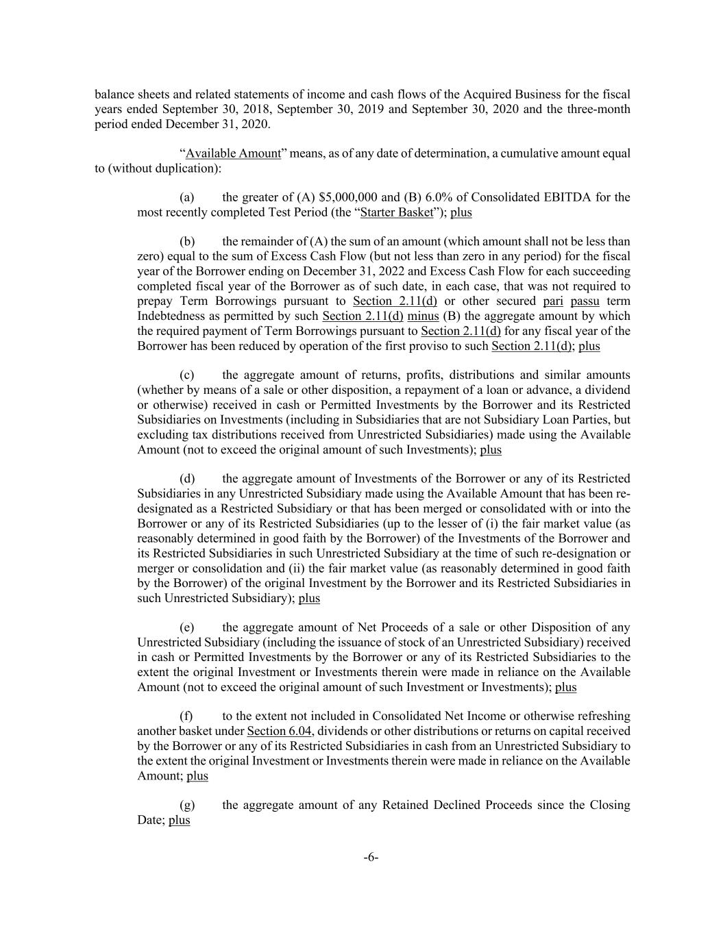 -6- balance sheets and related statements of income and cash flows of the Acquired Business for the fiscal years ended September 30, 2018, September 30, 2019 and September 30, 2020 and the three-month period ended December 31, 2020. “Available Amount” means, as of any date of determination, a cumulative amount equal to (without duplication): (a) the greater of (A) $5,000,000 and (B) 6.0% of Consolidated EBITDA for the most recently completed Test Period (the “Starter Basket”); plus (b) the remainder of (A) the sum of an amount (which amount shall not be less than zero) equal to the sum of Excess Cash Flow (but not less than zero in any period) for the fiscal year of the Borrower ending on December 31, 2022 and Excess Cash Flow for each succeeding completed fiscal year of the Borrower as of such date, in each case, that was not required to prepay Term Borrowings pursuant to Section 2.11(d) or other secured pari passu term Indebtedness as permitted by such Section 2.11(d) minus (B) the aggregate amount by which the required payment of Term Borrowings pursuant to Section 2.11(d) for any fiscal year of the Borrower has been reduced by operation of the first proviso to such Section 2.11(d); plus (c) the aggregate amount of returns, profits, distributions and similar amounts (whether by means of a sale or other disposition, a repayment of a loan or advance, a dividend or otherwise) received in cash or Permitted Investments by the Borrower and its Restricted Subsidiaries on Investments (including in Subsidiaries that are not Subsidiary Loan Parties, but excluding tax distributions received from Unrestricted Subsidiaries) made using the Available Amount (not to exceed the original amount of such Investments); plus (d) the aggregate amount of Investments of the Borrower or any of its Restricted Subsidiaries in any Unrestricted Subsidiary made using the Available Amount that has been re- designated as a Restricted Subsidiary or that has been merged or consolidated with or into the Borrower or any of its Restricted Subsidiaries (up to the lesser of (i) the fair market value (as reasonably determined in good faith by the Borrower) of the Investments of the Borrower and its Restricted Subsidiaries in such Unrestricted Subsidiary at the time of such re-designation or merger or consolidation and (ii) the fair market value (as reasonably determined in good faith by the Borrower) of the original Investment by the Borrower and its Restricted Subsidiaries in such Unrestricted Subsidiary); plus (e) the aggregate amount of Net Proceeds of a sale or other Disposition of any Unrestricted Subsidiary (including the issuance of stock of an Unrestricted Subsidiary) received in cash or Permitted Investments by the Borrower or any of its Restricted Subsidiaries to the extent the original Investment or Investments therein were made in reliance on the Available Amount (not to exceed the original amount of such Investment or Investments); plus (f) to the extent not included in Consolidated Net Income or otherwise refreshing another basket under Section 6.04, dividends or other distributions or returns on capital received by the Borrower or any of its Restricted Subsidiaries in cash from an Unrestricted Subsidiary to the extent the original Investment or Investments therein were made in reliance on the Available Amount; plus (g) the aggregate amount of any Retained Declined Proceeds since the Closing Date; plus