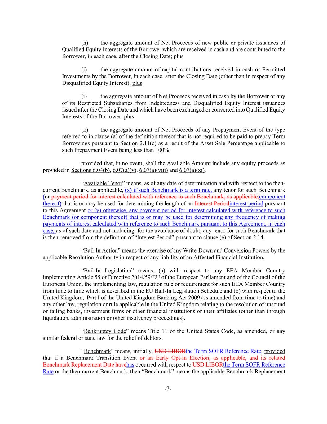 -7- (h) the aggregate amount of Net Proceeds of new public or private issuances of Qualified Equity Interests of the Borrower which are received in cash and are contributed to the Borrower, in each case, after the Closing Date; plus (i) the aggregate amount of capital contributions received in cash or Permitted Investments by the Borrower, in each case, after the Closing Date (other than in respect of any Disqualified Equity Interest); plus (j) the aggregate amount of Net Proceeds received in cash by the Borrower or any of its Restricted Subsidiaries from Indebtedness and Disqualified Equity Interest issuances issued after the Closing Date and which have been exchanged or converted into Qualified Equity Interests of the Borrower; plus (k) the aggregate amount of Net Proceeds of any Prepayment Event of the type referred to in clause (a) of the definition thereof that is not required to be paid to prepay Term Borrowings pursuant to Section 2.11(c) as a result of the Asset Sale Percentage applicable to such Prepayment Event being less than 100%; provided that, in no event, shall the Available Amount include any equity proceeds as provided in Sections 6.04(b), 6.07(a)(v), 6.07(a)(viii) and 6.07(a)(xi). “Available Tenor” means, as of any date of determination and with respect to the then- current Benchmark, as applicable, (x) if such Benchmark is a term rate, any tenor for such Benchmark (or payment period for interest calculated with reference to such Benchmark, as applicable,component thereof) that is or may be used for determining the length of an Interest Periodinterest period pursuant to this Agreement or (y) otherwise, any payment period for interest calculated with reference to such Benchmark (or component thereof) that is or may be used for determining any frequency of making payments of interest calculated with reference to such Benchmark pursuant to this Agreement, in each case, as of such date and not including, for the avoidance of doubt, any tenor for such Benchmark that is then-removed from the definition of “Interest Period” pursuant to clause (e) of Section 2.14. “Bail-In Action” means the exercise of any Write-Down and Conversion Powers by the applicable Resolution Authority in respect of any liability of an Affected Financial Institution. “Bail-In Legislation” means, (a) with respect to any EEA Member Country implementing Article 55 of Directive 2014/59/EU of the European Parliament and of the Council of the European Union, the implementing law, regulation rule or requirement for such EEA Member Country from time to time which is described in the EU Bail-In Legislation Schedule and (b) with respect to the United Kingdom, Part I of the United Kingdom Banking Act 2009 (as amended from time to time) and any other law, regulation or rule applicable in the United Kingdom relating to the resolution of unsound or failing banks, investment firms or other financial institutions or their affiliates (other than through liquidation, administration or other insolvency proceedings). “Bankruptcy Code” means Title 11 of the United States Code, as amended, or any similar federal or state law for the relief of debtors. “Benchmark” means, initially, USD LIBORthe Term SOFR Reference Rate; provided that if a Benchmark Transition Event or an Early Opt-in Election, as applicable, and its related Benchmark Replacement Date havehas occurred with respect to USD LIBORthe Term SOFR Reference Rate or the then-current Benchmark, then “Benchmark” means the applicable Benchmark Replacement