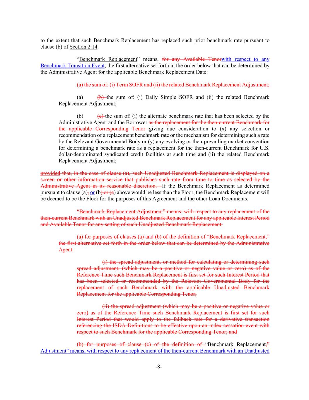 -8- to the extent that such Benchmark Replacement has replaced such prior benchmark rate pursuant to clause (b) of Section 2.14. “Benchmark Replacement” means, for any Available Tenorwith respect to any Benchmark Transition Event, the first alternative set forth in the order below that can be determined by the Administrative Agent for the applicable Benchmark Replacement Date: (a) the sum of: (i) Term SOFR and (ii) the related Benchmark Replacement Adjustment; (a) (b) the sum of: (i) Daily Simple SOFR and (ii) the related Benchmark Replacement Adjustment; (b) (c) the sum of: (i) the alternate benchmark rate that has been selected by the Administrative Agent and the Borrower as the replacement for the then-current Benchmark for the applicable Corresponding Tenor giving due consideration to (x) any selection or recommendation of a replacement benchmark rate or the mechanism for determining such a rate by the Relevant Governmental Body or (y) any evolving or then-prevailing market convention for determining a benchmark rate as a replacement for the then-current Benchmark for U.S. dollar-denominated syndicated credit facilities at such time and (ii) the related Benchmark Replacement Adjustment; provided that, in the case of clause (a), such Unadjusted Benchmark Replacement is displayed on a screen or other information service that publishes such rate from time to time as selected by the Administrative Agent in its reasonable discretion. If the Benchmark Replacement as determined pursuant to clause (a), or (b) or (c) above would be less than the Floor, the Benchmark Replacement will be deemed to be the Floor for the purposes of this Agreement and the other Loan Documents. “Benchmark Replacement Adjustment” means, with respect to any replacement of the then-current Benchmark with an Unadjusted Benchmark Replacement for any applicable Interest Period and Available Tenor for any setting of such Unadjusted Benchmark Replacement: (a) for purposes of clauses (a) and (b) of the definition of “Benchmark Replacement,” the first alternative set forth in the order below that can be determined by the Administrative Agent: (i) the spread adjustment, or method for calculating or determining such spread adjustment, (which may be a positive or negative value or zero) as of the Reference Time such Benchmark Replacement is first set for such Interest Period that has been selected or recommended by the Relevant Governmental Body for the replacement of such Benchmark with the applicable Unadjusted Benchmark Replacement for the applicable Corresponding Tenor; (ii) the spread adjustment (which may be a positive or negative value or zero) as of the Reference Time such Benchmark Replacement is first set for such Interest Period that would apply to the fallback rate for a derivative transaction referencing the ISDA Definitions to be effective upon an index cessation event with respect to such Benchmark for the applicable Corresponding Tenor; and (b) for purposes of clause (c) of the definition of “Benchmark Replacement,” Adjustment” means, with respect to any replacement of the then-current Benchmark with an Unadjusted