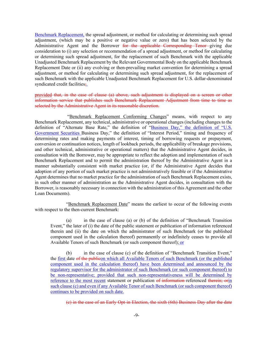 -9- Benchmark Replacement, the spread adjustment, or method for calculating or determining such spread adjustment, (which may be a positive or negative value or zero) that has been selected by the Administrative Agent and the Borrower for the applicable Corresponding Tenor giving due consideration to (i) any selection or recommendation of a spread adjustment, or method for calculating or determining such spread adjustment, for the replacement of such Benchmark with the applicable Unadjusted Benchmark Replacement by the Relevant Governmental Body on the applicable Benchmark Replacement Date or (ii) any evolving or then-prevailing market convention for determining a spread adjustment, or method for calculating or determining such spread adjustment, for the replacement of such Benchmark with the applicable Unadjusted Benchmark Replacement for U.S. dollar-denominated syndicated credit facilities;. provided that, in the case of clause (a) above, such adjustment is displayed on a screen or other information service that publishes such Benchmark Replacement Adjustment from time to time as selected by the Administrative Agent in its reasonable discretion. “Benchmark Replacement Conforming Changes” means, with respect to any Benchmark Replacement, any technical, administrative or operational changes (including changes to the definition of “Alternate Base Rate,” the definition of “Business Day,” the definition of “U.S. Government Securities Business Day,” the definition of “Interest Period,” timing and frequency of determining rates and making payments of interest, timing of borrowing requests or prepayment, conversion or continuation notices, length of lookback periods, the applicability of breakage provisions, and other technical, administrative or operational matters) that the Administrative Agent decides, in consultation with the Borrower, may be appropriate to reflect the adoption and implementation of such Benchmark Replacement and to permit the administration thereof by the Administrative Agent in a manner substantially consistent with market practice (or, if the Administrative Agent decides that adoption of any portion of such market practice is not administratively feasible or if the Administrative Agent determines that no market practice for the administration of such Benchmark Replacement exists, in such other manner of administration as the Administrative Agent decides, in consultation with the Borrower, is reasonably necessary in connection with the administration of this Agreement and the other Loan Documents). “Benchmark Replacement Date” means the earliest to occur of the following events with respect to the then-current Benchmark: (a) in the case of clause (a) or (b) of the definition of “Benchmark Transition Event,” the later of (i) the date of the public statement or publication of information referenced therein and (ii) the date on which the administrator of such Benchmark (or the published component used in the calculation thereof) permanently or indefinitely ceases to provide all Available Tenors of such Benchmark (or such component thereof); or (b) in the case of clause (c) of the definition of “Benchmark Transition Event,” the first date of the publicon which all Available Tenors of such Benchmark (or the published component used in the calculation thereof) have been determined and announced by the regulatory supervisor for the administrator of such Benchmark (or such component thereof) to be non-representative; provided that such non-representativeness will be determined by reference to the most recent statement or publication of information referenced therein; orin such clause (c) and even if any Available Tenor of such Benchmark (or such component thereof) continues to be provided on such date. (c) in the case of an Early Opt-in Election, the sixth (6th) Business Day after the date