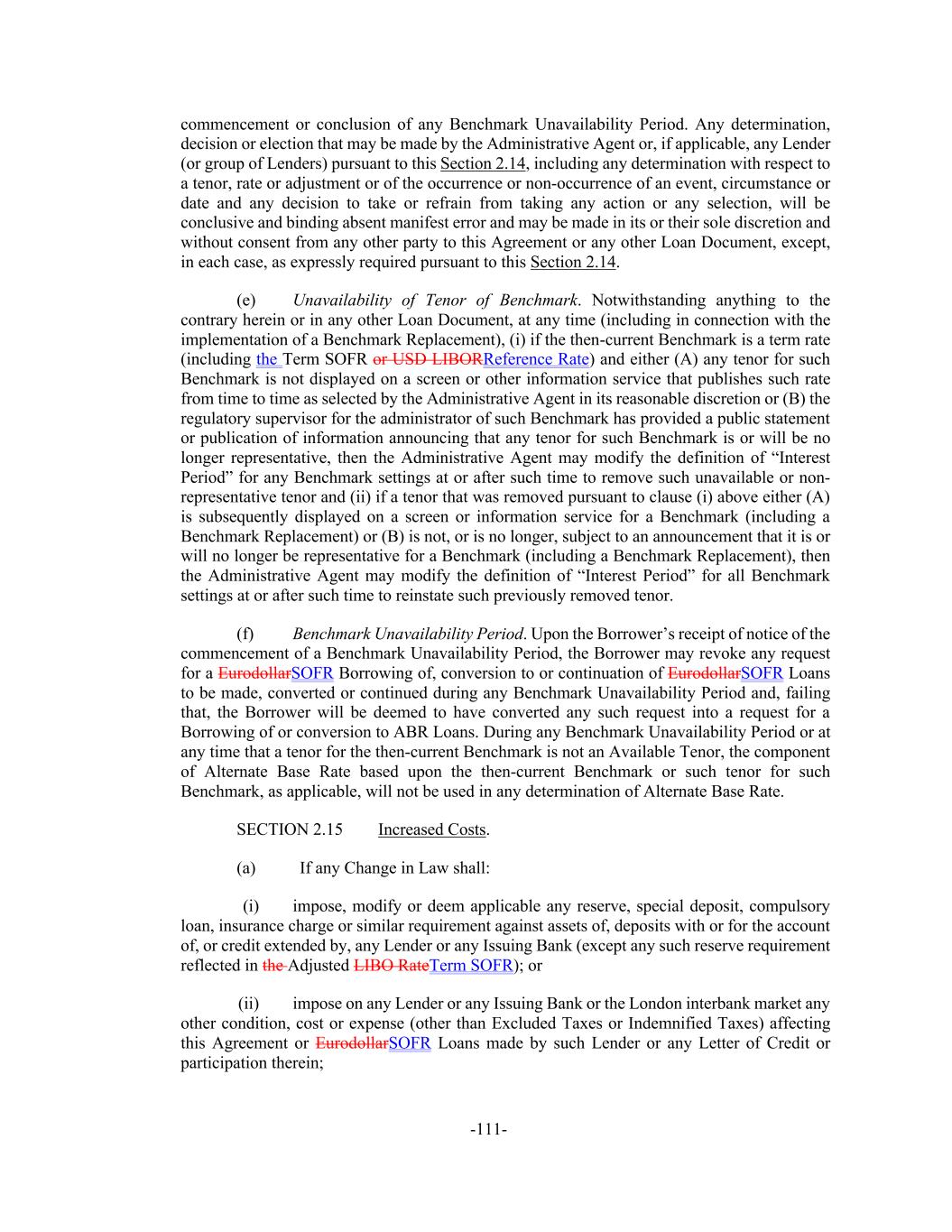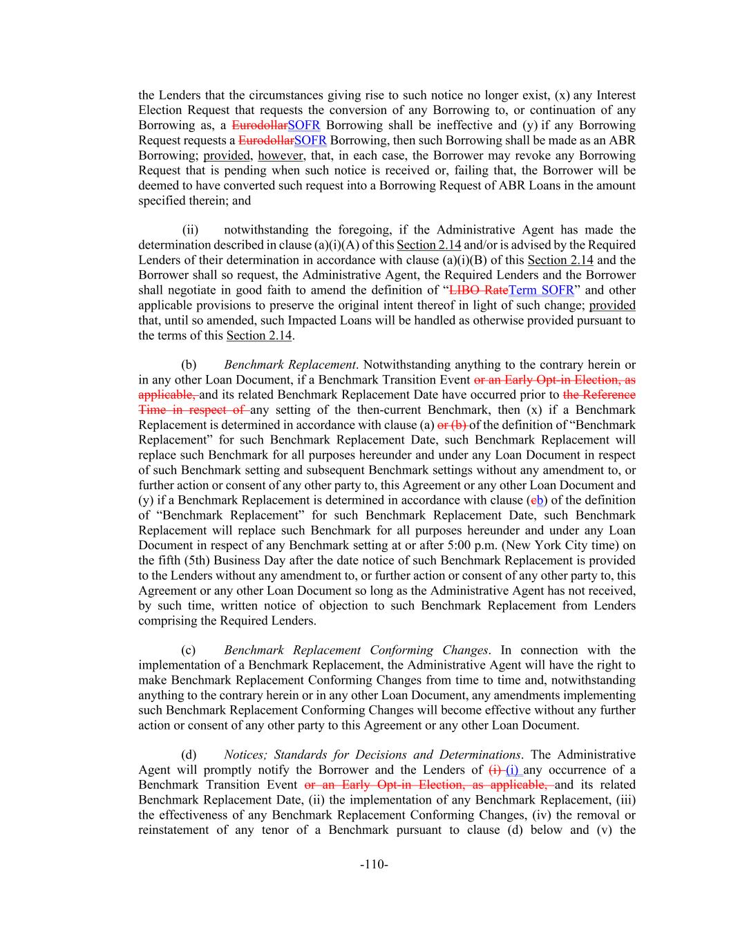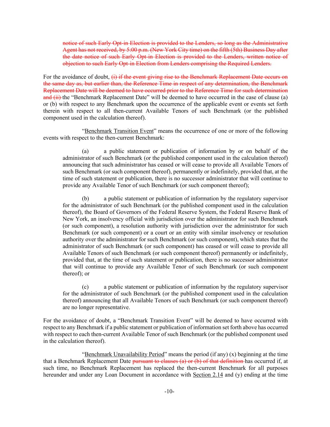 -10- notice of such Early Opt-in Election is provided to the Lenders, so long as the Administrative Agent has not received, by 5:00 p.m. (New York City time) on the fifth (5th) Business Day after the date notice of such Early Opt-in Election is provided to the Lenders, written notice of objection to such Early Opt-in Election from Lenders comprising the Required Lenders. For the avoidance of doubt, (i) if the event giving rise to the Benchmark Replacement Date occurs on the same day as, but earlier than, the Reference Time in respect of any determination, the Benchmark Replacement Date will be deemed to have occurred prior to the Reference Time for such determination and (ii) the “Benchmark Replacement Date” will be deemed to have occurred in the case of clause (a) or (b) with respect to any Benchmark upon the occurrence of the applicable event or events set forth therein with respect to all then-current Available Tenors of such Benchmark (or the published component used in the calculation thereof). “Benchmark Transition Event” means the occurrence of one or more of the following events with respect to the then-current Benchmark: (a) a public statement or publication of information by or on behalf of the administrator of such Benchmark (or the published component used in the calculation thereof) announcing that such administrator has ceased or will cease to provide all Available Tenors of such Benchmark (or such component thereof), permanently or indefinitely, provided that, at the time of such statement or publication, there is no successor administrator that will continue to provide any Available Tenor of such Benchmark (or such component thereof); (b) a public statement or publication of information by the regulatory supervisor for the administrator of such Benchmark (or the published component used in the calculation thereof), the Board of Governors of the Federal Reserve System, the Federal Reserve Bank of New York, an insolvency official with jurisdiction over the administrator for such Benchmark (or such component), a resolution authority with jurisdiction over the administrator for such Benchmark (or such component) or a court or an entity with similar insolvency or resolution authority over the administrator for such Benchmark (or such component), which states that the administrator of such Benchmark (or such component) has ceased or will cease to provide all Available Tenors of such Benchmark (or such component thereof) permanently or indefinitely, provided that, at the time of such statement or publication, there is no successor administrator that will continue to provide any Available Tenor of such Benchmark (or such component thereof); or (c) a public statement or publication of information by the regulatory supervisor for the administrator of such Benchmark (or the published component used in the calculation thereof) announcing that all Available Tenors of such Benchmark (or such component thereof) are no longer representative. For the avoidance of doubt, a “Benchmark Transition Event” will be deemed to have occurred with respect to any Benchmark if a public statement or publication of information set forth above has occurred with respect to each then-current Available Tenor of such Benchmark (or the published component used in the calculation thereof). “Benchmark Unavailability Period” means the period (if any) (x) beginning at the time that a Benchmark Replacement Date pursuant to clauses (a) or (b) of that definition has occurred if, at such time, no Benchmark Replacement has replaced the then-current Benchmark for all purposes hereunder and under any Loan Document in accordance with Section 2.14 and (y) ending at the time