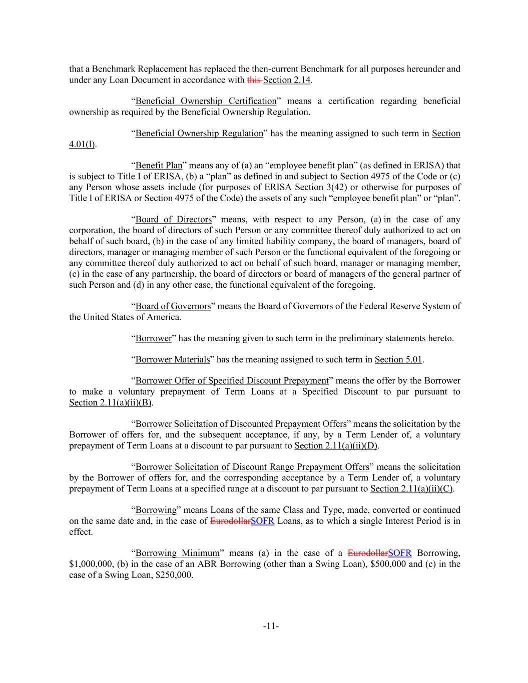 -11- that a Benchmark Replacement has replaced the then-current Benchmark for all purposes hereunder and under any Loan Document in accordance with this Section 2.14. “Beneficial Ownership Certification” means a certification regarding beneficial ownership as required by the Beneficial Ownership Regulation. “Beneficial Ownership Regulation” has the meaning assigned to such term in Section 4.01(l). “Benefit Plan” means any of (a) an “employee benefit plan” (as defined in ERISA) that is subject to Title I of ERISA, (b) a “plan” as defined in and subject to Section 4975 of the Code or (c) any Person whose assets include (for purposes of ERISA Section 3(42) or otherwise for purposes of Title I of ERISA or Section 4975 of the Code) the assets of any such “employee benefit plan” or “plan”. “Board of Directors” means, with respect to any Person, (a) in the case of any corporation, the board of directors of such Person or any committee thereof duly authorized to act on behalf of such board, (b) in the case of any limited liability company, the board of managers, board of directors, manager or managing member of such Person or the functional equivalent of the foregoing or any committee thereof duly authorized to act on behalf of such board, manager or managing member, (c) in the case of any partnership, the board of directors or board of managers of the general partner of such Person and (d) in any other case, the functional equivalent of the foregoing. “Board of Governors” means the Board of Governors of the Federal Reserve System of the United States of America. “Borrower” has the meaning given to such term in the preliminary statements hereto. “Borrower Materials” has the meaning assigned to such term in Section 5.01. “Borrower Offer of Specified Discount Prepayment” means the offer by the Borrower to make a voluntary prepayment of Term Loans at a Specified Discount to par pursuant to Section 2.11(a)(ii)(B). “Borrower Solicitation of Discounted Prepayment Offers” means the solicitation by the Borrower of offers for, and the subsequent acceptance, if any, by a Term Lender of, a voluntary prepayment of Term Loans at a discount to par pursuant to Section 2.11(a)(ii)(D). “Borrower Solicitation of Discount Range Prepayment Offers” means the solicitation by the Borrower of offers for, and the corresponding acceptance by a Term Lender of, a voluntary prepayment of Term Loans at a specified range at a discount to par pursuant to Section 2.11(a)(ii)(C). “Borrowing” means Loans of the same Class and Type, made, converted or continued on the same date and, in the case of EurodollarSOFR Loans, as to which a single Interest Period is in effect. “Borrowing Minimum” means (a) in the case of a EurodollarSOFR Borrowing, $1,000,000, (b) in the case of an ABR Borrowing (other than a Swing Loan), $500,000 and (c) in the case of a Swing Loan, $250,000.