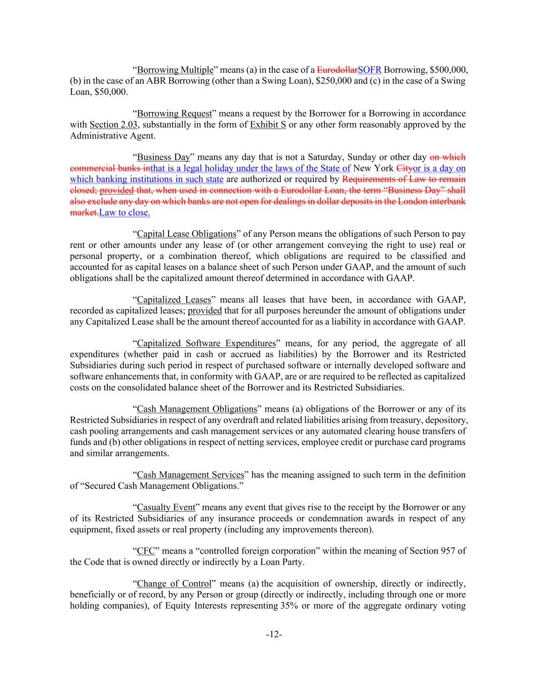 -12- “Borrowing Multiple” means (a) in the case of a EurodollarSOFR Borrowing, $500,000, (b) in the case of an ABR Borrowing (other than a Swing Loan), $250,000 and (c) in the case of a Swing Loan, $50,000. “Borrowing Request” means a request by the Borrower for a Borrowing in accordance with Section 2.03, substantially in the form of Exhibit S or any other form reasonably approved by the Administrative Agent. “Business Day” means any day that is not a Saturday, Sunday or other day on which commercial banks inthat is a legal holiday under the laws of the State of New York Cityor is a day on which banking institutions in such state are authorized or required by Requirements of Law to remain closed; provided that, when used in connection with a Eurodollar Loan, the term “Business Day” shall also exclude any day on which banks are not open for dealings in dollar deposits in the London interbank market.Law to close. “Capital Lease Obligations” of any Person means the obligations of such Person to pay rent or other amounts under any lease of (or other arrangement conveying the right to use) real or personal property, or a combination thereof, which obligations are required to be classified and accounted for as capital leases on a balance sheet of such Person under GAAP, and the amount of such obligations shall be the capitalized amount thereof determined in accordance with GAAP. “Capitalized Leases” means all leases that have been, in accordance with GAAP, recorded as capitalized leases; provided that for all purposes hereunder the amount of obligations under any Capitalized Lease shall be the amount thereof accounted for as a liability in accordance with GAAP. “Capitalized Software Expenditures” means, for any period, the aggregate of all expenditures (whether paid in cash or accrued as liabilities) by the Borrower and its Restricted Subsidiaries during such period in respect of purchased software or internally developed software and software enhancements that, in conformity with GAAP, are or are required to be reflected as capitalized costs on the consolidated balance sheet of the Borrower and its Restricted Subsidiaries. “Cash Management Obligations” means (a) obligations of the Borrower or any of its Restricted Subsidiaries in respect of any overdraft and related liabilities arising from treasury, depository, cash pooling arrangements and cash management services or any automated clearing house transfers of funds and (b) other obligations in respect of netting services, employee credit or purchase card programs and similar arrangements. “Cash Management Services” has the meaning assigned to such term in the definition of “Secured Cash Management Obligations.” “Casualty Event” means any event that gives rise to the receipt by the Borrower or any of its Restricted Subsidiaries of any insurance proceeds or condemnation awards in respect of any equipment, fixed assets or real property (including any improvements thereon). “CFC” means a “controlled foreign corporation” within the meaning of Section 957 of the Code that is owned directly or indirectly by a Loan Party. “Change of Control” means (a) the acquisition of ownership, directly or indirectly, beneficially or of record, by any Person or group (directly or indirectly, including through one or more holding companies), of Equity Interests representing 35% or more of the aggregate ordinary voting
