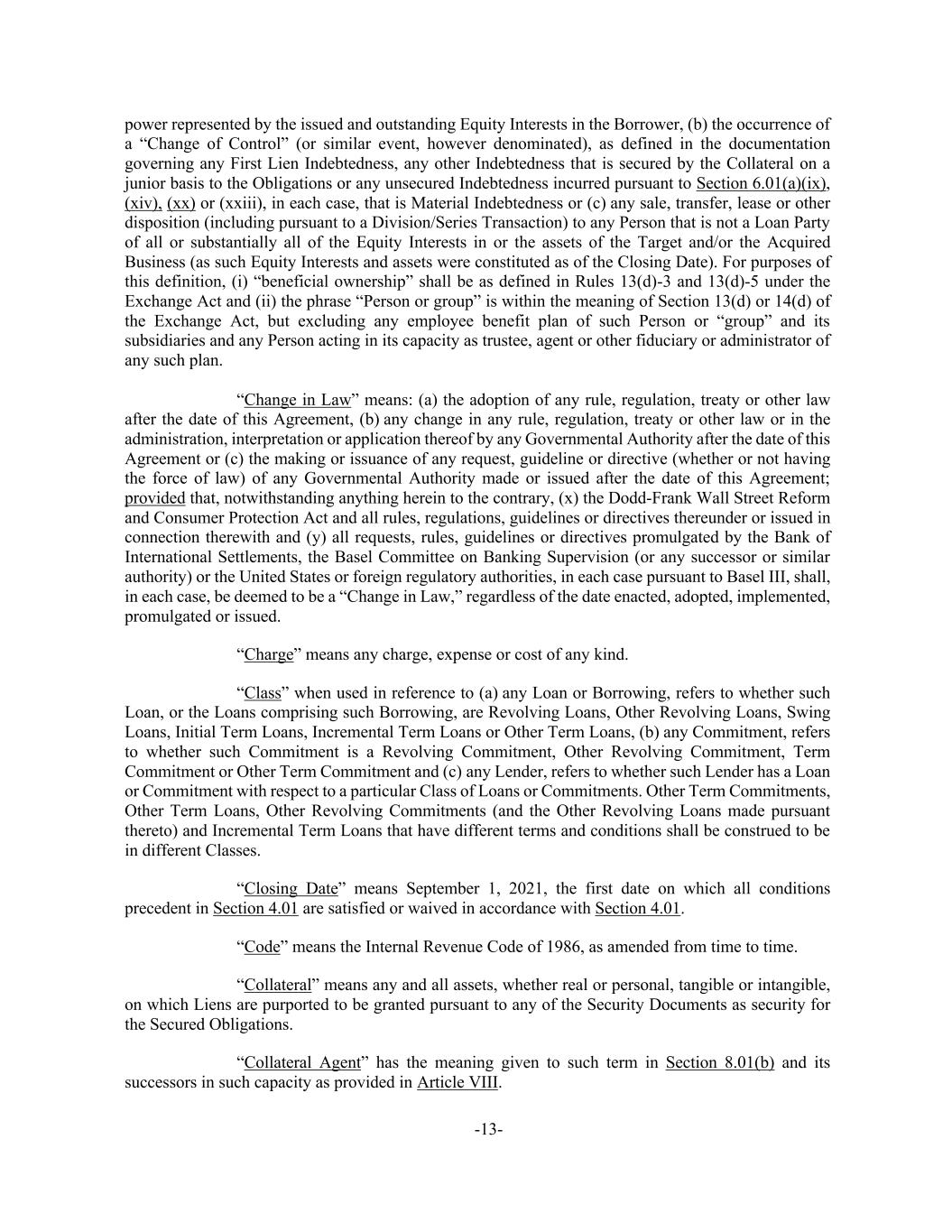 -13- power represented by the issued and outstanding Equity Interests in the Borrower, (b) the occurrence of a “Change of Control” (or similar event, however denominated), as defined in the documentation governing any First Lien Indebtedness, any other Indebtedness that is secured by the Collateral on a junior basis to the Obligations or any unsecured Indebtedness incurred pursuant to Section 6.01(a)(ix), (xiv), (xx) or (xxiii), in each case, that is Material Indebtedness or (c) any sale, transfer, lease or other disposition (including pursuant to a Division/Series Transaction) to any Person that is not a Loan Party of all or substantially all of the Equity Interests in or the assets of the Target and/or the Acquired Business (as such Equity Interests and assets were constituted as of the Closing Date). For purposes of this definition, (i) “beneficial ownership” shall be as defined in Rules 13(d)-3 and 13(d)-5 under the Exchange Act and (ii) the phrase “Person or group” is within the meaning of Section 13(d) or 14(d) of the Exchange Act, but excluding any employee benefit plan of such Person or “group” and its subsidiaries and any Person acting in its capacity as trustee, agent or other fiduciary or administrator of any such plan. “Change in Law” means: (a) the adoption of any rule, regulation, treaty or other law after the date of this Agreement, (b) any change in any rule, regulation, treaty or other law or in the administration, interpretation or application thereof by any Governmental Authority after the date of this Agreement or (c) the making or issuance of any request, guideline or directive (whether or not having the force of law) of any Governmental Authority made or issued after the date of this Agreement; provided that, notwithstanding anything herein to the contrary, (x) the Dodd-Frank Wall Street Reform and Consumer Protection Act and all rules, regulations, guidelines or directives thereunder or issued in connection therewith and (y) all requests, rules, guidelines or directives promulgated by the Bank of International Settlements, the Basel Committee on Banking Supervision (or any successor or similar authority) or the United States or foreign regulatory authorities, in each case pursuant to Basel III, shall, in each case, be deemed to be a “Change in Law,” regardless of the date enacted, adopted, implemented, promulgated or issued. “Charge” means any charge, expense or cost of any kind. “Class” when used in reference to (a) any Loan or Borrowing, refers to whether such Loan, or the Loans comprising such Borrowing, are Revolving Loans, Other Revolving Loans, Swing Loans, Initial Term Loans, Incremental Term Loans or Other Term Loans, (b) any Commitment, refers to whether such Commitment is a Revolving Commitment, Other Revolving Commitment, Term Commitment or Other Term Commitment and (c) any Lender, refers to whether such Lender has a Loan or Commitment with respect to a particular Class of Loans or Commitments. Other Term Commitments, Other Term Loans, Other Revolving Commitments (and the Other Revolving Loans made pursuant thereto) and Incremental Term Loans that have different terms and conditions shall be construed to be in different Classes. “Closing Date” means September 1, 2021, the first date on which all conditions precedent in Section 4.01 are satisfied or waived in accordance with Section 4.01. “Code” means the Internal Revenue Code of 1986, as amended from time to time. “Collateral” means any and all assets, whether real or personal, tangible or intangible, on which Liens are purported to be granted pursuant to any of the Security Documents as security for the Secured Obligations. “Collateral Agent” has the meaning given to such term in Section 8.01(b) and its successors in such capacity as provided in Article VIII.