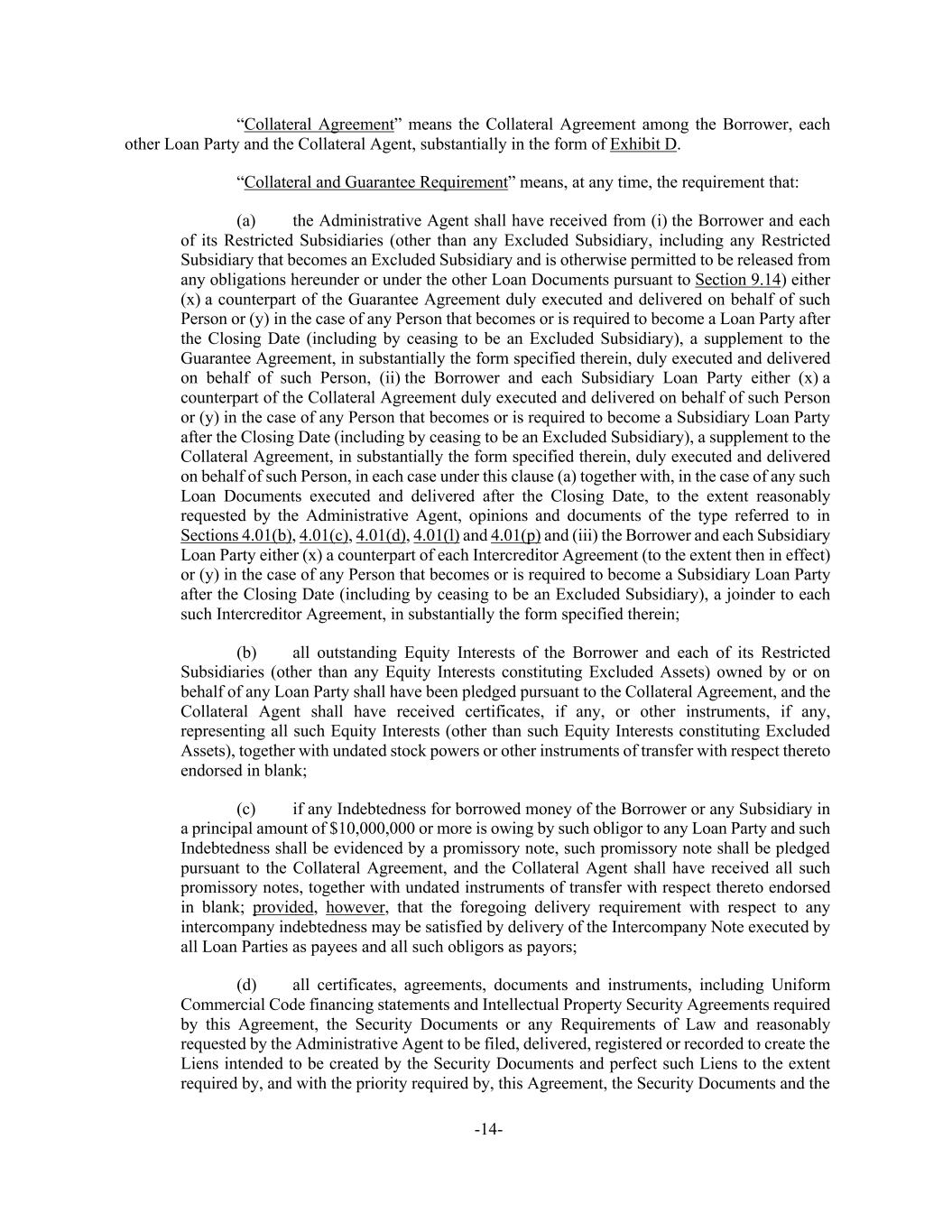 -14- “Collateral Agreement” means the Collateral Agreement among the Borrower, each other Loan Party and the Collateral Agent, substantially in the form of Exhibit D. “Collateral and Guarantee Requirement” means, at any time, the requirement that: (a) the Administrative Agent shall have received from (i) the Borrower and each of its Restricted Subsidiaries (other than any Excluded Subsidiary, including any Restricted Subsidiary that becomes an Excluded Subsidiary and is otherwise permitted to be released from any obligations hereunder or under the other Loan Documents pursuant to Section 9.14) either (x) a counterpart of the Guarantee Agreement duly executed and delivered on behalf of such Person or (y) in the case of any Person that becomes or is required to become a Loan Party after the Closing Date (including by ceasing to be an Excluded Subsidiary), a supplement to the Guarantee Agreement, in substantially the form specified therein, duly executed and delivered on behalf of such Person, (ii) the Borrower and each Subsidiary Loan Party either (x) a counterpart of the Collateral Agreement duly executed and delivered on behalf of such Person or (y) in the case of any Person that becomes or is required to become a Subsidiary Loan Party after the Closing Date (including by ceasing to be an Excluded Subsidiary), a supplement to the Collateral Agreement, in substantially the form specified therein, duly executed and delivered on behalf of such Person, in each case under this clause (a) together with, in the case of any such Loan Documents executed and delivered after the Closing Date, to the extent reasonably requested by the Administrative Agent, opinions and documents of the type referred to in Sections 4.01(b), 4.01(c), 4.01(d), 4.01(l) and 4.01(p) and (iii) the Borrower and each Subsidiary Loan Party either (x) a counterpart of each Intercreditor Agreement (to the extent then in effect) or (y) in the case of any Person that becomes or is required to become a Subsidiary Loan Party after the Closing Date (including by ceasing to be an Excluded Subsidiary), a joinder to each such Intercreditor Agreement, in substantially the form specified therein; (b) all outstanding Equity Interests of the Borrower and each of its Restricted Subsidiaries (other than any Equity Interests constituting Excluded Assets) owned by or on behalf of any Loan Party shall have been pledged pursuant to the Collateral Agreement, and the Collateral Agent shall have received certificates, if any, or other instruments, if any, representing all such Equity Interests (other than such Equity Interests constituting Excluded Assets), together with undated stock powers or other instruments of transfer with respect thereto endorsed in blank; (c) if any Indebtedness for borrowed money of the Borrower or any Subsidiary in a principal amount of $10,000,000 or more is owing by such obligor to any Loan Party and such Indebtedness shall be evidenced by a promissory note, such promissory note shall be pledged pursuant to the Collateral Agreement, and the Collateral Agent shall have received all such promissory notes, together with undated instruments of transfer with respect thereto endorsed in blank; provided, however, that the foregoing delivery requirement with respect to any intercompany indebtedness may be satisfied by delivery of the Intercompany Note executed by all Loan Parties as payees and all such obligors as payors; (d) all certificates, agreements, documents and instruments, including Uniform Commercial Code financing statements and Intellectual Property Security Agreements required by this Agreement, the Security Documents or any Requirements of Law and reasonably requested by the Administrative Agent to be filed, delivered, registered or recorded to create the Liens intended to be created by the Security Documents and perfect such Liens to the extent required by, and with the priority required by, this Agreement, the Security Documents and the