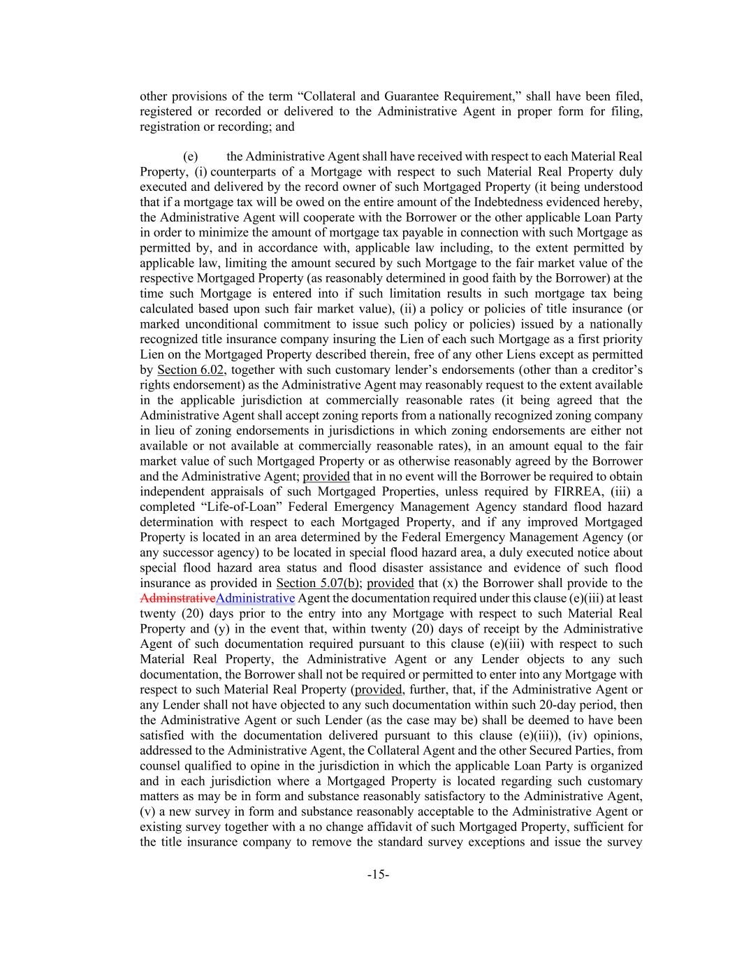 -15- other provisions of the term “Collateral and Guarantee Requirement,” shall have been filed, registered or recorded or delivered to the Administrative Agent in proper form for filing, registration or recording; and (e) the Administrative Agent shall have received with respect to each Material Real Property, (i) counterparts of a Mortgage with respect to such Material Real Property duly executed and delivered by the record owner of such Mortgaged Property (it being understood that if a mortgage tax will be owed on the entire amount of the Indebtedness evidenced hereby, the Administrative Agent will cooperate with the Borrower or the other applicable Loan Party in order to minimize the amount of mortgage tax payable in connection with such Mortgage as permitted by, and in accordance with, applicable law including, to the extent permitted by applicable law, limiting the amount secured by such Mortgage to the fair market value of the respective Mortgaged Property (as reasonably determined in good faith by the Borrower) at the time such Mortgage is entered into if such limitation results in such mortgage tax being calculated based upon such fair market value), (ii) a policy or policies of title insurance (or marked unconditional commitment to issue such policy or policies) issued by a nationally recognized title insurance company insuring the Lien of each such Mortgage as a first priority Lien on the Mortgaged Property described therein, free of any other Liens except as permitted by Section 6.02, together with such customary lender’s endorsements (other than a creditor’s rights endorsement) as the Administrative Agent may reasonably request to the extent available in the applicable jurisdiction at commercially reasonable rates (it being agreed that the Administrative Agent shall accept zoning reports from a nationally recognized zoning company in lieu of zoning endorsements in jurisdictions in which zoning endorsements are either not available or not available at commercially reasonable rates), in an amount equal to the fair market value of such Mortgaged Property or as otherwise reasonably agreed by the Borrower and the Administrative Agent; provided that in no event will the Borrower be required to obtain independent appraisals of such Mortgaged Properties, unless required by FIRREA, (iii) a completed “Life-of-Loan” Federal Emergency Management Agency standard flood hazard determination with respect to each Mortgaged Property, and if any improved Mortgaged Property is located in an area determined by the Federal Emergency Management Agency (or any successor agency) to be located in special flood hazard area, a duly executed notice about special flood hazard area status and flood disaster assistance and evidence of such flood insurance as provided in Section 5.07(b); provided that (x) the Borrower shall provide to the AdminstrativeAdministrative Agent the documentation required under this clause (e)(iii) at least twenty (20) days prior to the entry into any Mortgage with respect to such Material Real Property and (y) in the event that, within twenty (20) days of receipt by the Administrative Agent of such documentation required pursuant to this clause (e)(iii) with respect to such Material Real Property, the Administrative Agent or any Lender objects to any such documentation, the Borrower shall not be required or permitted to enter into any Mortgage with respect to such Material Real Property (provided, further, that, if the Administrative Agent or any Lender shall not have objected to any such documentation within such 20-day period, then the Administrative Agent or such Lender (as the case may be) shall be deemed to have been satisfied with the documentation delivered pursuant to this clause (e)(iii)), (iv) opinions, addressed to the Administrative Agent, the Collateral Agent and the other Secured Parties, from counsel qualified to opine in the jurisdiction in which the applicable Loan Party is organized and in each jurisdiction where a Mortgaged Property is located regarding such customary matters as may be in form and substance reasonably satisfactory to the Administrative Agent, (v) a new survey in form and substance reasonably acceptable to the Administrative Agent or existing survey together with a no change affidavit of such Mortgaged Property, sufficient for the title insurance company to remove the standard survey exceptions and issue the survey