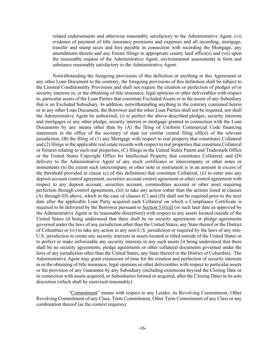 -16- related endorsements and otherwise reasonably satisfactory to the Administrative Agent, (vi) evidence of payment of title insurance premiums and expenses and all recording, mortgage, transfer and stamp taxes and fees payable in connection with recording the Mortgage, any amendments thereto and any fixture filings in appropriate county land office(s) and (vii) upon the reasonable request of the Administrative Agent, environmental assessments in form and substance reasonably satisfactory to the Administrative Agent. Notwithstanding the foregoing provisions of this definition or anything in this Agreement or any other Loan Document to the contrary, the foregoing provisions of this definition shall be subject to the Limited Conditionality Provisions and shall not require the creation or perfection of pledges of or security interests in, or the obtaining of title insurance, legal opinions or other deliverables with respect to, particular assets of the Loan Parties that constitute Excluded Assets or in the assets of any Subsidiary that is an Excluded Subsidiary. In addition, notwithstanding anything to the contrary contained herein or in any other Loan Document, the Borrower and the other Loan Parties shall not be required, nor shall the Administrative Agent be authorized, (i) to perfect the above-described pledges, security interests and mortgages or any other pledge, security interest or mortgage granted in connection with the Loan Documents by any means other than by (A) the filing of Uniform Commercial Code financing statements in the office of the secretary of state (or similar central filing office) of the relevant jurisdiction, (B) the filing of (1) any Mortgage with respect to real property that constitutes Collateral and (2) filings in the applicable real estate records with respect to real properties that constitute Collateral or fixtures relating to such real properties, (C) filings in the United States Patent and Trademark Office or the United States Copyright Office for Intellectual Property that constitutes Collateral, and (D) delivery to the Administrative Agent of any stock certificates or intercompany or other notes or instruments (to the extent such intercompany or other note or instrument is in an amount in excess of the threshold provided in clause (c) of this definition) that constitute Collateral, (ii) to enter into any deposit account control agreement, securities account control agreement or other control agreement with respect to any deposit account, securities account, commodities account or other asset requiring perfection through control agreements, (iii) to take any action (other than the actions listed in clauses (A) through (D) above, which in the case of clauses (C) and (D) shall not be required prior to the next date after the applicable Loan Party acquired such Collateral on which a Compliance Certificate is required to be delivered by the Borrower pursuant to Section 5.01(d) (or such later date as approved by the Administrative Agent in its reasonable discretion)) with respect to any assets located outside of the United States (it being understood that there shall be no security agreements or pledge agreements governed under the laws of any jurisdiction other than the United States, any State thereof or the District of Columbia) or (iv) to take any action in any non-U.S. jurisdiction or required by the laws of any non- U.S. jurisdiction to create any security interests in assets located or titled outside of the United States or to perfect or make enforceable any security interests in any such assets (it being understood that there shall be no security agreements, pledge agreements or other collateral documents governed under the laws of any jurisdiction other than the United States, any State thereof or the District of Columbia). The Administrative Agent may grant extensions of time for the creation and perfection of security interests in or the obtaining of title insurance, legal opinions or other deliverables with respect to particular assets or the provision of any Guarantee by any Subsidiary (including extensions beyond the Closing Date or in connection with assets acquired, or Subsidiaries formed or acquired, after the Closing Date) in its sole discretion (which shall be exercised reasonably). “Commitment” means with respect to any Lender, its Revolving Commitment, Other Revolving Commitment of any Class, Term Commitment, Other Term Commitment of any Class or any combination thereof (as the context requires).