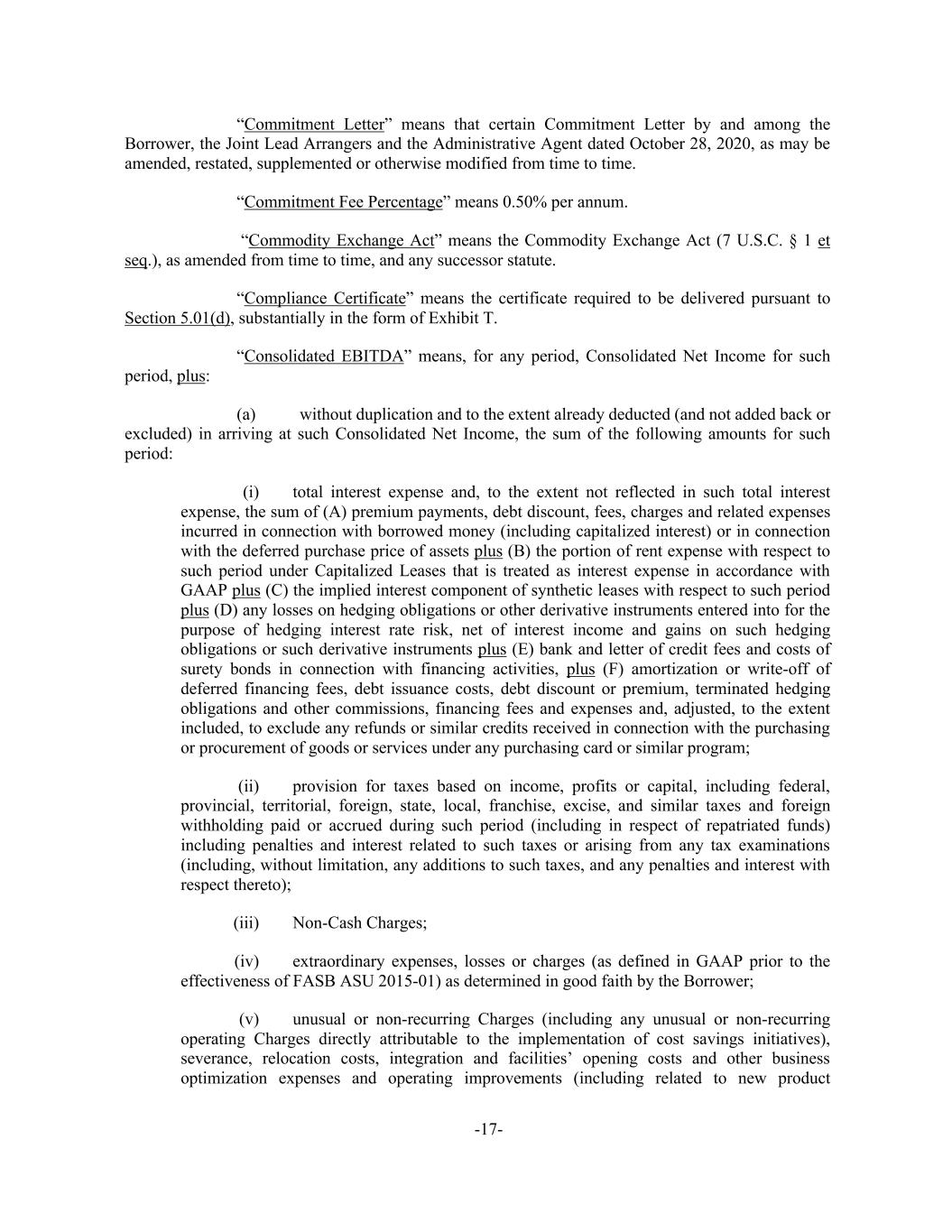 -17- “Commitment Letter” means that certain Commitment Letter by and among the Borrower, the Joint Lead Arrangers and the Administrative Agent dated October 28, 2020, as may be amended, restated, supplemented or otherwise modified from time to time. “Commitment Fee Percentage” means 0.50% per annum. “Commodity Exchange Act” means the Commodity Exchange Act (7 U.S.C. § 1 et seq.), as amended from time to time, and any successor statute. “Compliance Certificate” means the certificate required to be delivered pursuant to Section 5.01(d), substantially in the form of Exhibit T. “Consolidated EBITDA” means, for any period, Consolidated Net Income for such period, plus: (a) without duplication and to the extent already deducted (and not added back or excluded) in arriving at such Consolidated Net Income, the sum of the following amounts for such period: (i) total interest expense and, to the extent not reflected in such total interest expense, the sum of (A) premium payments, debt discount, fees, charges and related expenses incurred in connection with borrowed money (including capitalized interest) or in connection with the deferred purchase price of assets plus (B) the portion of rent expense with respect to such period under Capitalized Leases that is treated as interest expense in accordance with GAAP plus (C) the implied interest component of synthetic leases with respect to such period plus (D) any losses on hedging obligations or other derivative instruments entered into for the purpose of hedging interest rate risk, net of interest income and gains on such hedging obligations or such derivative instruments plus (E) bank and letter of credit fees and costs of surety bonds in connection with financing activities, plus (F) amortization or write-off of deferred financing fees, debt issuance costs, debt discount or premium, terminated hedging obligations and other commissions, financing fees and expenses and, adjusted, to the extent included, to exclude any refunds or similar credits received in connection with the purchasing or procurement of goods or services under any purchasing card or similar program; (ii) provision for taxes based on income, profits or capital, including federal, provincial, territorial, foreign, state, local, franchise, excise, and similar taxes and foreign withholding paid or accrued during such period (including in respect of repatriated funds) including penalties and interest related to such taxes or arising from any tax examinations (including, without limitation, any additions to such taxes, and any penalties and interest with respect thereto); (iii) Non-Cash Charges; (iv) extraordinary expenses, losses or charges (as defined in GAAP prior to the effectiveness of FASB ASU 2015-01) as determined in good faith by the Borrower; (v) unusual or non-recurring Charges (including any unusual or non-recurring operating Charges directly attributable to the implementation of cost savings initiatives), severance, relocation costs, integration and facilities’ opening costs and other business optimization expenses and operating improvements (including related to new product