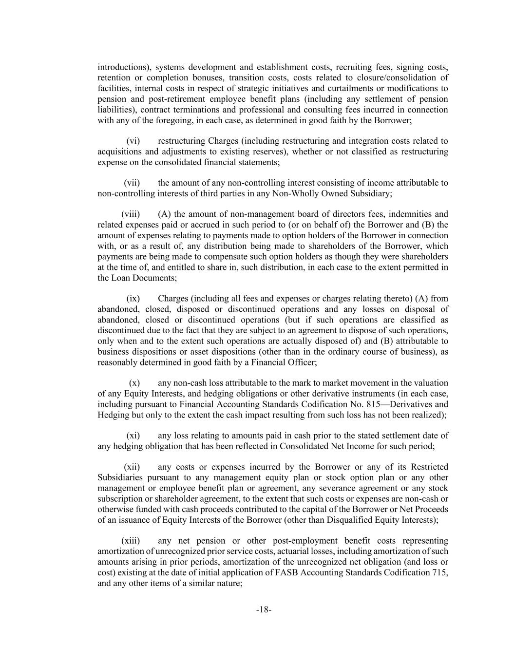 -18- introductions), systems development and establishment costs, recruiting fees, signing costs, retention or completion bonuses, transition costs, costs related to closure/consolidation of facilities, internal costs in respect of strategic initiatives and curtailments or modifications to pension and post-retirement employee benefit plans (including any settlement of pension liabilities), contract terminations and professional and consulting fees incurred in connection with any of the foregoing, in each case, as determined in good faith by the Borrower; (vi) restructuring Charges (including restructuring and integration costs related to acquisitions and adjustments to existing reserves), whether or not classified as restructuring expense on the consolidated financial statements; (vii) the amount of any non-controlling interest consisting of income attributable to non-controlling interests of third parties in any Non-Wholly Owned Subsidiary; (viii) (A) the amount of non-management board of directors fees, indemnities and related expenses paid or accrued in such period to (or on behalf of) the Borrower and (B) the amount of expenses relating to payments made to option holders of the Borrower in connection with, or as a result of, any distribution being made to shareholders of the Borrower, which payments are being made to compensate such option holders as though they were shareholders at the time of, and entitled to share in, such distribution, in each case to the extent permitted in the Loan Documents; (ix) Charges (including all fees and expenses or charges relating thereto) (A) from abandoned, closed, disposed or discontinued operations and any losses on disposal of abandoned, closed or discontinued operations (but if such operations are classified as discontinued due to the fact that they are subject to an agreement to dispose of such operations, only when and to the extent such operations are actually disposed of) and (B) attributable to business dispositions or asset dispositions (other than in the ordinary course of business), as reasonably determined in good faith by a Financial Officer; (x) any non-cash loss attributable to the mark to market movement in the valuation of any Equity Interests, and hedging obligations or other derivative instruments (in each case, including pursuant to Financial Accounting Standards Codification No. 815—Derivatives and Hedging but only to the extent the cash impact resulting from such loss has not been realized); (xi) any loss relating to amounts paid in cash prior to the stated settlement date of any hedging obligation that has been reflected in Consolidated Net Income for such period; (xii) any costs or expenses incurred by the Borrower or any of its Restricted Subsidiaries pursuant to any management equity plan or stock option plan or any other management or employee benefit plan or agreement, any severance agreement or any stock subscription or shareholder agreement, to the extent that such costs or expenses are non-cash or otherwise funded with cash proceeds contributed to the capital of the Borrower or Net Proceeds of an issuance of Equity Interests of the Borrower (other than Disqualified Equity Interests); (xiii) any net pension or other post-employment benefit costs representing amortization of unrecognized prior service costs, actuarial losses, including amortization of such amounts arising in prior periods, amortization of the unrecognized net obligation (and loss or cost) existing at the date of initial application of FASB Accounting Standards Codification 715, and any other items of a similar nature;