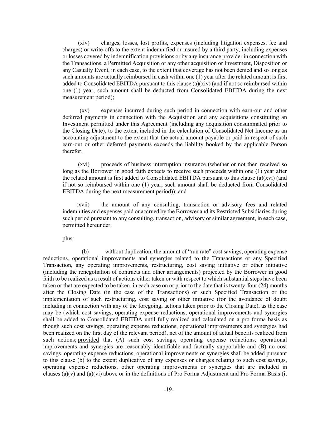 -19- (xiv) charges, losses, lost profits, expenses (including litigation expenses, fee and charges) or write-offs to the extent indemnified or insured by a third party, including expenses or losses covered by indemnification provisions or by any insurance provider in connection with the Transactions, a Permitted Acquisition or any other acquisition or Investment, Disposition or any Casualty Event, in each case, to the extent that coverage has not been denied and so long as such amounts are actually reimbursed in cash within one (1) year after the related amount is first added to Consolidated EBITDA pursuant to this clause (a)(xiv) (and if not so reimbursed within one (1) year, such amount shall be deducted from Consolidated EBITDA during the next measurement period); (xv) expenses incurred during such period in connection with earn-out and other deferred payments in connection with the Acquisition and any acquisitions constituting an Investment permitted under this Agreement (including any acquisition consummated prior to the Closing Date), to the extent included in the calculation of Consolidated Net Income as an accounting adjustment to the extent that the actual amount payable or paid in respect of such earn-out or other deferred payments exceeds the liability booked by the applicable Person therefor; (xvi) proceeds of business interruption insurance (whether or not then received so long as the Borrower in good faith expects to receive such proceeds within one (1) year after the related amount is first added to Consolidated EBITDA pursuant to this clause (a)(xvi) (and if not so reimbursed within one (1) year, such amount shall be deducted from Consolidated EBITDA during the next measurement period)); and (xvii) the amount of any consulting, transaction or advisory fees and related indemnities and expenses paid or accrued by the Borrower and its Restricted Subsidiaries during such period pursuant to any consulting, transaction, advisory or similar agreement, in each case, permitted hereunder; plus: (b) without duplication, the amount of “run rate” cost savings, operating expense reductions, operational improvements and synergies related to the Transactions or any Specified Transaction, any operating improvements, restructuring, cost saving initiative or other initiative (including the renegotiation of contracts and other arrangements) projected by the Borrower in good faith to be realized as a result of actions either taken or with respect to which substantial steps have been taken or that are expected to be taken, in each case on or prior to the date that is twenty-four (24) months after the Closing Date (in the case of the Transactions) or such Specified Transaction or the implementation of such restructuring, cost saving or other initiative (for the avoidance of doubt including in connection with any of the foregoing, actions taken prior to the Closing Date), as the case may be (which cost savings, operating expense reductions, operational improvements and synergies shall be added to Consolidated EBITDA until fully realized and calculated on a pro forma basis as though such cost savings, operating expense reductions, operational improvements and synergies had been realized on the first day of the relevant period), net of the amount of actual benefits realized from such actions; provided that (A) such cost savings, operating expense reductions, operational improvements and synergies are reasonably identifiable and factually supportable and (B) no cost savings, operating expense reductions, operational improvements or synergies shall be added pursuant to this clause (b) to the extent duplicative of any expenses or charges relating to such cost savings, operating expense reductions, other operating improvements or synergies that are included in clauses (a)(v) and (a)(vi) above or in the definitions of Pro Forma Adjustment and Pro Forma Basis (it