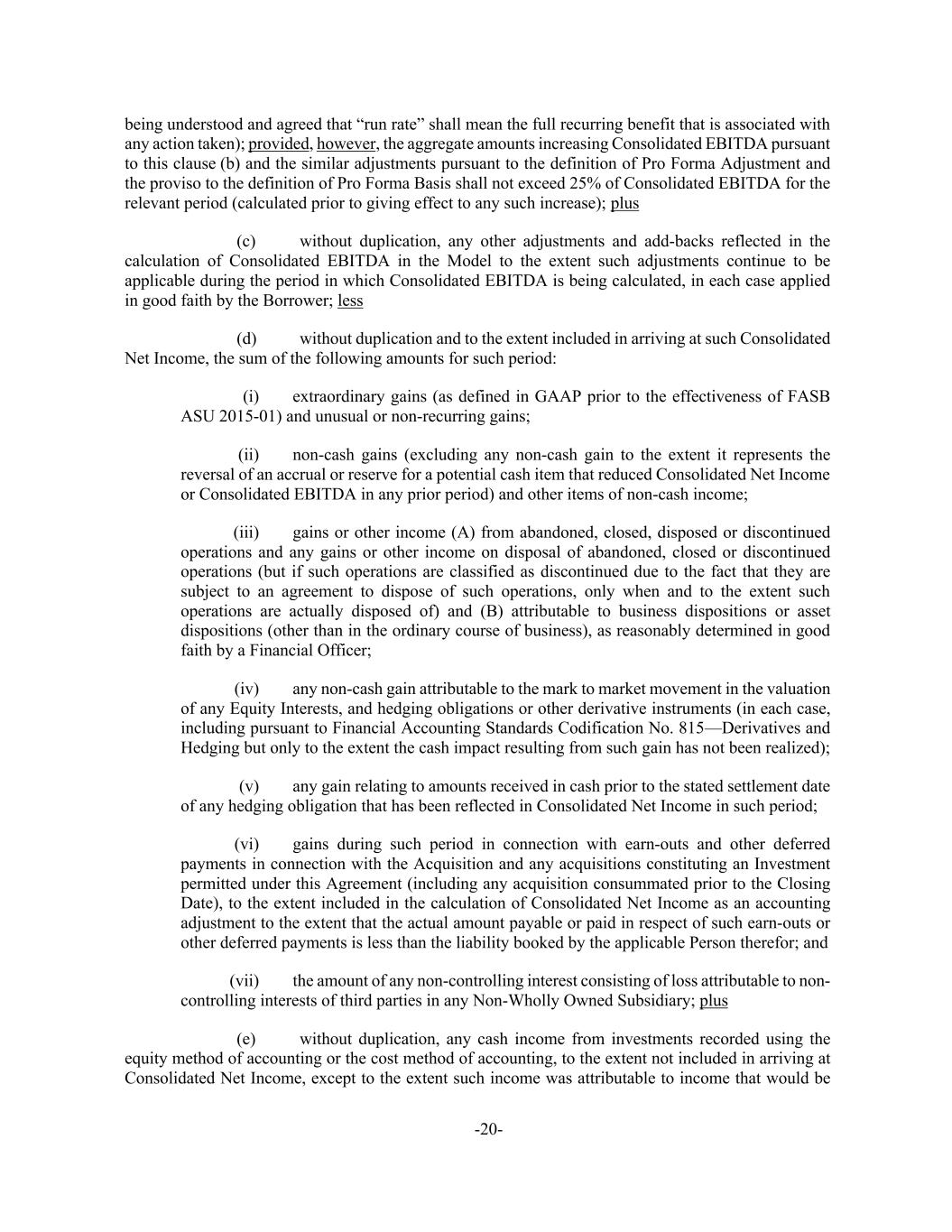 -20- being understood and agreed that “run rate” shall mean the full recurring benefit that is associated with any action taken); provided, however, the aggregate amounts increasing Consolidated EBITDA pursuant to this clause (b) and the similar adjustments pursuant to the definition of Pro Forma Adjustment and the proviso to the definition of Pro Forma Basis shall not exceed 25% of Consolidated EBITDA for the relevant period (calculated prior to giving effect to any such increase); plus (c) without duplication, any other adjustments and add-backs reflected in the calculation of Consolidated EBITDA in the Model to the extent such adjustments continue to be applicable during the period in which Consolidated EBITDA is being calculated, in each case applied in good faith by the Borrower; less (d) without duplication and to the extent included in arriving at such Consolidated Net Income, the sum of the following amounts for such period: (i) extraordinary gains (as defined in GAAP prior to the effectiveness of FASB ASU 2015-01) and unusual or non-recurring gains; (ii) non-cash gains (excluding any non-cash gain to the extent it represents the reversal of an accrual or reserve for a potential cash item that reduced Consolidated Net Income or Consolidated EBITDA in any prior period) and other items of non-cash income; (iii) gains or other income (A) from abandoned, closed, disposed or discontinued operations and any gains or other income on disposal of abandoned, closed or discontinued operations (but if such operations are classified as discontinued due to the fact that they are subject to an agreement to dispose of such operations, only when and to the extent such operations are actually disposed of) and (B) attributable to business dispositions or asset dispositions (other than in the ordinary course of business), as reasonably determined in good faith by a Financial Officer; (iv) any non-cash gain attributable to the mark to market movement in the valuation of any Equity Interests, and hedging obligations or other derivative instruments (in each case, including pursuant to Financial Accounting Standards Codification No. 815—Derivatives and Hedging but only to the extent the cash impact resulting from such gain has not been realized); (v) any gain relating to amounts received in cash prior to the stated settlement date of any hedging obligation that has been reflected in Consolidated Net Income in such period; (vi) gains during such period in connection with earn-outs and other deferred payments in connection with the Acquisition and any acquisitions constituting an Investment permitted under this Agreement (including any acquisition consummated prior to the Closing Date), to the extent included in the calculation of Consolidated Net Income as an accounting adjustment to the extent that the actual amount payable or paid in respect of such earn-outs or other deferred payments is less than the liability booked by the applicable Person therefor; and (vii) the amount of any non-controlling interest consisting of loss attributable to non- controlling interests of third parties in any Non-Wholly Owned Subsidiary; plus (e) without duplication, any cash income from investments recorded using the equity method of accounting or the cost method of accounting, to the extent not included in arriving at Consolidated Net Income, except to the extent such income was attributable to income that would be