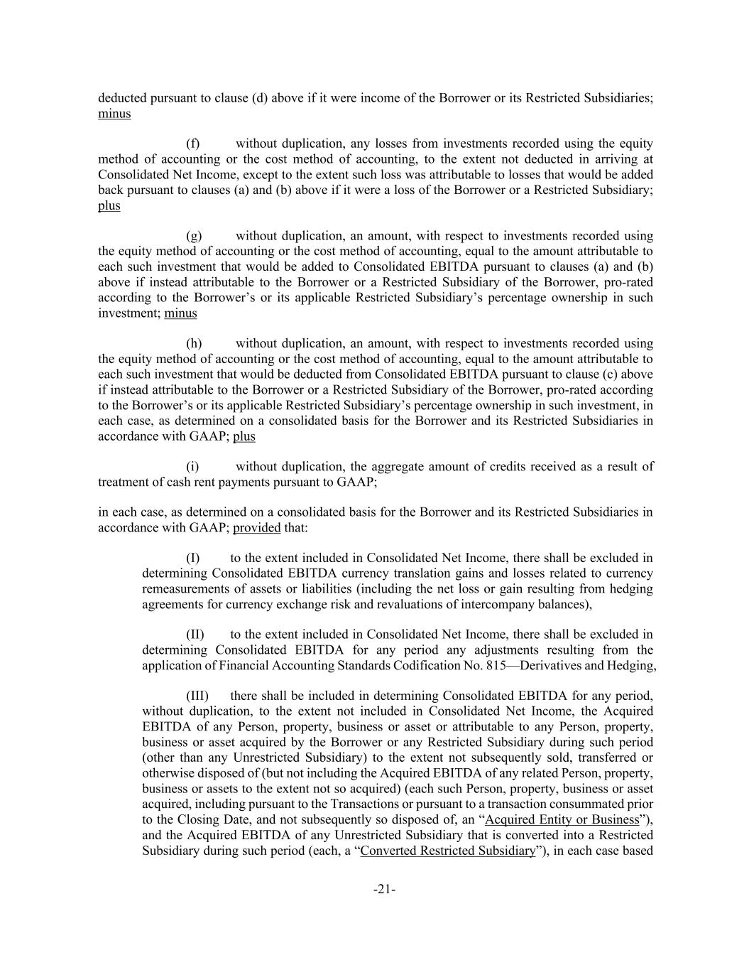 -21- deducted pursuant to clause (d) above if it were income of the Borrower or its Restricted Subsidiaries; minus (f) without duplication, any losses from investments recorded using the equity method of accounting or the cost method of accounting, to the extent not deducted in arriving at Consolidated Net Income, except to the extent such loss was attributable to losses that would be added back pursuant to clauses (a) and (b) above if it were a loss of the Borrower or a Restricted Subsidiary; plus (g) without duplication, an amount, with respect to investments recorded using the equity method of accounting or the cost method of accounting, equal to the amount attributable to each such investment that would be added to Consolidated EBITDA pursuant to clauses (a) and (b) above if instead attributable to the Borrower or a Restricted Subsidiary of the Borrower, pro-rated according to the Borrower’s or its applicable Restricted Subsidiary’s percentage ownership in such investment; minus (h) without duplication, an amount, with respect to investments recorded using the equity method of accounting or the cost method of accounting, equal to the amount attributable to each such investment that would be deducted from Consolidated EBITDA pursuant to clause (c) above if instead attributable to the Borrower or a Restricted Subsidiary of the Borrower, pro-rated according to the Borrower’s or its applicable Restricted Subsidiary’s percentage ownership in such investment, in each case, as determined on a consolidated basis for the Borrower and its Restricted Subsidiaries in accordance with GAAP; plus (i) without duplication, the aggregate amount of credits received as a result of treatment of cash rent payments pursuant to GAAP; in each case, as determined on a consolidated basis for the Borrower and its Restricted Subsidiaries in accordance with GAAP; provided that: (I) to the extent included in Consolidated Net Income, there shall be excluded in determining Consolidated EBITDA currency translation gains and losses related to currency remeasurements of assets or liabilities (including the net loss or gain resulting from hedging agreements for currency exchange risk and revaluations of intercompany balances), (II) to the extent included in Consolidated Net Income, there shall be excluded in determining Consolidated EBITDA for any period any adjustments resulting from the application of Financial Accounting Standards Codification No. 815—Derivatives and Hedging, (III) there shall be included in determining Consolidated EBITDA for any period, without duplication, to the extent not included in Consolidated Net Income, the Acquired EBITDA of any Person, property, business or asset or attributable to any Person, property, business or asset acquired by the Borrower or any Restricted Subsidiary during such period (other than any Unrestricted Subsidiary) to the extent not subsequently sold, transferred or otherwise disposed of (but not including the Acquired EBITDA of any related Person, property, business or assets to the extent not so acquired) (each such Person, property, business or asset acquired, including pursuant to the Transactions or pursuant to a transaction consummated prior to the Closing Date, and not subsequently so disposed of, an “Acquired Entity or Business”), and the Acquired EBITDA of any Unrestricted Subsidiary that is converted into a Restricted Subsidiary during such period (each, a “Converted Restricted Subsidiary”), in each case based