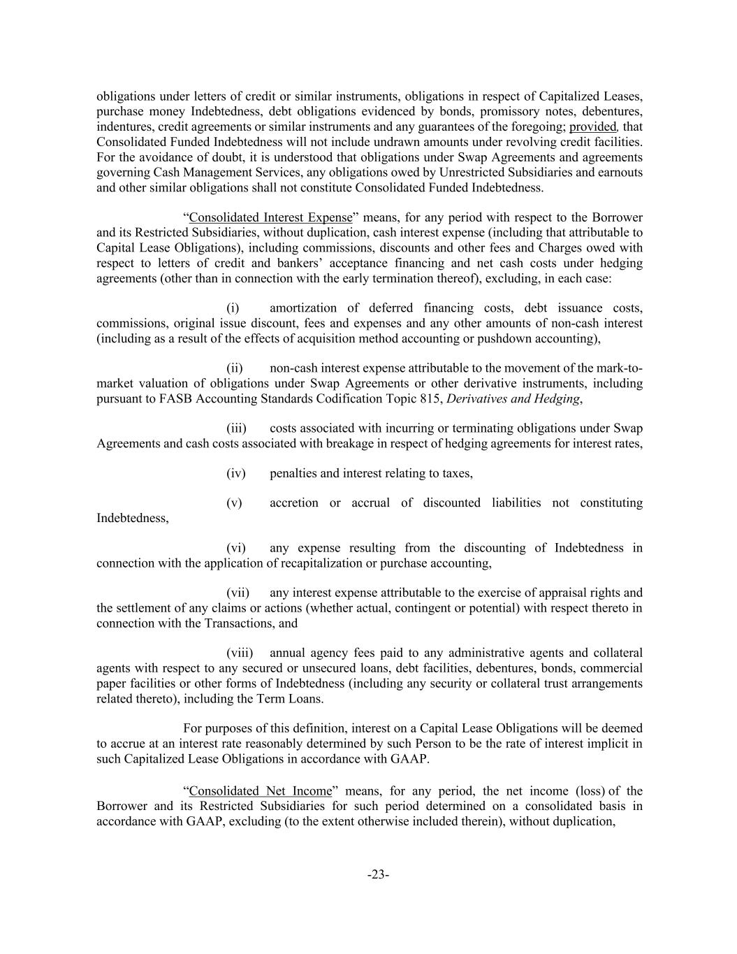 -23- obligations under letters of credit or similar instruments, obligations in respect of Capitalized Leases, purchase money Indebtedness, debt obligations evidenced by bonds, promissory notes, debentures, indentures, credit agreements or similar instruments and any guarantees of the foregoing; provided, that Consolidated Funded Indebtedness will not include undrawn amounts under revolving credit facilities. For the avoidance of doubt, it is understood that obligations under Swap Agreements and agreements governing Cash Management Services, any obligations owed by Unrestricted Subsidiaries and earnouts and other similar obligations shall not constitute Consolidated Funded Indebtedness. “Consolidated Interest Expense” means, for any period with respect to the Borrower and its Restricted Subsidiaries, without duplication, cash interest expense (including that attributable to Capital Lease Obligations), including commissions, discounts and other fees and Charges owed with respect to letters of credit and bankers’ acceptance financing and net cash costs under hedging agreements (other than in connection with the early termination thereof), excluding, in each case: (i) amortization of deferred financing costs, debt issuance costs, commissions, original issue discount, fees and expenses and any other amounts of non-cash interest (including as a result of the effects of acquisition method accounting or pushdown accounting), (ii) non-cash interest expense attributable to the movement of the mark-to- market valuation of obligations under Swap Agreements or other derivative instruments, including pursuant to FASB Accounting Standards Codification Topic 815, Derivatives and Hedging, (iii) costs associated with incurring or terminating obligations under Swap Agreements and cash costs associated with breakage in respect of hedging agreements for interest rates, (iv) penalties and interest relating to taxes, (v) accretion or accrual of discounted liabilities not constituting Indebtedness, (vi) any expense resulting from the discounting of Indebtedness in connection with the application of recapitalization or purchase accounting, (vii) any interest expense attributable to the exercise of appraisal rights and the settlement of any claims or actions (whether actual, contingent or potential) with respect thereto in connection with the Transactions, and (viii) annual agency fees paid to any administrative agents and collateral agents with respect to any secured or unsecured loans, debt facilities, debentures, bonds, commercial paper facilities or other forms of Indebtedness (including any security or collateral trust arrangements related thereto), including the Term Loans. For purposes of this definition, interest on a Capital Lease Obligations will be deemed to accrue at an interest rate reasonably determined by such Person to be the rate of interest implicit in such Capitalized Lease Obligations in accordance with GAAP. “Consolidated Net Income” means, for any period, the net income (loss) of the Borrower and its Restricted Subsidiaries for such period determined on a consolidated basis in accordance with GAAP, excluding (to the extent otherwise included therein), without duplication,