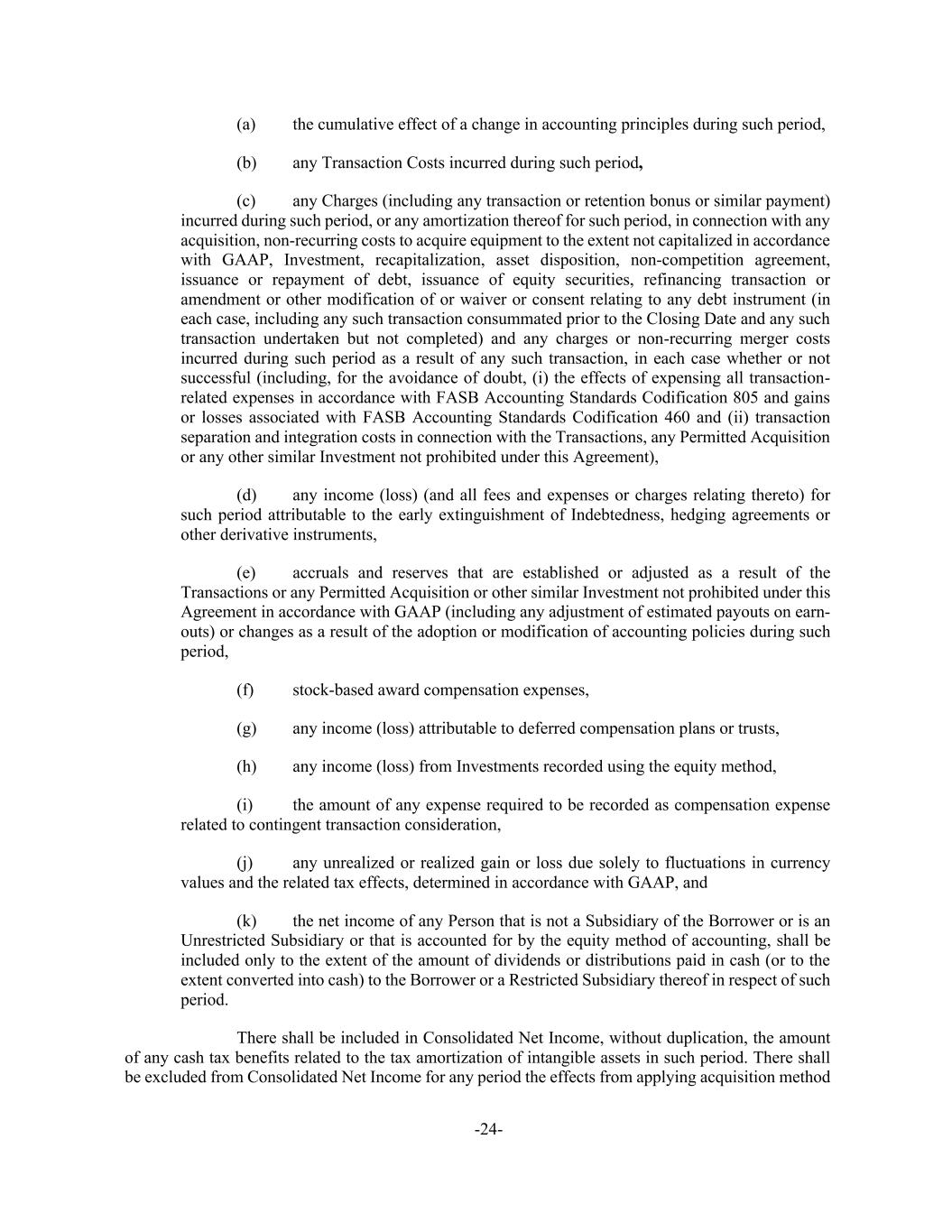 -24- (a) the cumulative effect of a change in accounting principles during such period, (b) any Transaction Costs incurred during such period, (c) any Charges (including any transaction or retention bonus or similar payment) incurred during such period, or any amortization thereof for such period, in connection with any acquisition, non-recurring costs to acquire equipment to the extent not capitalized in accordance with GAAP, Investment, recapitalization, asset disposition, non-competition agreement, issuance or repayment of debt, issuance of equity securities, refinancing transaction or amendment or other modification of or waiver or consent relating to any debt instrument (in each case, including any such transaction consummated prior to the Closing Date and any such transaction undertaken but not completed) and any charges or non-recurring merger costs incurred during such period as a result of any such transaction, in each case whether or not successful (including, for the avoidance of doubt, (i) the effects of expensing all transaction- related expenses in accordance with FASB Accounting Standards Codification 805 and gains or losses associated with FASB Accounting Standards Codification 460 and (ii) transaction separation and integration costs in connection with the Transactions, any Permitted Acquisition or any other similar Investment not prohibited under this Agreement), (d) any income (loss) (and all fees and expenses or charges relating thereto) for such period attributable to the early extinguishment of Indebtedness, hedging agreements or other derivative instruments, (e) accruals and reserves that are established or adjusted as a result of the Transactions or any Permitted Acquisition or other similar Investment not prohibited under this Agreement in accordance with GAAP (including any adjustment of estimated payouts on earn- outs) or changes as a result of the adoption or modification of accounting policies during such period, (f) stock-based award compensation expenses, (g) any income (loss) attributable to deferred compensation plans or trusts, (h) any income (loss) from Investments recorded using the equity method, (i) the amount of any expense required to be recorded as compensation expense related to contingent transaction consideration, (j) any unrealized or realized gain or loss due solely to fluctuations in currency values and the related tax effects, determined in accordance with GAAP, and (k) the net income of any Person that is not a Subsidiary of the Borrower or is an Unrestricted Subsidiary or that is accounted for by the equity method of accounting, shall be included only to the extent of the amount of dividends or distributions paid in cash (or to the extent converted into cash) to the Borrower or a Restricted Subsidiary thereof in respect of such period. There shall be included in Consolidated Net Income, without duplication, the amount of any cash tax benefits related to the tax amortization of intangible assets in such period. There shall be excluded from Consolidated Net Income for any period the effects from applying acquisition method