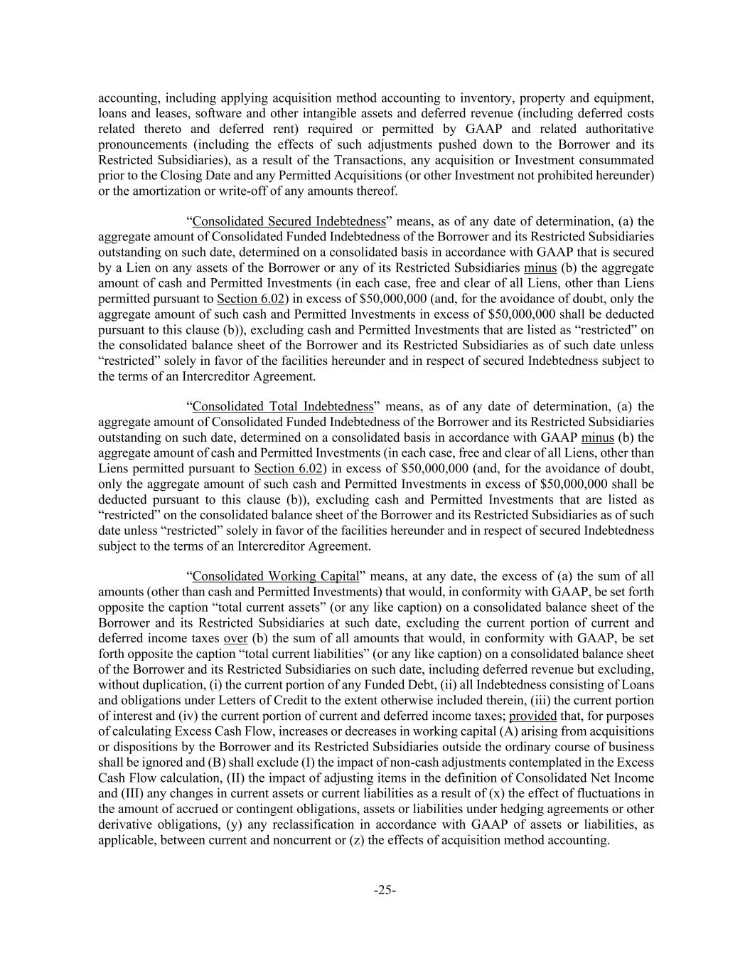 -25- accounting, including applying acquisition method accounting to inventory, property and equipment, loans and leases, software and other intangible assets and deferred revenue (including deferred costs related thereto and deferred rent) required or permitted by GAAP and related authoritative pronouncements (including the effects of such adjustments pushed down to the Borrower and its Restricted Subsidiaries), as a result of the Transactions, any acquisition or Investment consummated prior to the Closing Date and any Permitted Acquisitions (or other Investment not prohibited hereunder) or the amortization or write-off of any amounts thereof. “Consolidated Secured Indebtedness” means, as of any date of determination, (a) the aggregate amount of Consolidated Funded Indebtedness of the Borrower and its Restricted Subsidiaries outstanding on such date, determined on a consolidated basis in accordance with GAAP that is secured by a Lien on any assets of the Borrower or any of its Restricted Subsidiaries minus (b) the aggregate amount of cash and Permitted Investments (in each case, free and clear of all Liens, other than Liens permitted pursuant to Section 6.02) in excess of $50,000,000 (and, for the avoidance of doubt, only the aggregate amount of such cash and Permitted Investments in excess of $50,000,000 shall be deducted pursuant to this clause (b)), excluding cash and Permitted Investments that are listed as “restricted” on the consolidated balance sheet of the Borrower and its Restricted Subsidiaries as of such date unless “restricted” solely in favor of the facilities hereunder and in respect of secured Indebtedness subject to the terms of an Intercreditor Agreement. “Consolidated Total Indebtedness” means, as of any date of determination, (a) the aggregate amount of Consolidated Funded Indebtedness of the Borrower and its Restricted Subsidiaries outstanding on such date, determined on a consolidated basis in accordance with GAAP minus (b) the aggregate amount of cash and Permitted Investments (in each case, free and clear of all Liens, other than Liens permitted pursuant to Section 6.02) in excess of $50,000,000 (and, for the avoidance of doubt, only the aggregate amount of such cash and Permitted Investments in excess of $50,000,000 shall be deducted pursuant to this clause (b)), excluding cash and Permitted Investments that are listed as “restricted” on the consolidated balance sheet of the Borrower and its Restricted Subsidiaries as of such date unless “restricted” solely in favor of the facilities hereunder and in respect of secured Indebtedness subject to the terms of an Intercreditor Agreement. “Consolidated Working Capital” means, at any date, the excess of (a) the sum of all amounts (other than cash and Permitted Investments) that would, in conformity with GAAP, be set forth opposite the caption “total current assets” (or any like caption) on a consolidated balance sheet of the Borrower and its Restricted Subsidiaries at such date, excluding the current portion of current and deferred income taxes over (b) the sum of all amounts that would, in conformity with GAAP, be set forth opposite the caption “total current liabilities” (or any like caption) on a consolidated balance sheet of the Borrower and its Restricted Subsidiaries on such date, including deferred revenue but excluding, without duplication, (i) the current portion of any Funded Debt, (ii) all Indebtedness consisting of Loans and obligations under Letters of Credit to the extent otherwise included therein, (iii) the current portion of interest and (iv) the current portion of current and deferred income taxes; provided that, for purposes of calculating Excess Cash Flow, increases or decreases in working capital (A) arising from acquisitions or dispositions by the Borrower and its Restricted Subsidiaries outside the ordinary course of business shall be ignored and (B) shall exclude (I) the impact of non-cash adjustments contemplated in the Excess Cash Flow calculation, (II) the impact of adjusting items in the definition of Consolidated Net Income and (III) any changes in current assets or current liabilities as a result of (x) the effect of fluctuations in the amount of accrued or contingent obligations, assets or liabilities under hedging agreements or other derivative obligations, (y) any reclassification in accordance with GAAP of assets or liabilities, as applicable, between current and noncurrent or (z) the effects of acquisition method accounting.